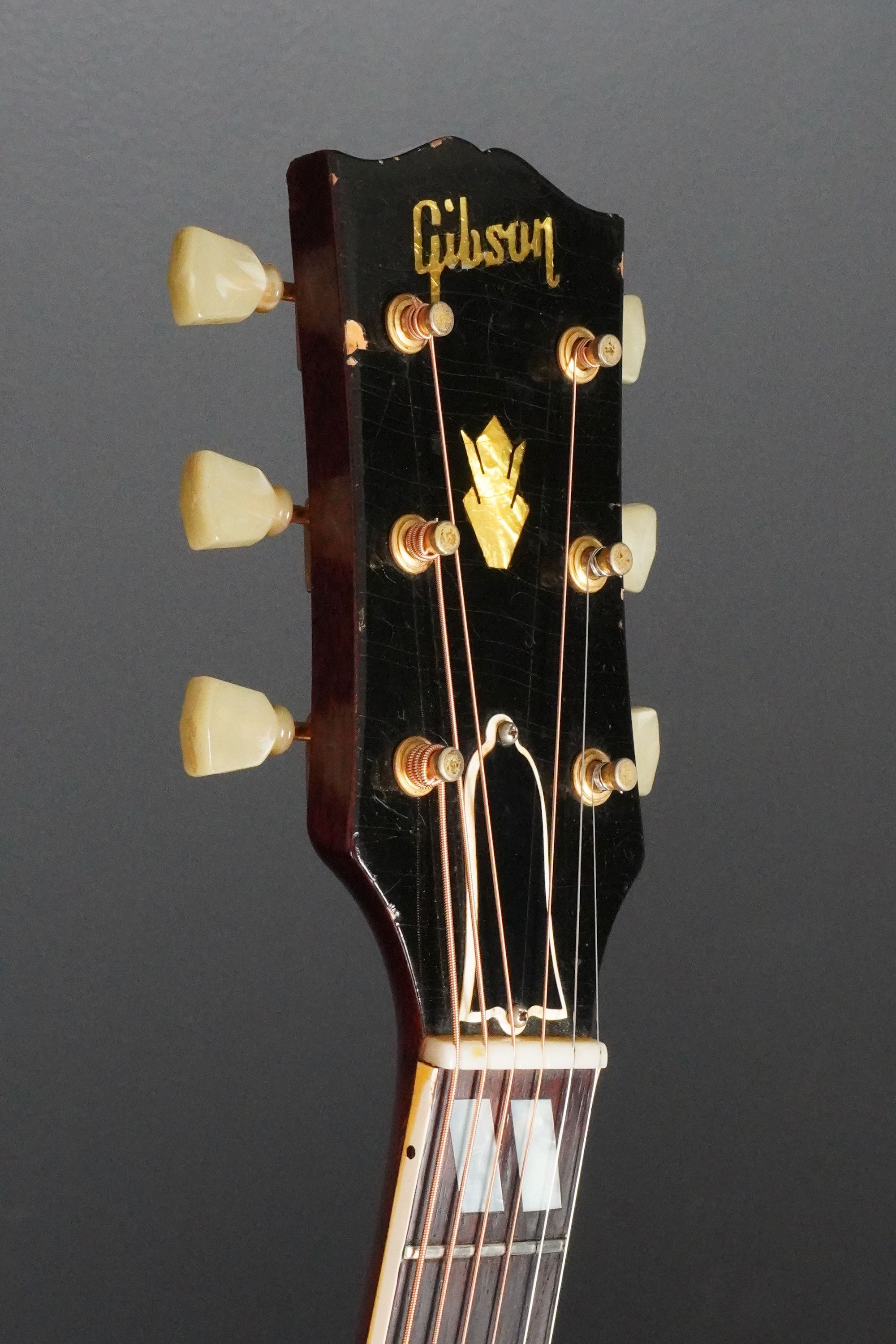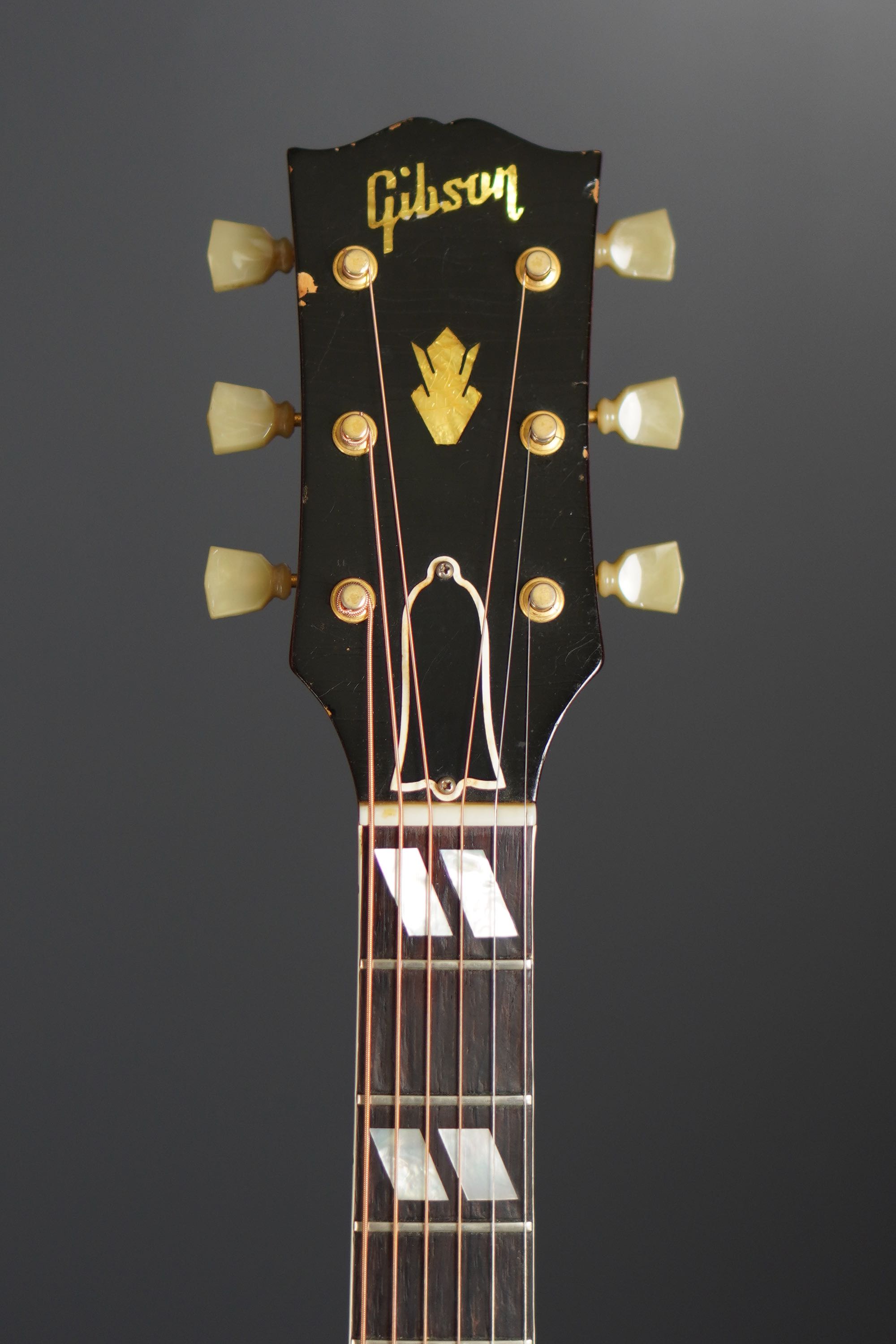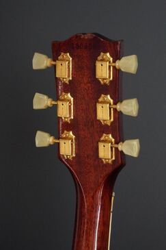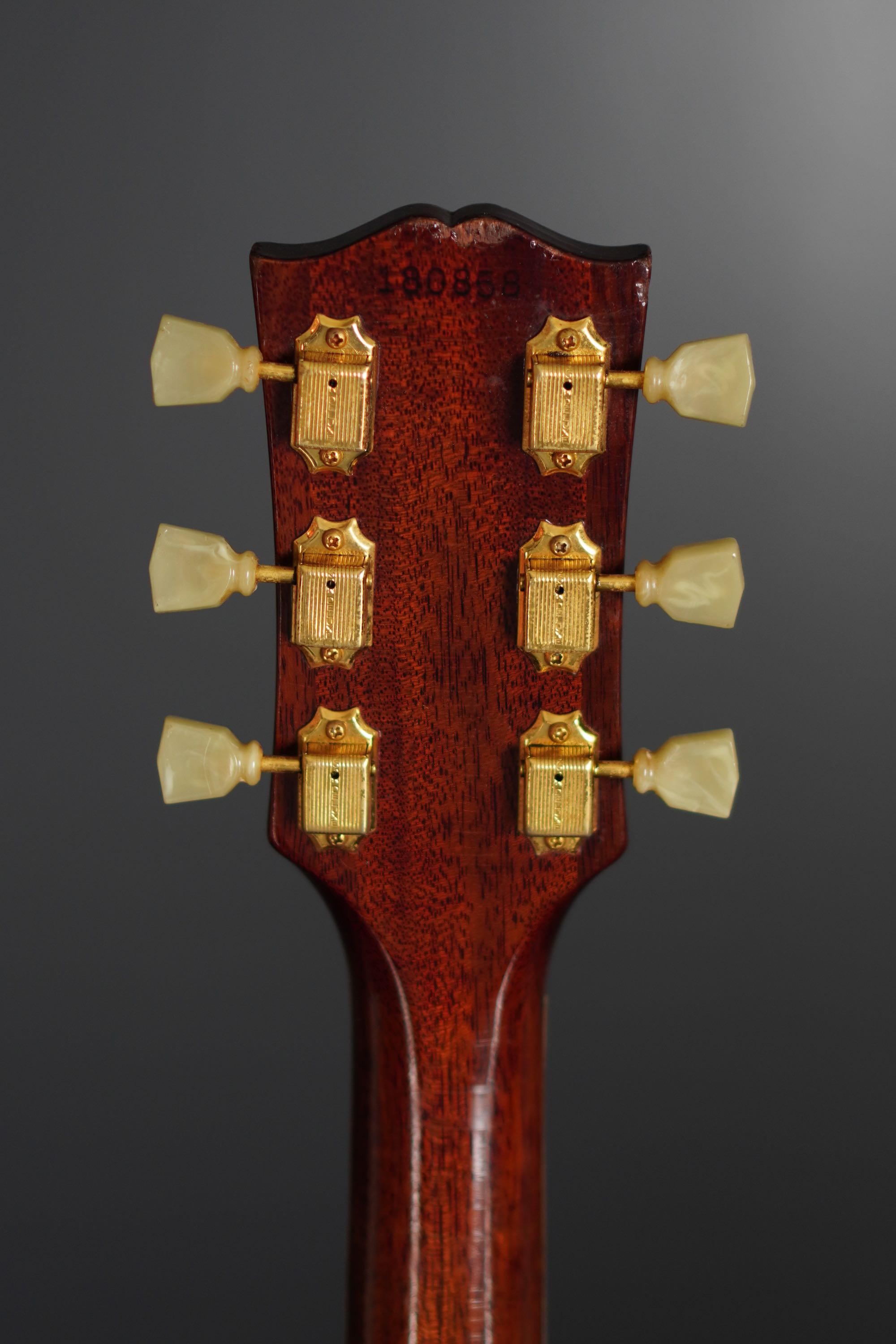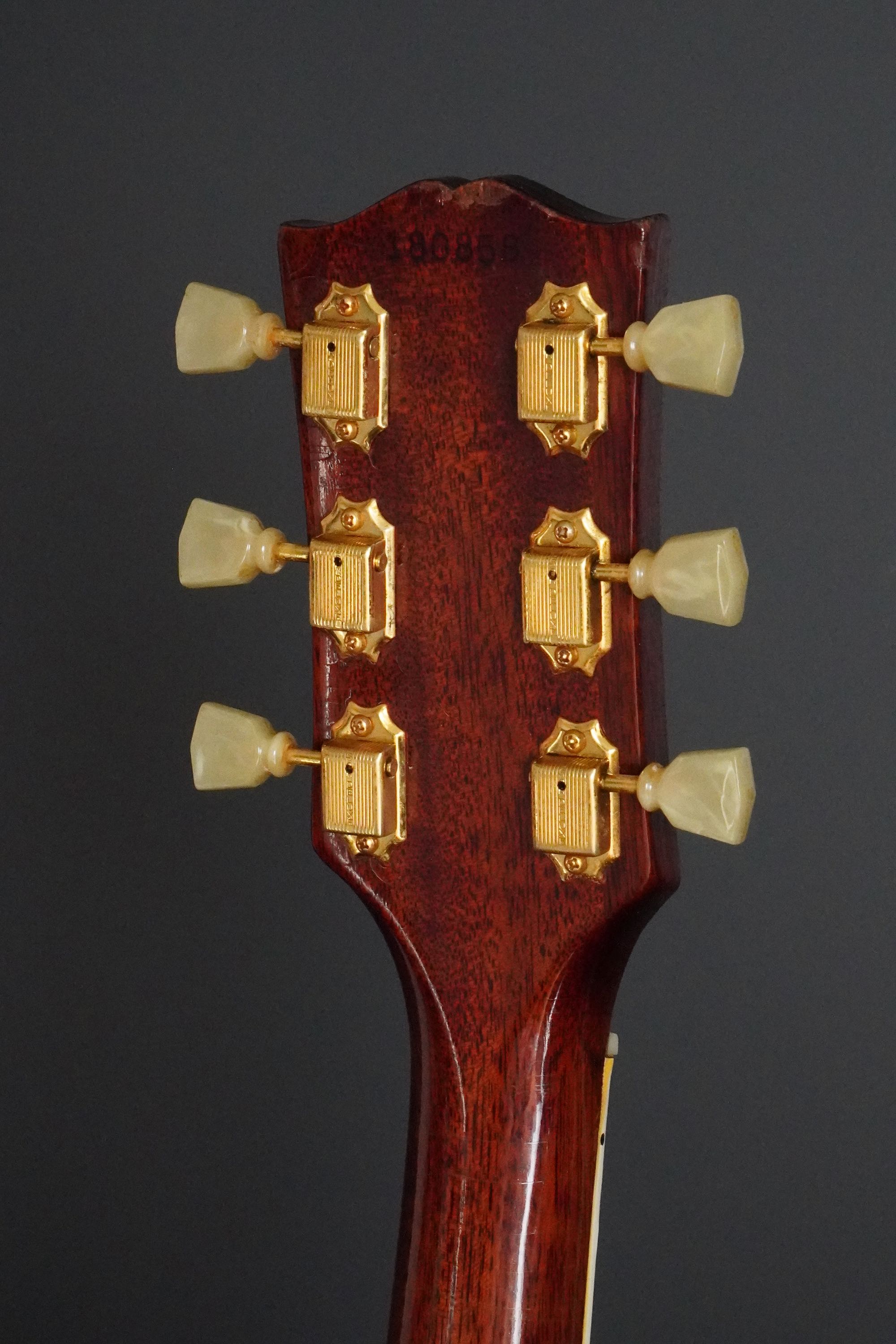 ギブソンらしい黒いヘッドトップにはマザーオブパールのブランドロゴとクラウンインレイ、まだシングルラインでゴールドのクルーソンチューナーが搭載され、シンプルながらも高級感有るヘッドのデザイン、赤黒い上質なハカランダ指板にはホワイトパールのダブルパラレログラムインレイもよく映え、上品で質感の高い仕様になっております。