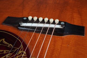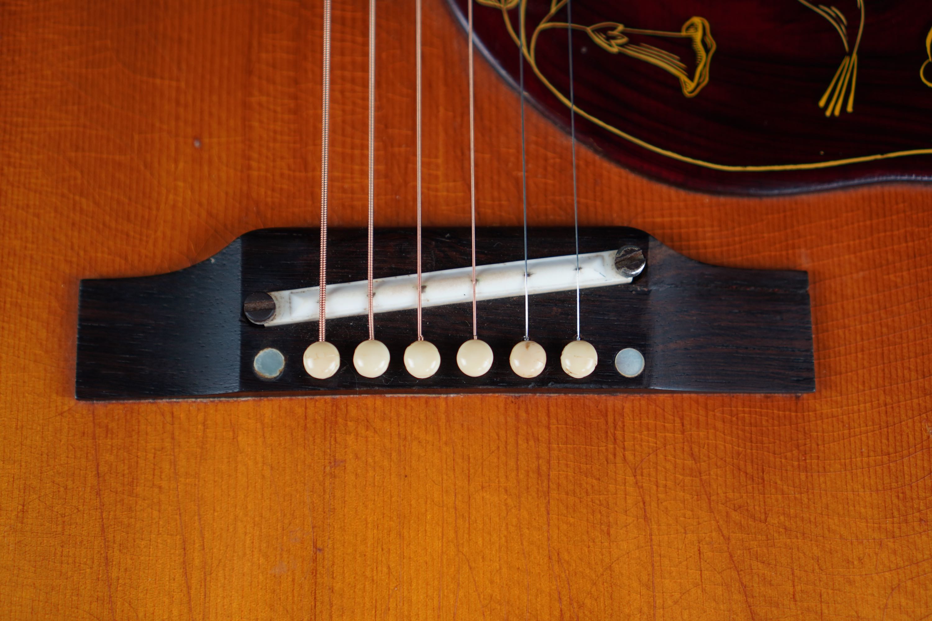 ハミングバードを象徴する大柄で厚めなピックガードも模様が綺麗に残り、サウンドホールのダブルリングやトップのバインディングも白黒多層のハミングバードらしい豪華仕様で、ローズウッドのアジャスタブルブリッジは、サドルが艶の無いタイプに変わった頃のオリジナルが搭載されております。