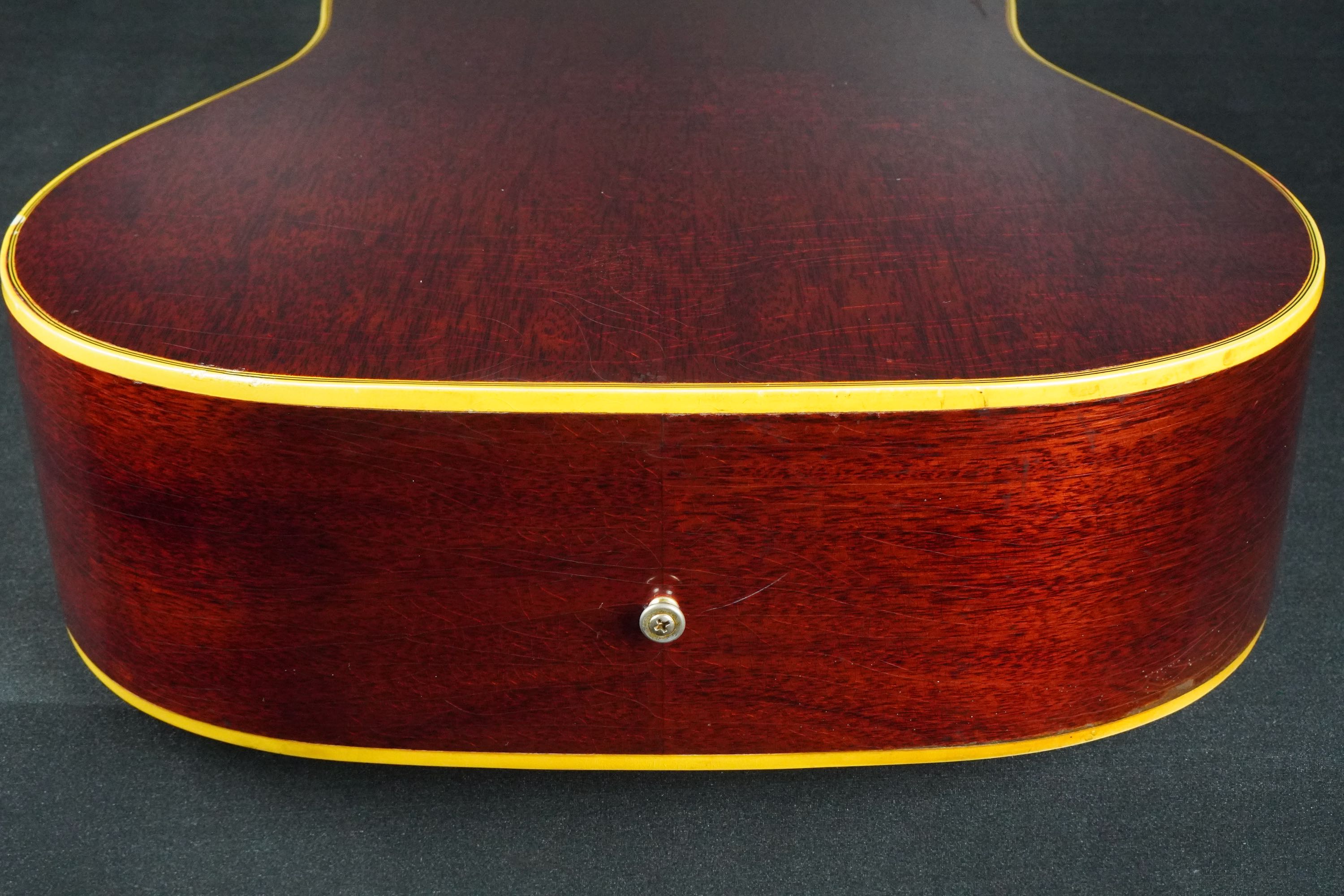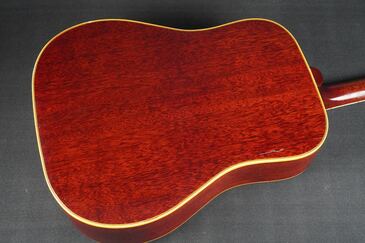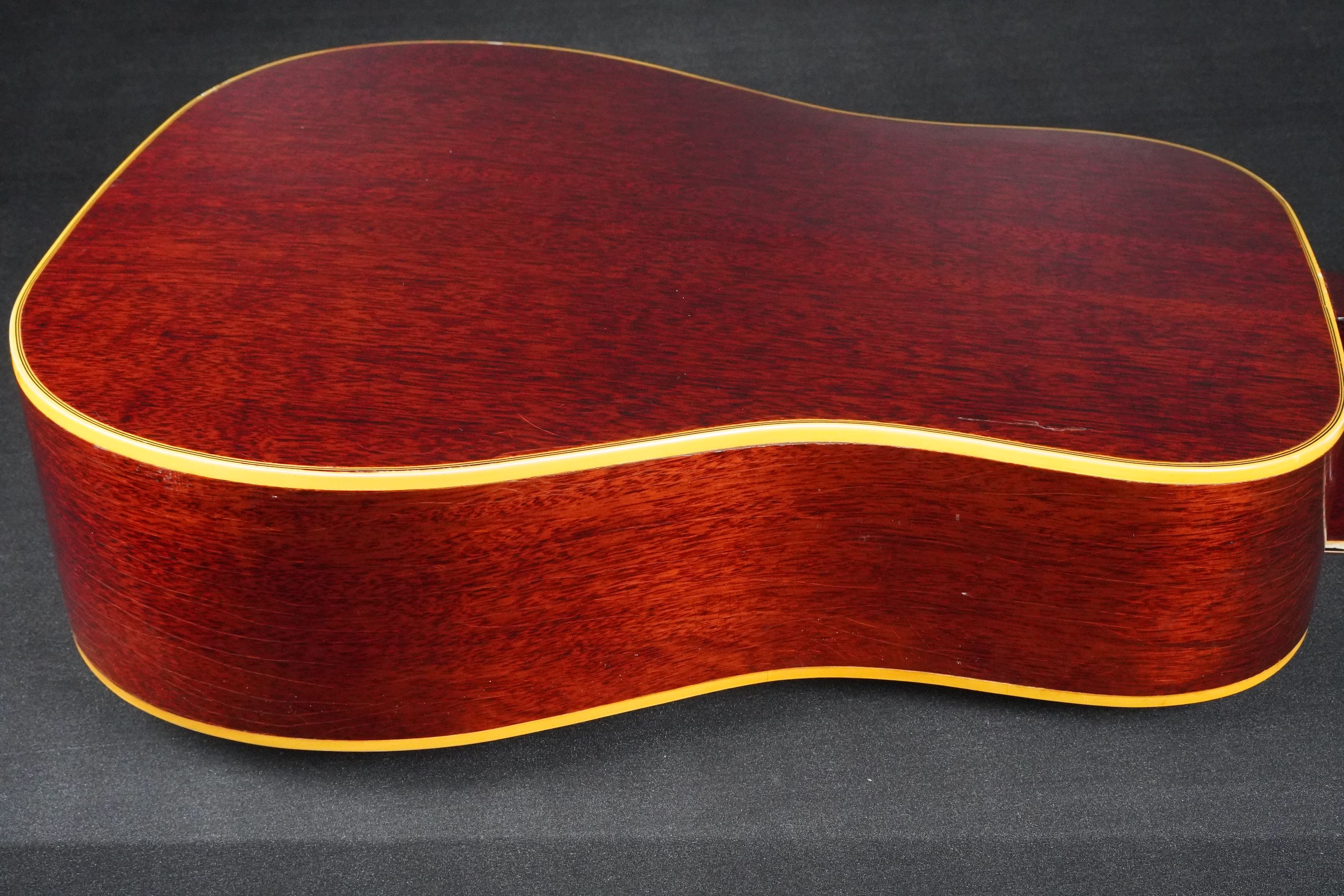 サイドやバック、ネックのマホガニーは、チェリーカラーが所々がフェードして微かに赤味が茶色っぽく見えるヴィンテージらしい風味を持ち、塗装の痩せや焼け具合、そこにウェザーチェックが走って、こちらも渋い雰囲気です。