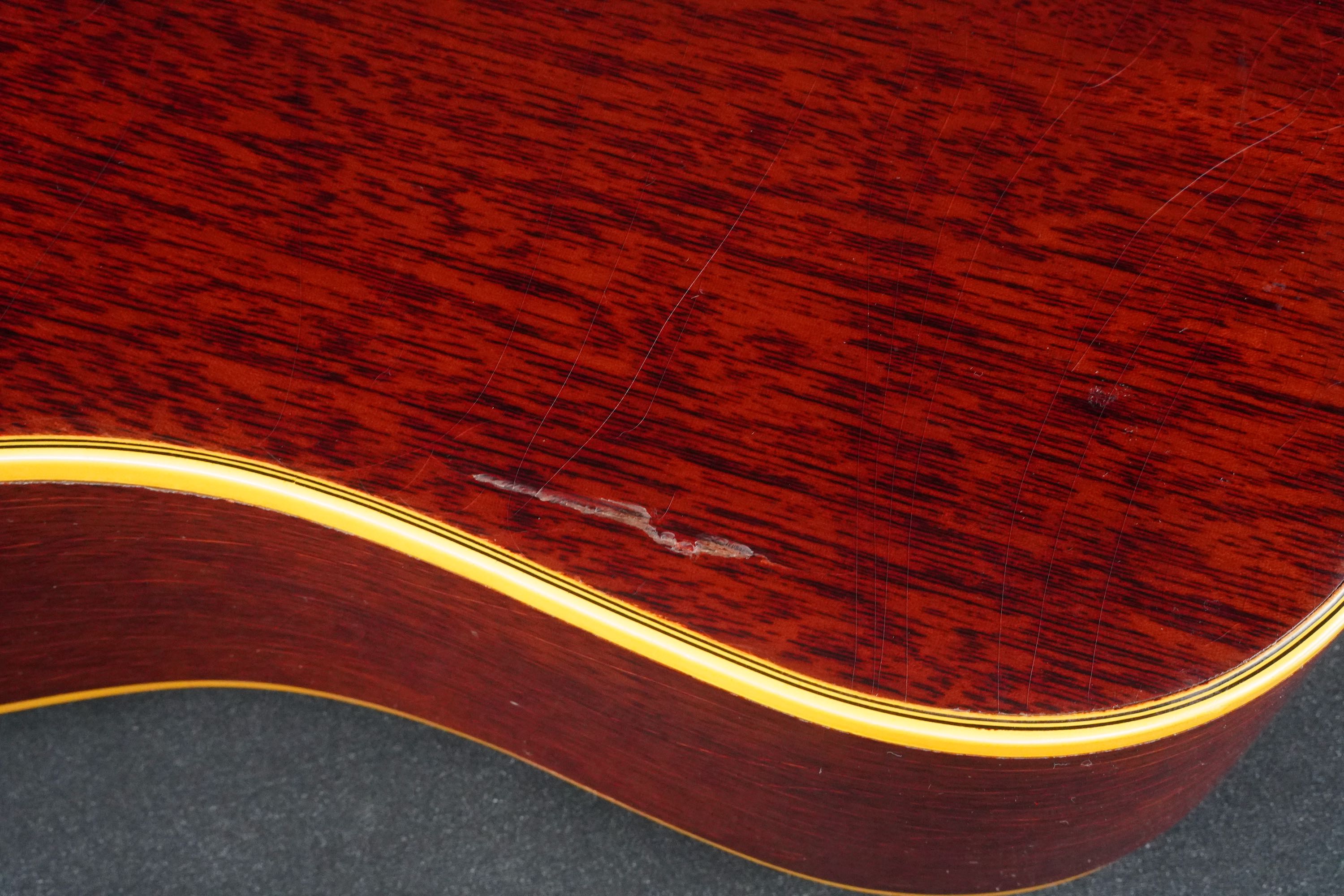 キズや塗装の痩せ、ウェザーチェックなど、経年でのヴィンテージらしさはあり、ボディトップのボトムの両端バインディングあたりや、バックのくびれ近くには、やや目立つ傷もあります。