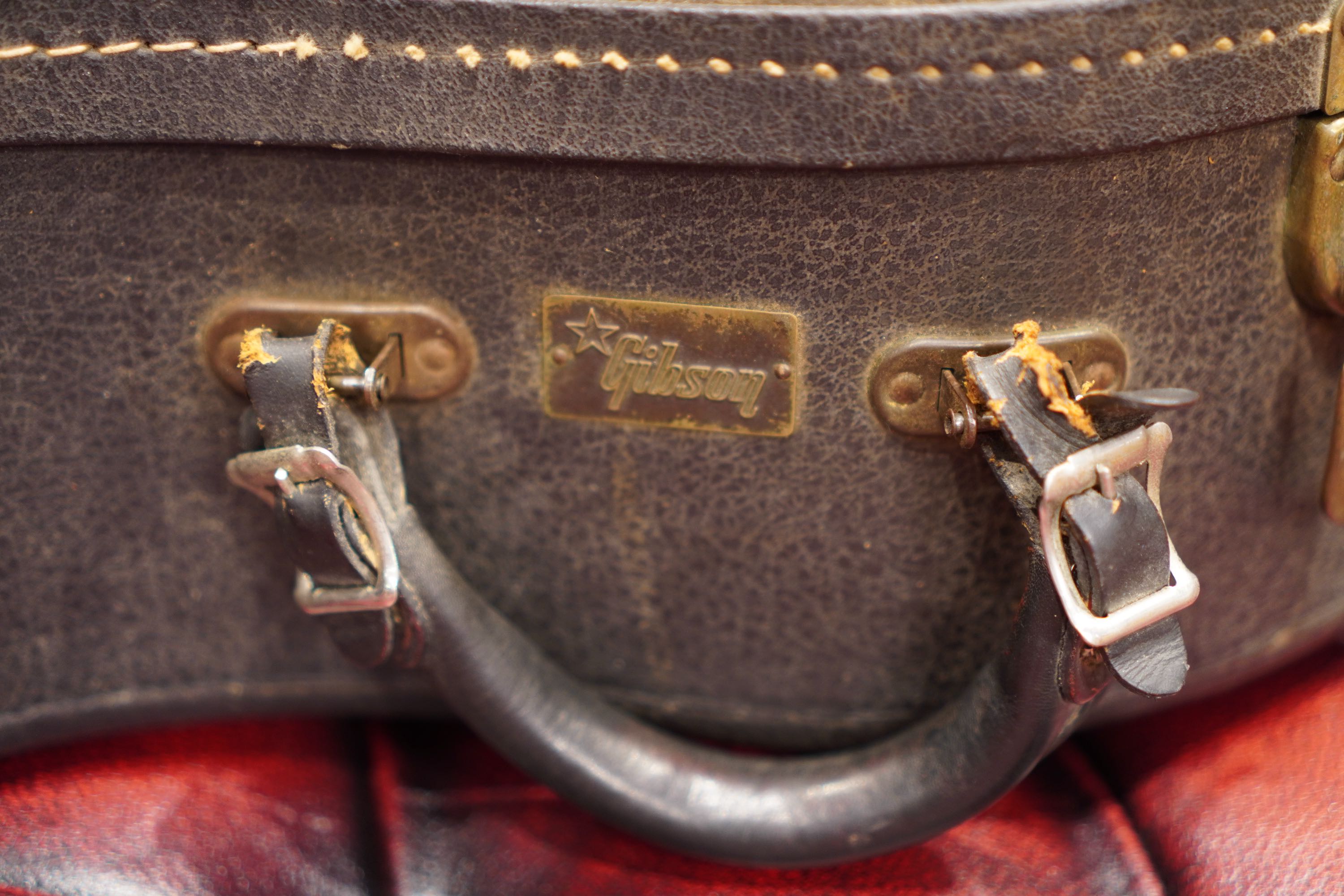 付属もハードケースも外装が黒く内張が黄色い60年代のタイプですが、恐らく持ち手が破損したと思われ、現在はリプレースパーツに交換されております。