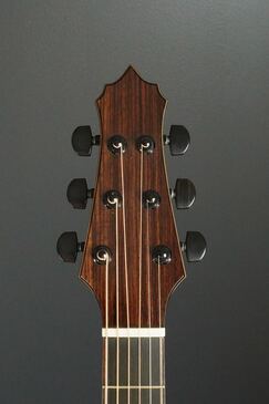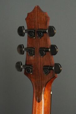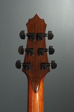 独創的で凝ったデザインのヘッド、このヘッドの裏と表にはウッディな突き板が入り、トップ側のヘッドトップには薄く白木を挟んだ仕様で、エッジ部分を斜めに落とす事で、この白木が細いラインのように見える、職人気質を感じるデザインとなっており、チューナーにはシャーラーのブラックでエボニーツマミと、ウッディなデザインにマッチしたスペックとなっております。