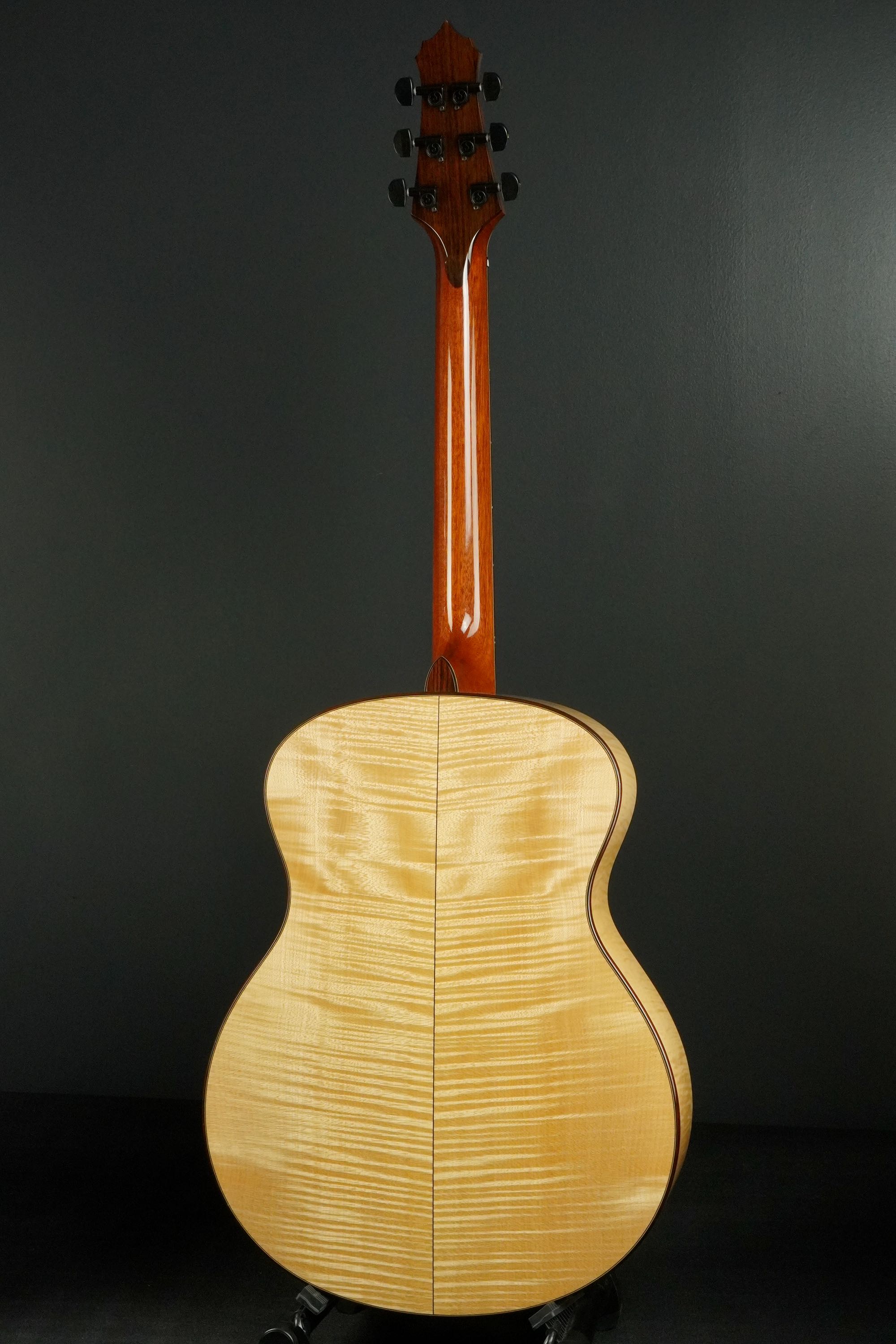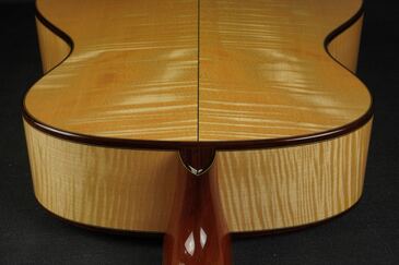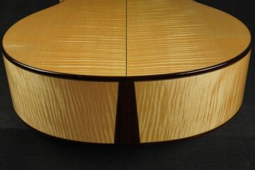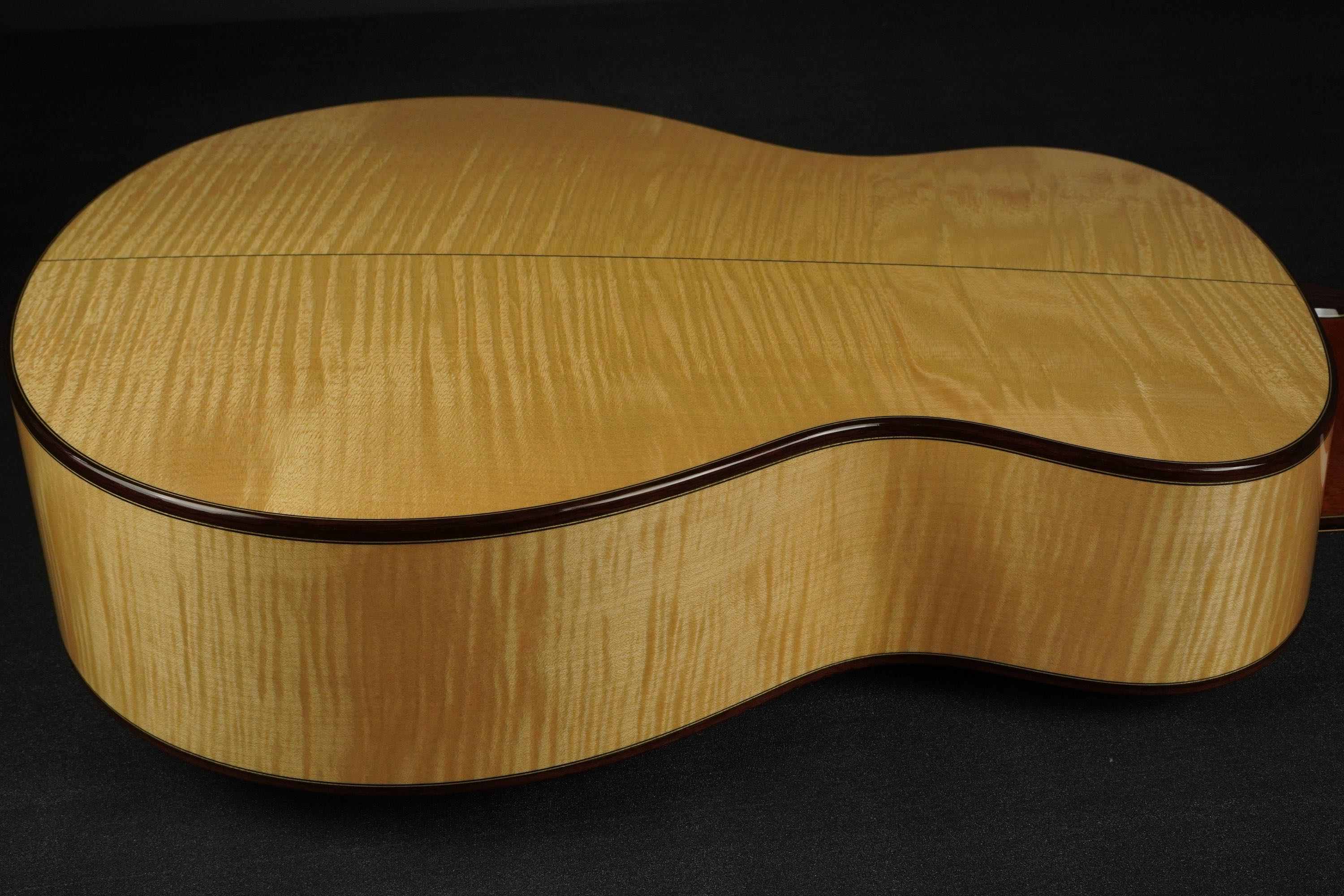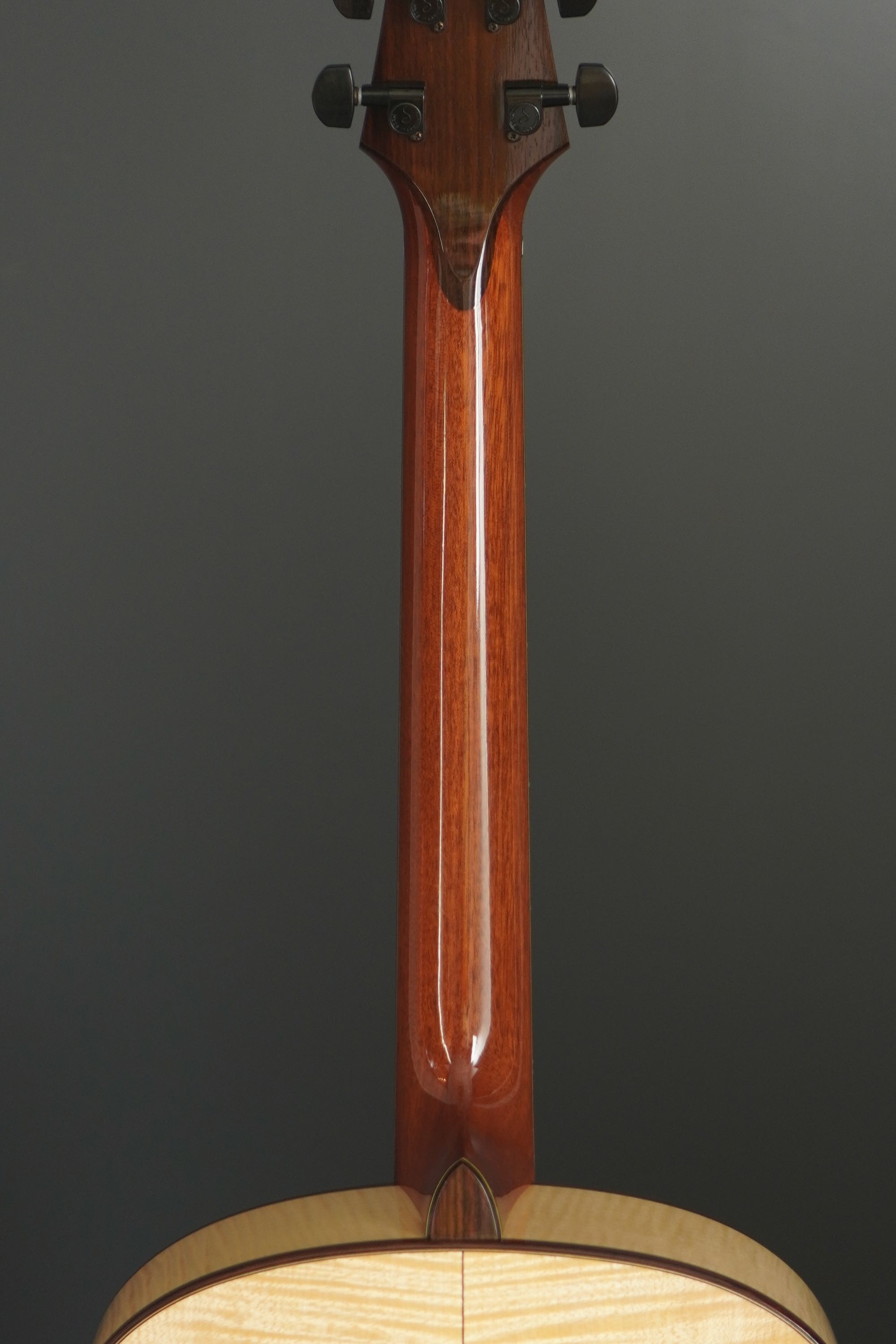 色白のヨーロピアンスプルースのトップ、そして杢目の美しいフレイムメイプルをサイド&バックに配したウッドマテリアルと、このバランスの良いボディシェイプとのマッチング、装飾系も凝ったデザインのサウンドホールのパーフリングや、細かく多種の木材を合わせたウッドバインディング、3次元で美しい造形のローズウッドのブリッジなど、センス良く上品にまとまった、エレガントな雰囲気のギターです