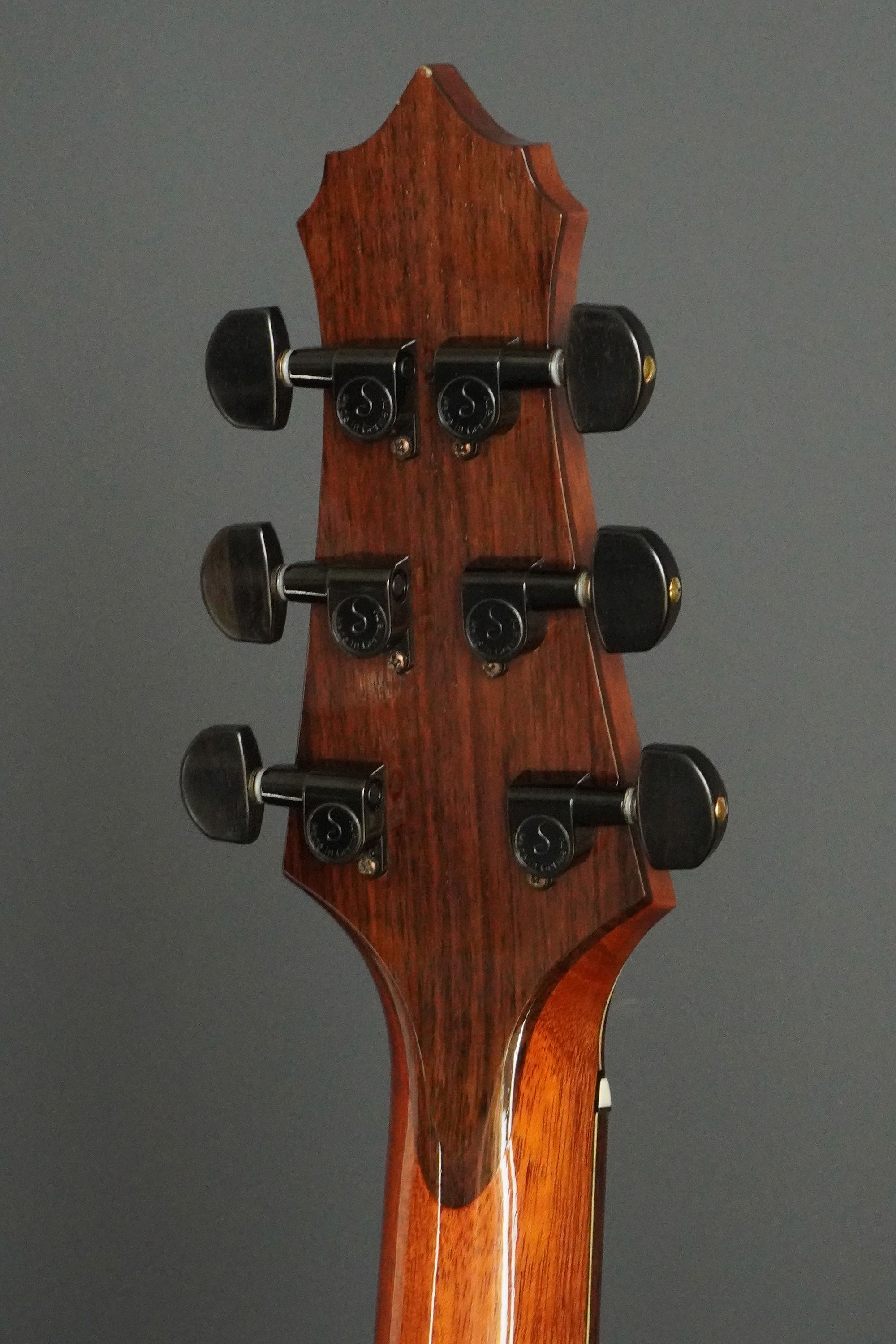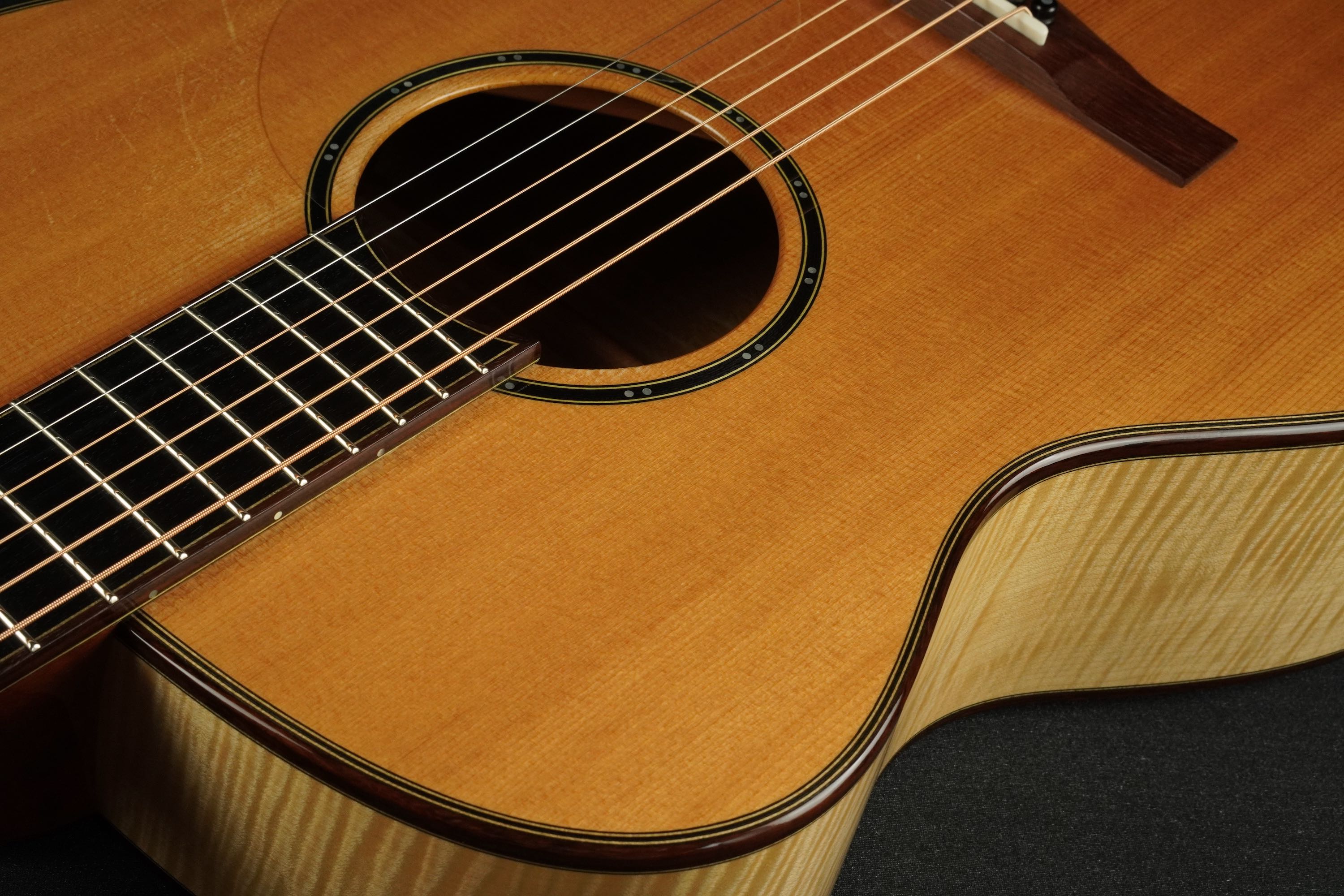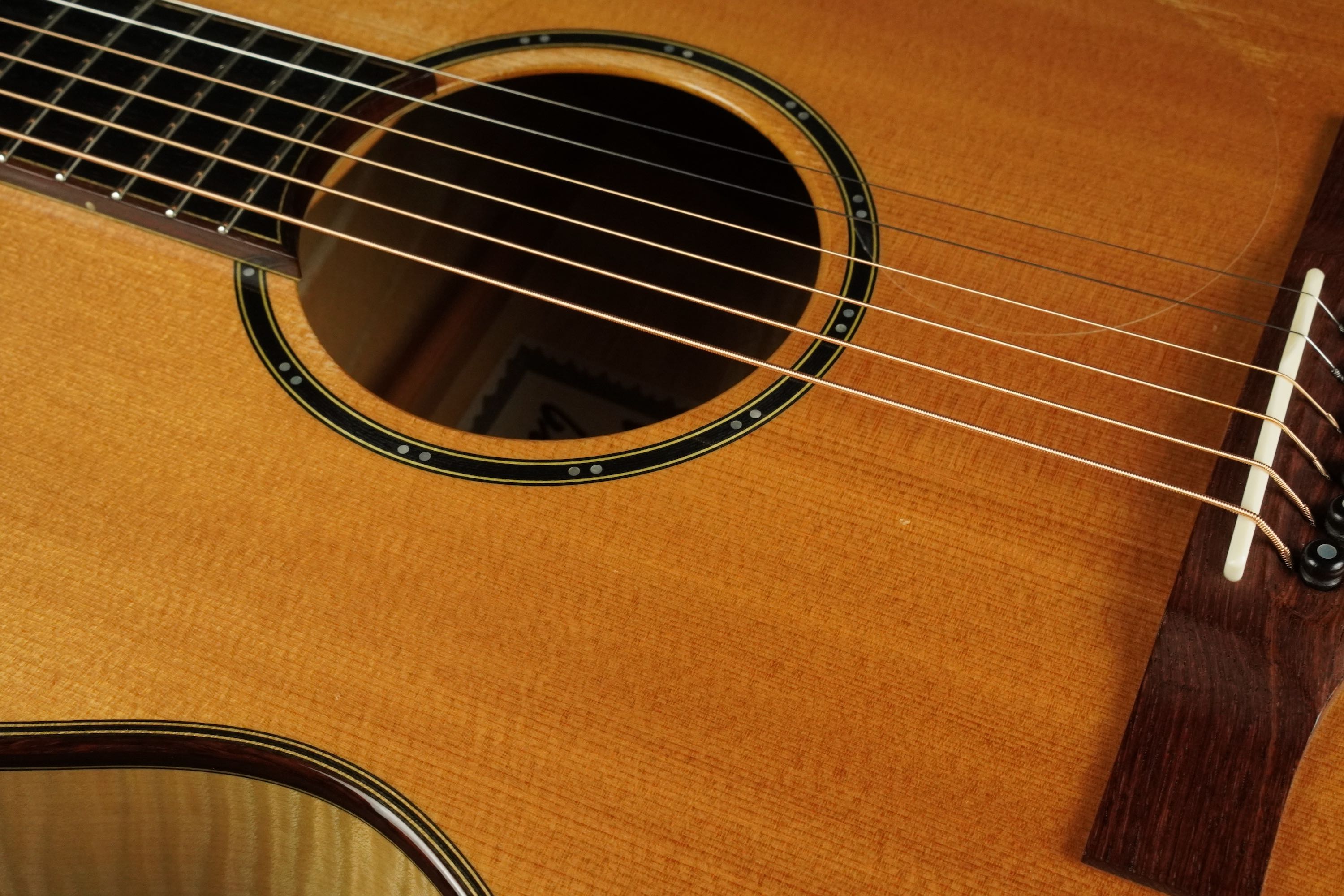 製造は2006年製の中古品で、トップに豆粒ほどの打コン修正跡や、サドルの交換は有り、細かな弾き傷や塗装の痩せなど、年を経た使用感はありますが、各部の質感の高さは、ギターを手にするとシッカリと感じられる、ルシアーメイドらしい風合いは残っております。