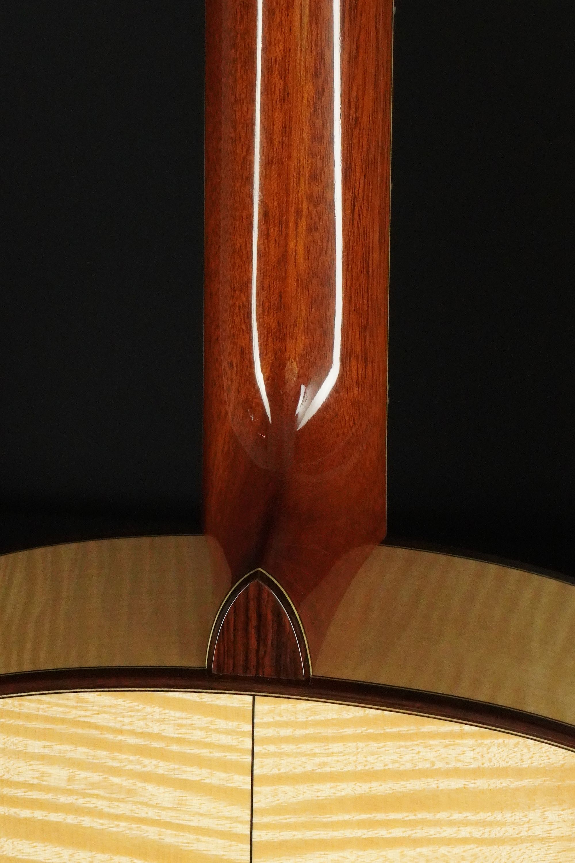 指板はエボニーで、この指板のウッドバインディングにも薄くメイプルを挟んだ凝った仕様で、指板エンドもサウンドホールに合わせてラウンドさせた形状となっており、細部まで丁寧な仕事ぶりがみられます。
