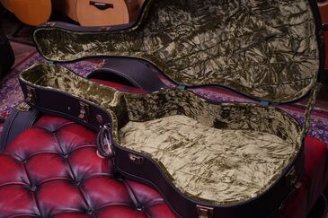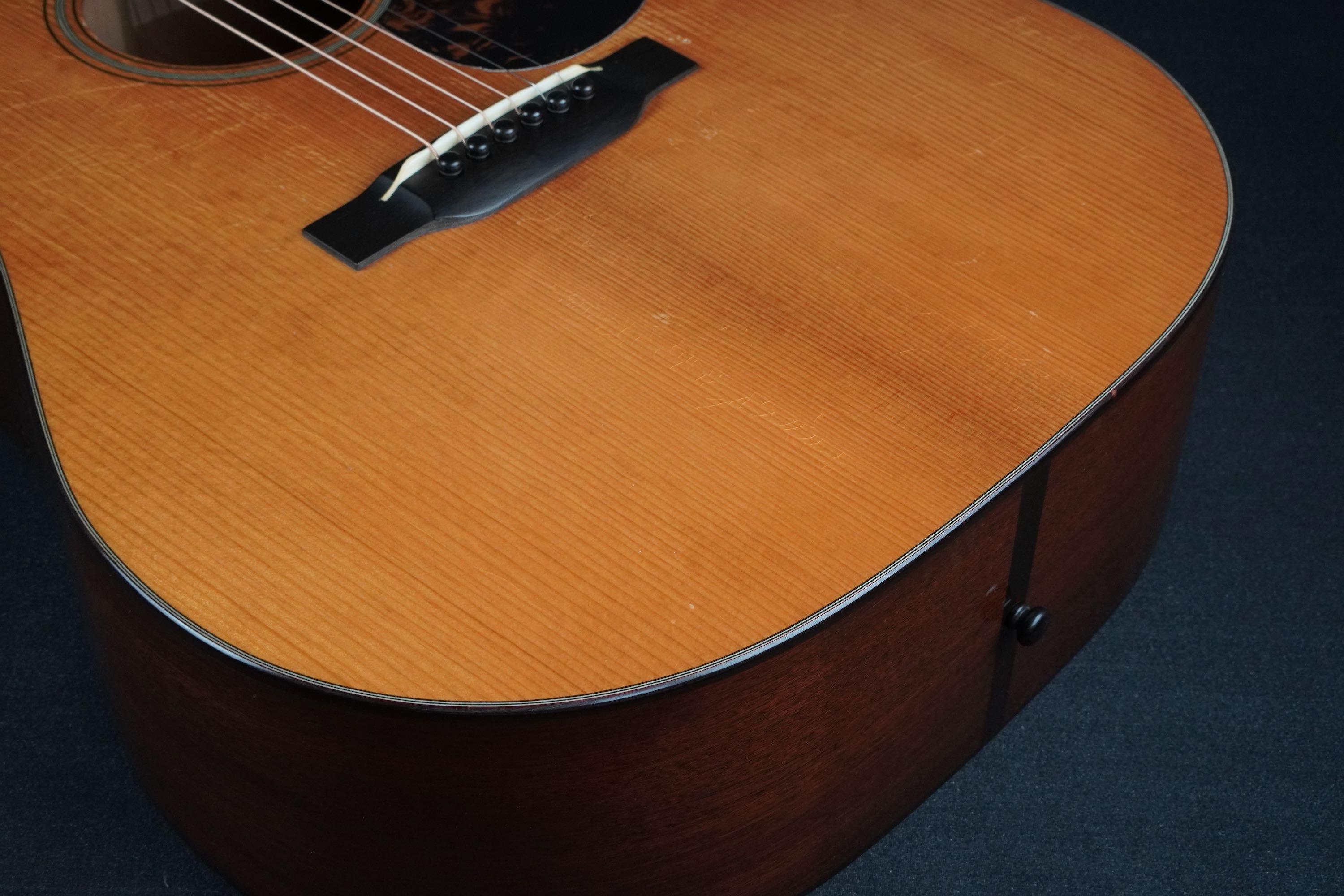 ボディ内の、サイドの割れどめの茶色いリボンや、フォアードのXスキャロップブレーシングの、Xの位置のニカワが染み込んだ布の感じなど、ヴィンテージギター好きには嬉しい、非常にマニアックな仕上がりです。