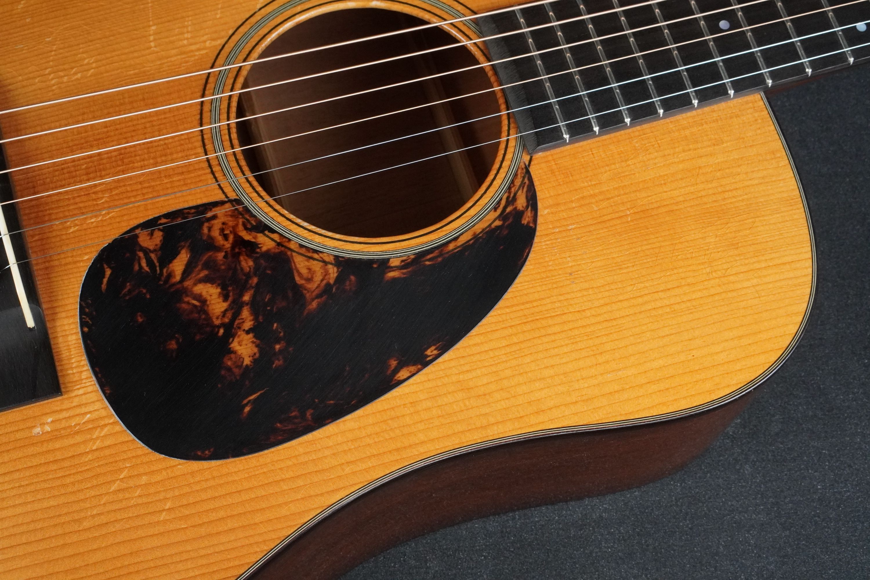 サウンドホールとピックガード付近に自然な感じの弾き傷のダメージが入っています。