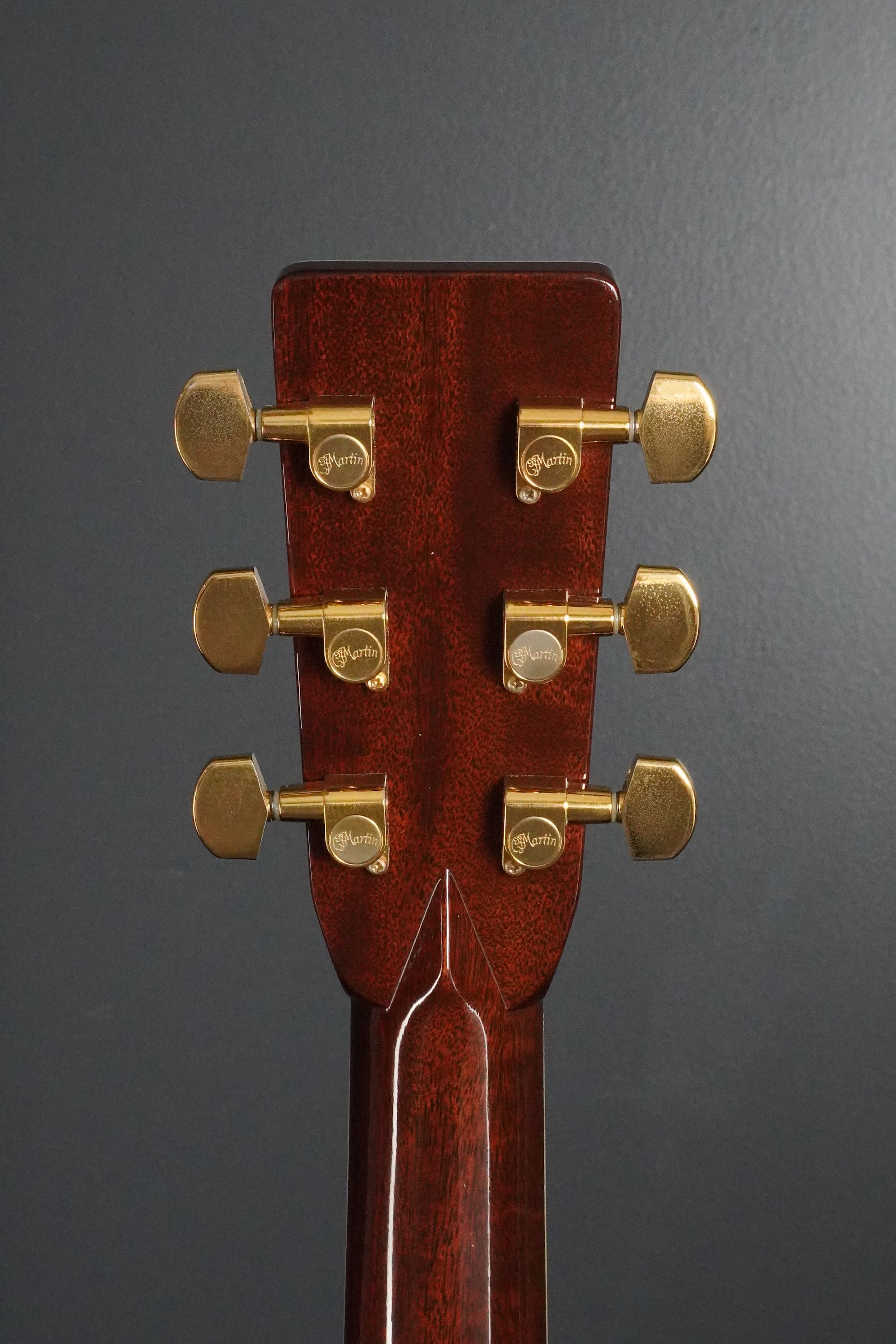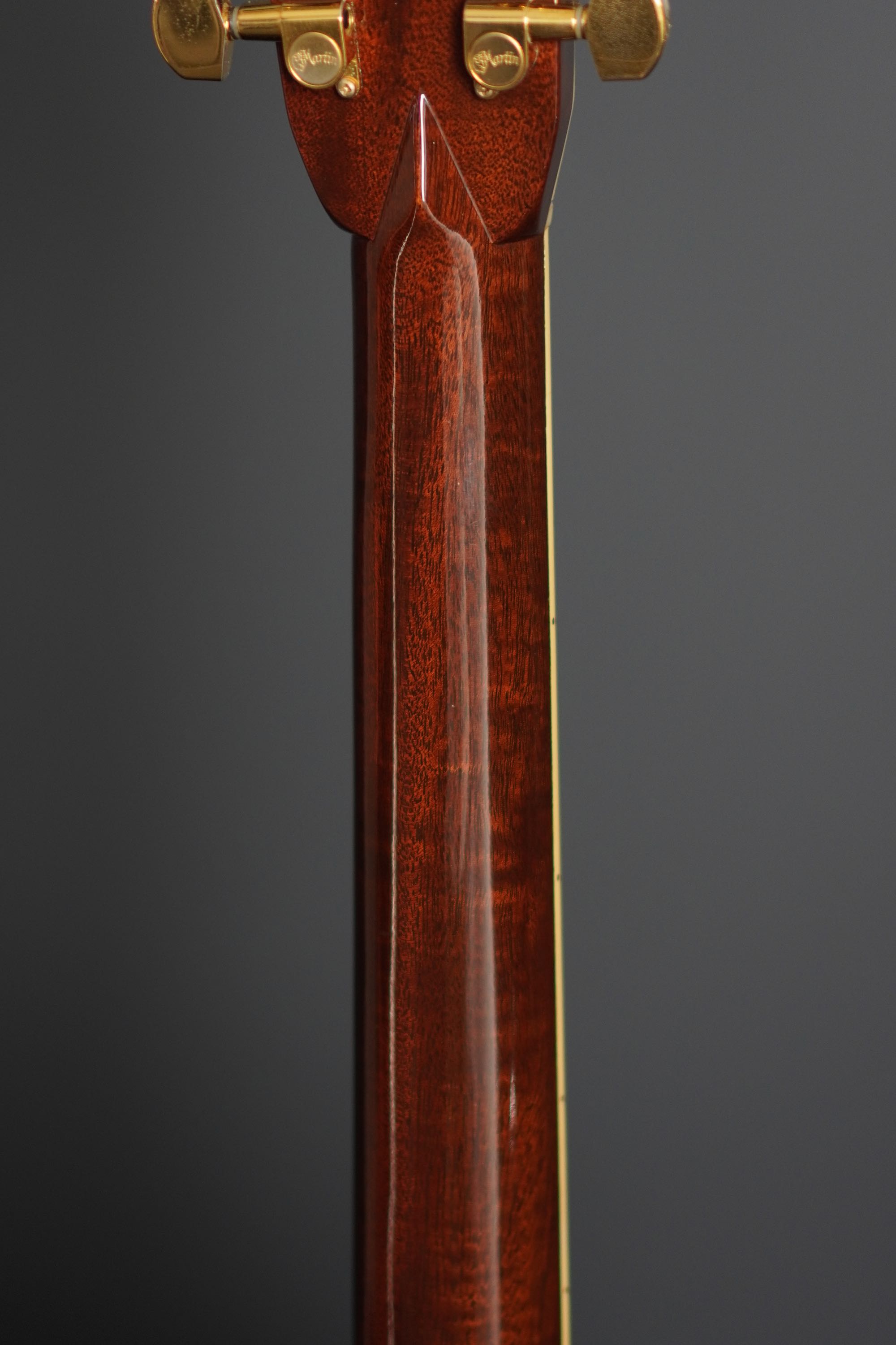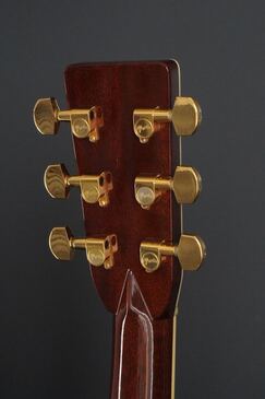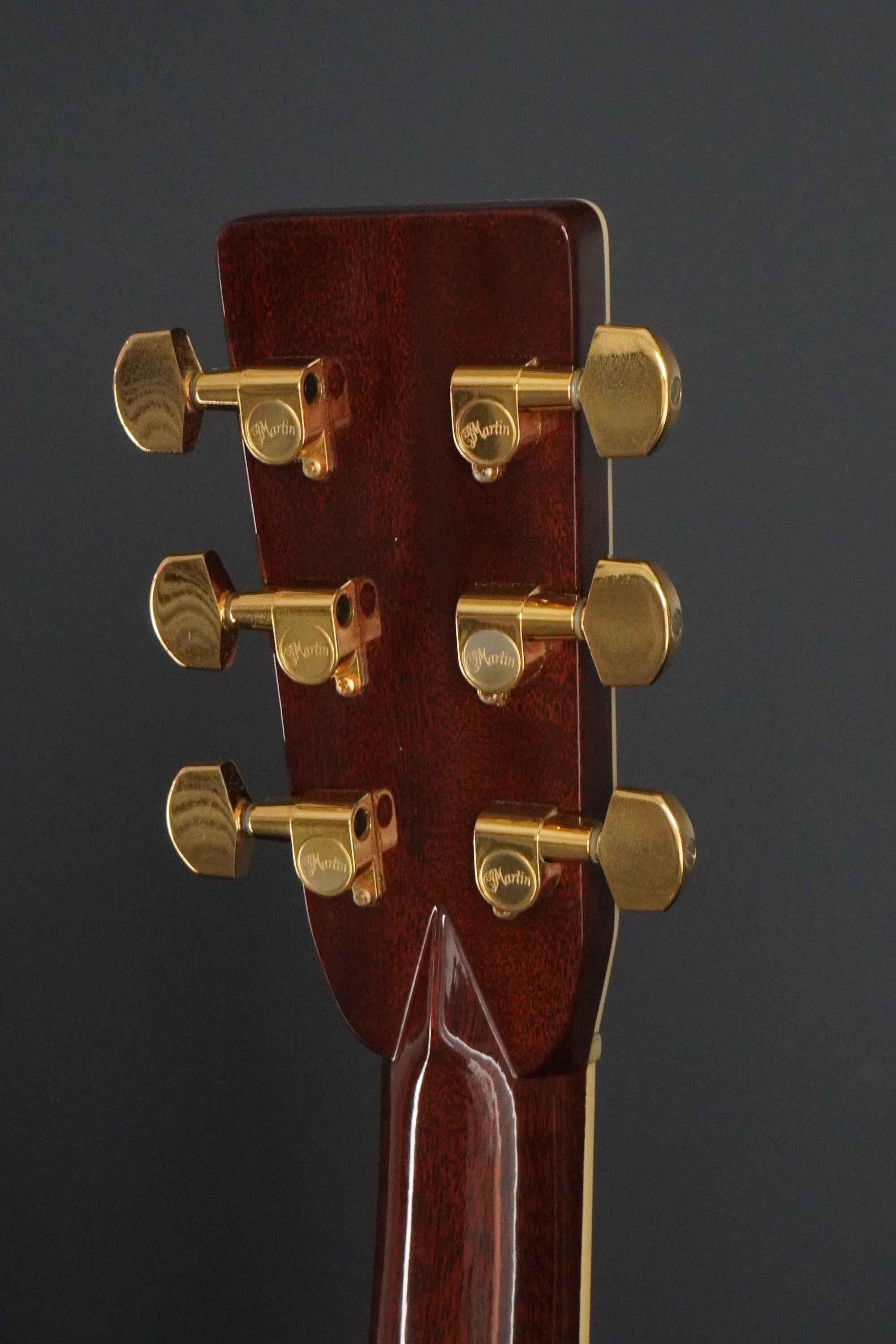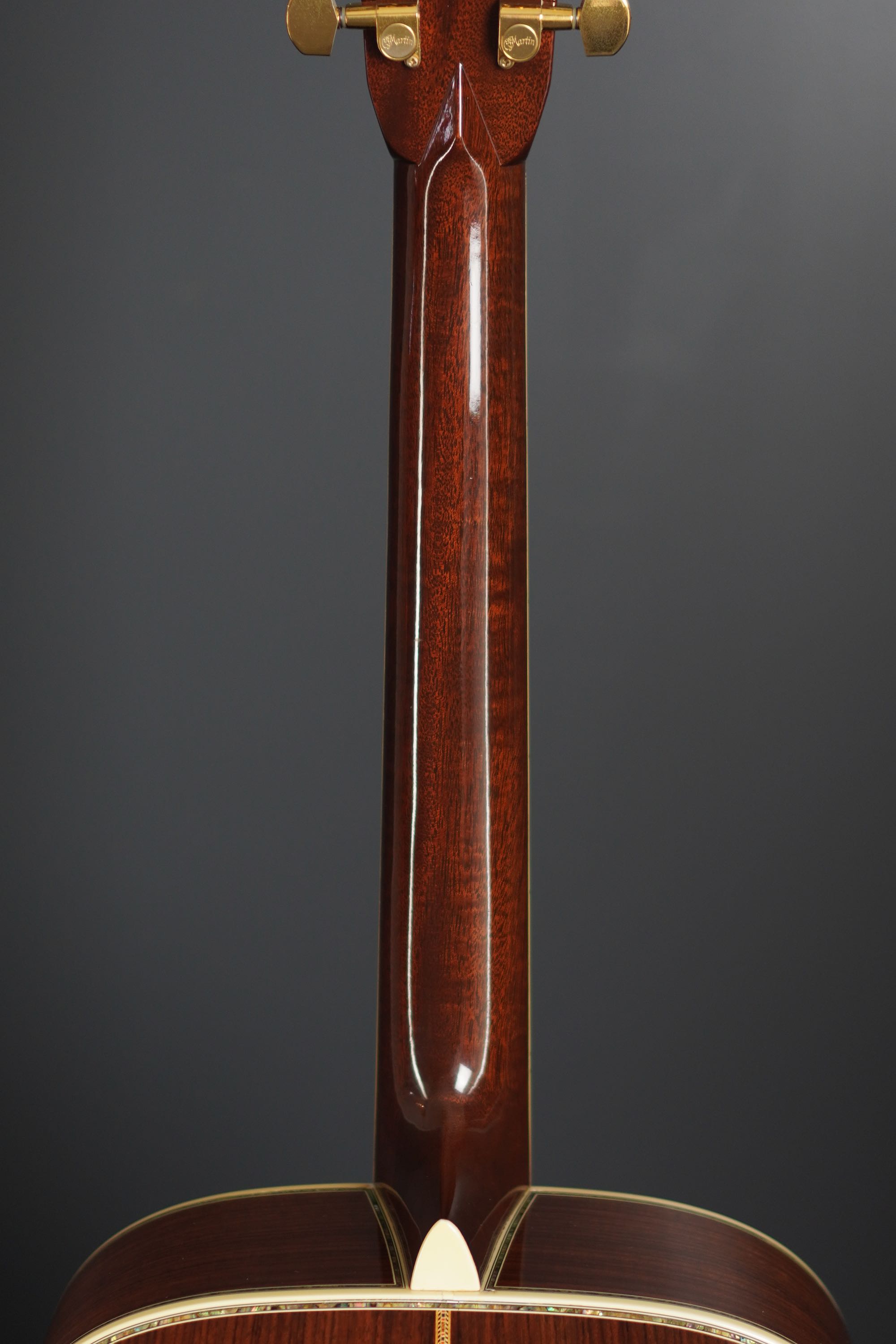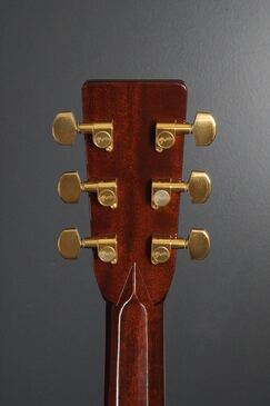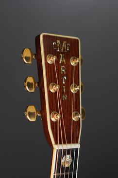 ヘッドや指板の強い存在感も45スタイルならではで、魅惑的な木目のローズウッドのヘッドトップに鮮やかなMARTINの縦ロゴ、ペグはMartinの刻印が入ったゴールドのオリジナルペグです。