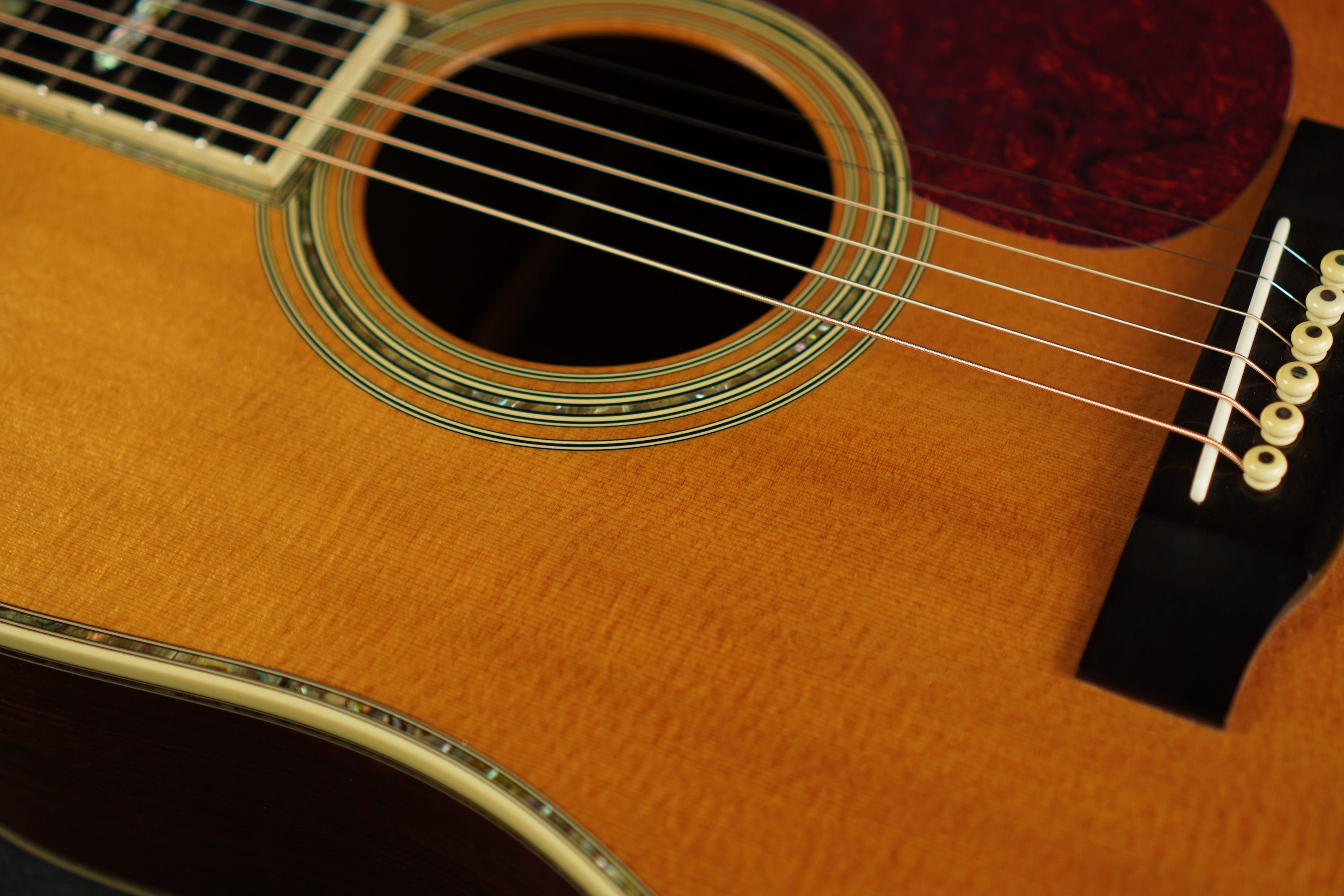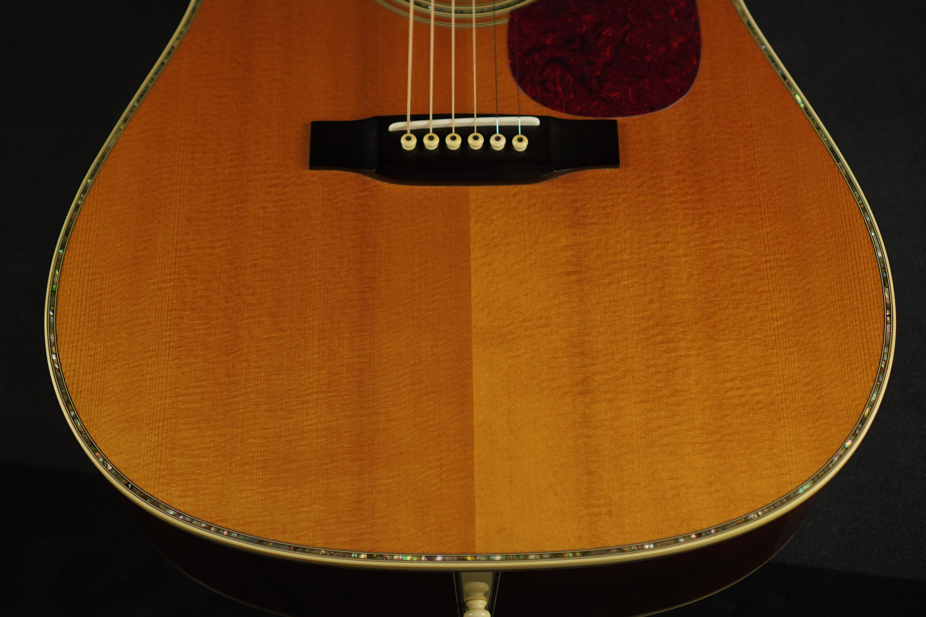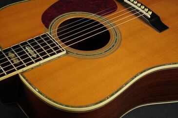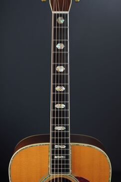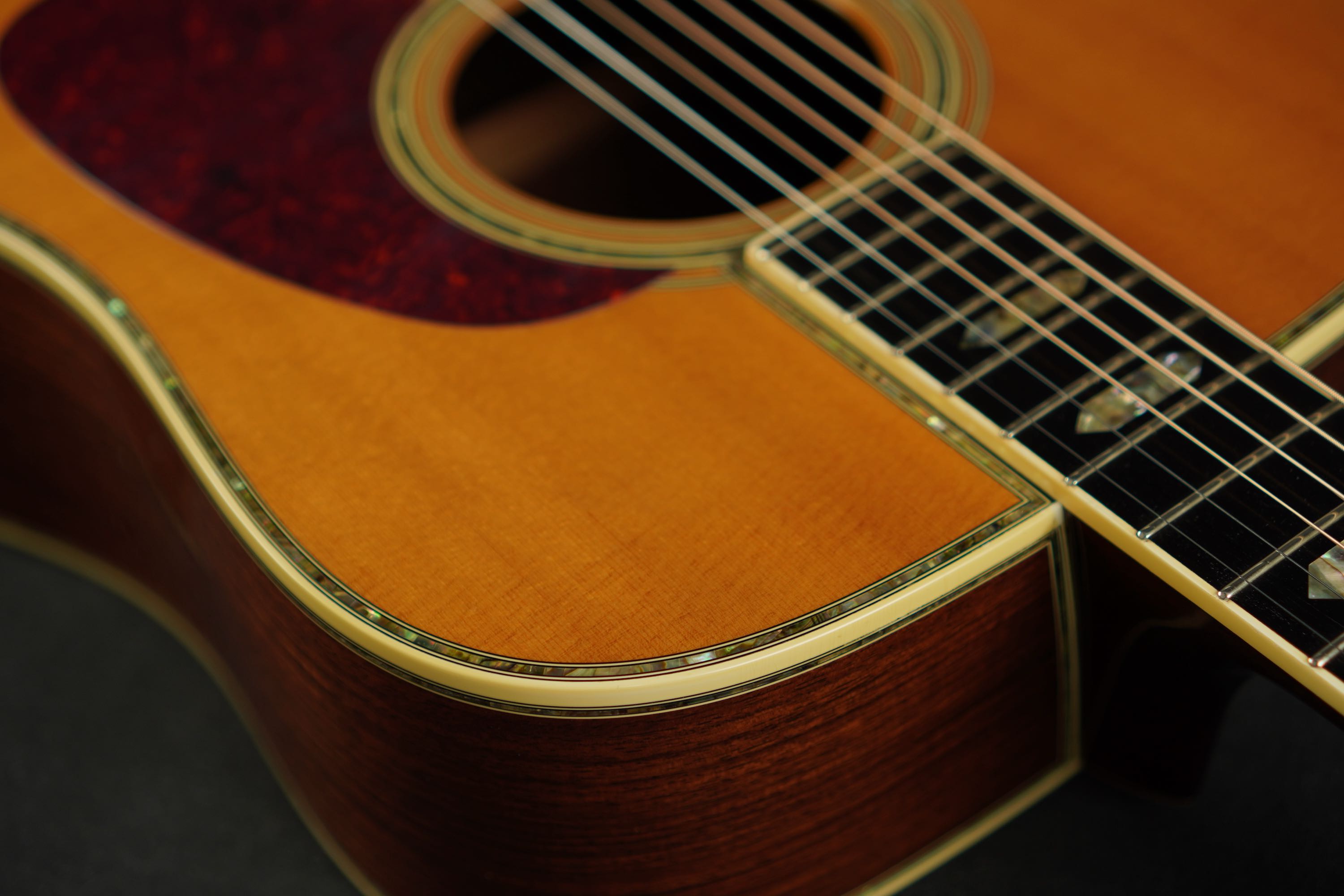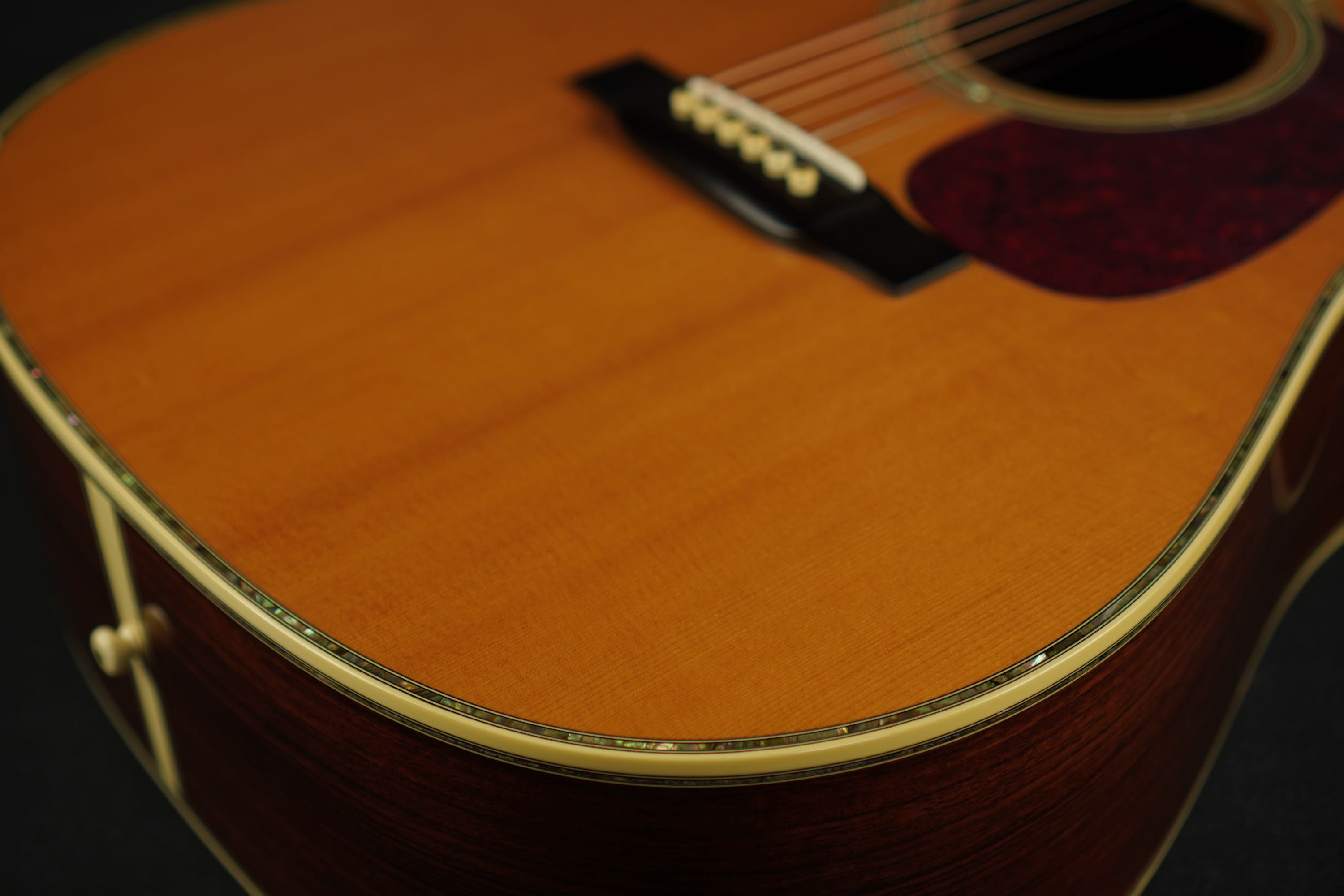 さすがは45グレードに使われる最上級グレードのシトカスプルースだけあって、細かく詰まった木目に明るくシルキーなウェイブが走り、元々色白なトップが経年で程良く色焼けし、美しい光沢を持つ上品な表情のギターです。