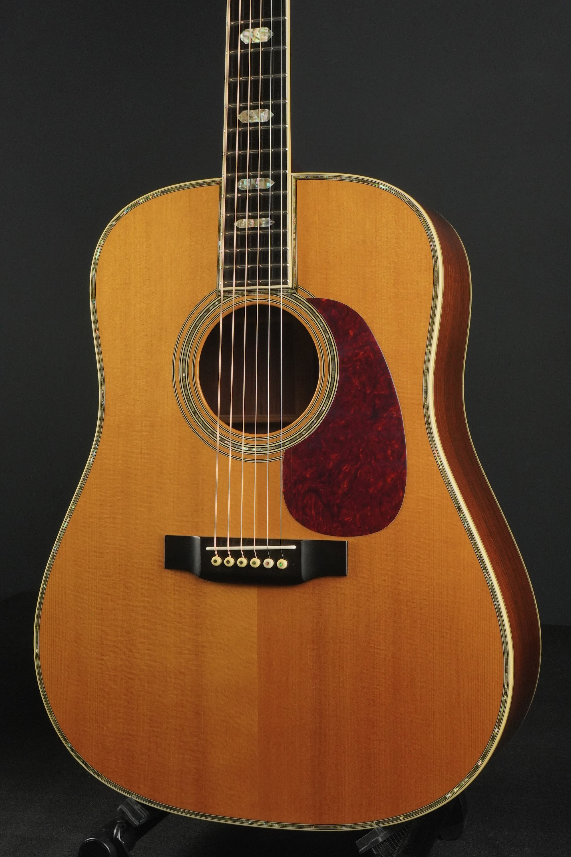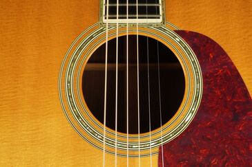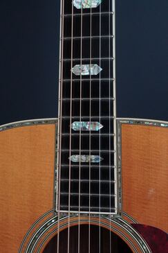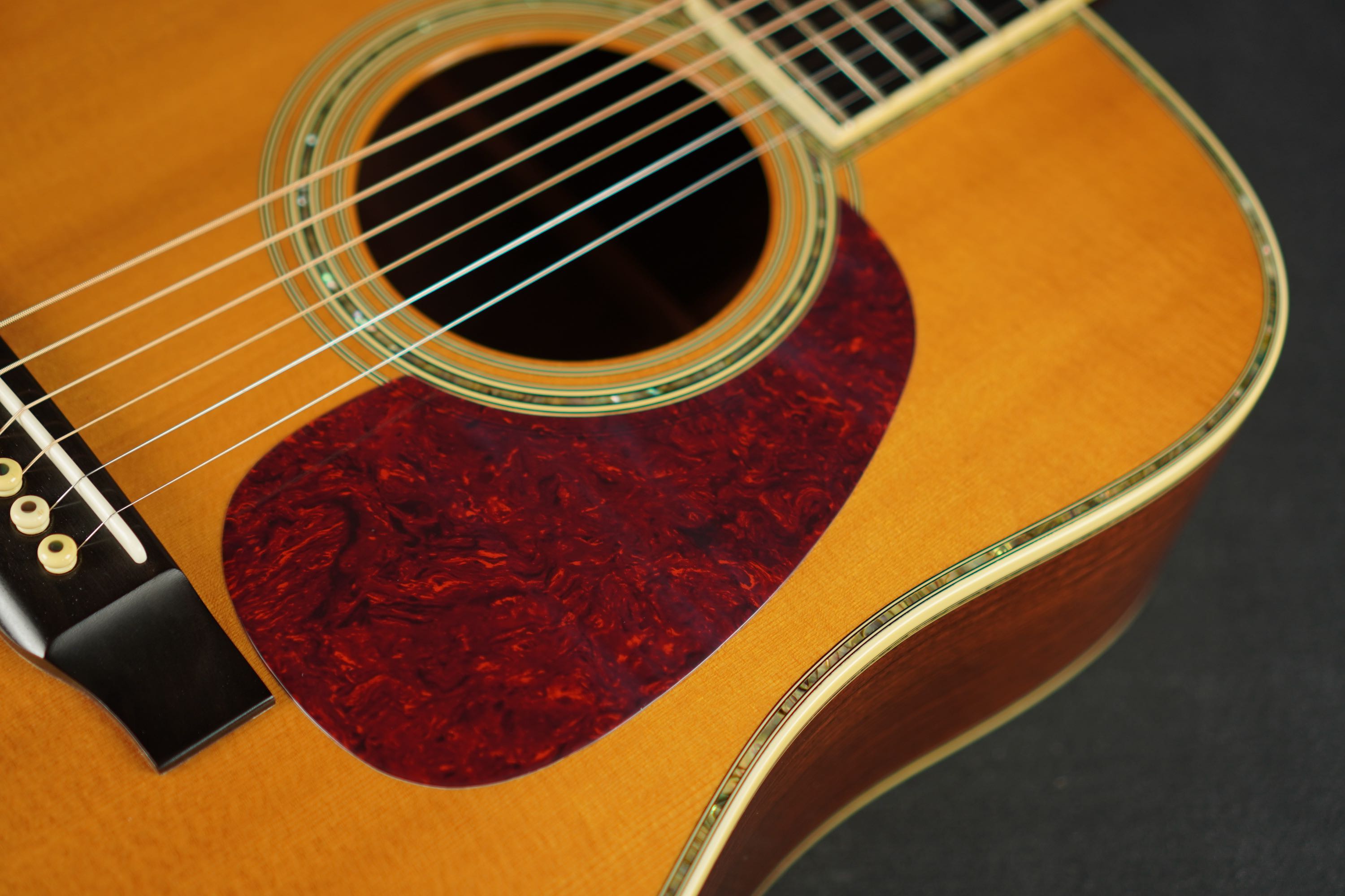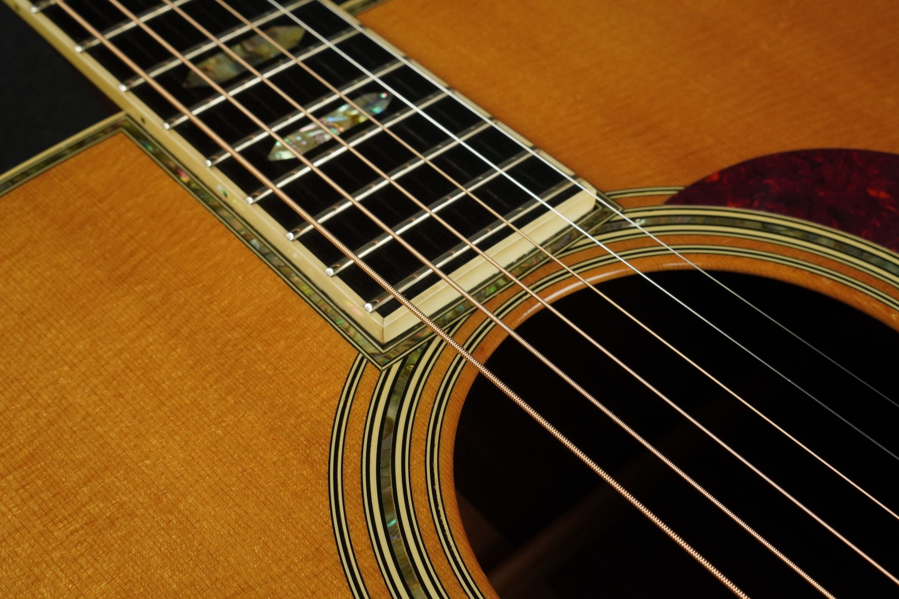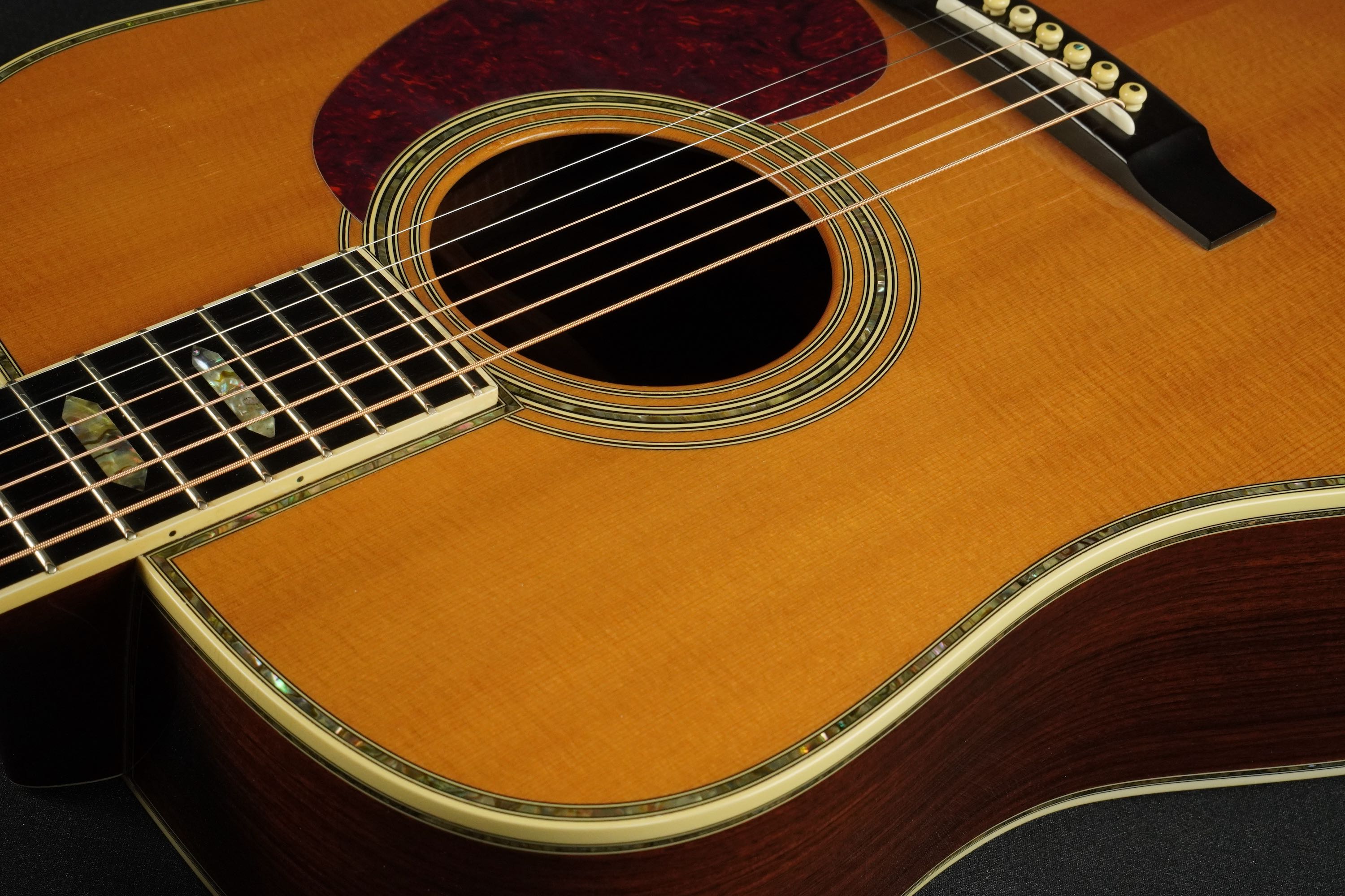ベッコウ柄のピックガードにエボニーのベリーブリッジ、トップ外周のアヴァロントリムや、サウンドホールのアヴァロンロゼッタはキラキラと鋭い輝きを持ち、D-45ならではの豪華さを感じさせてくれます。
