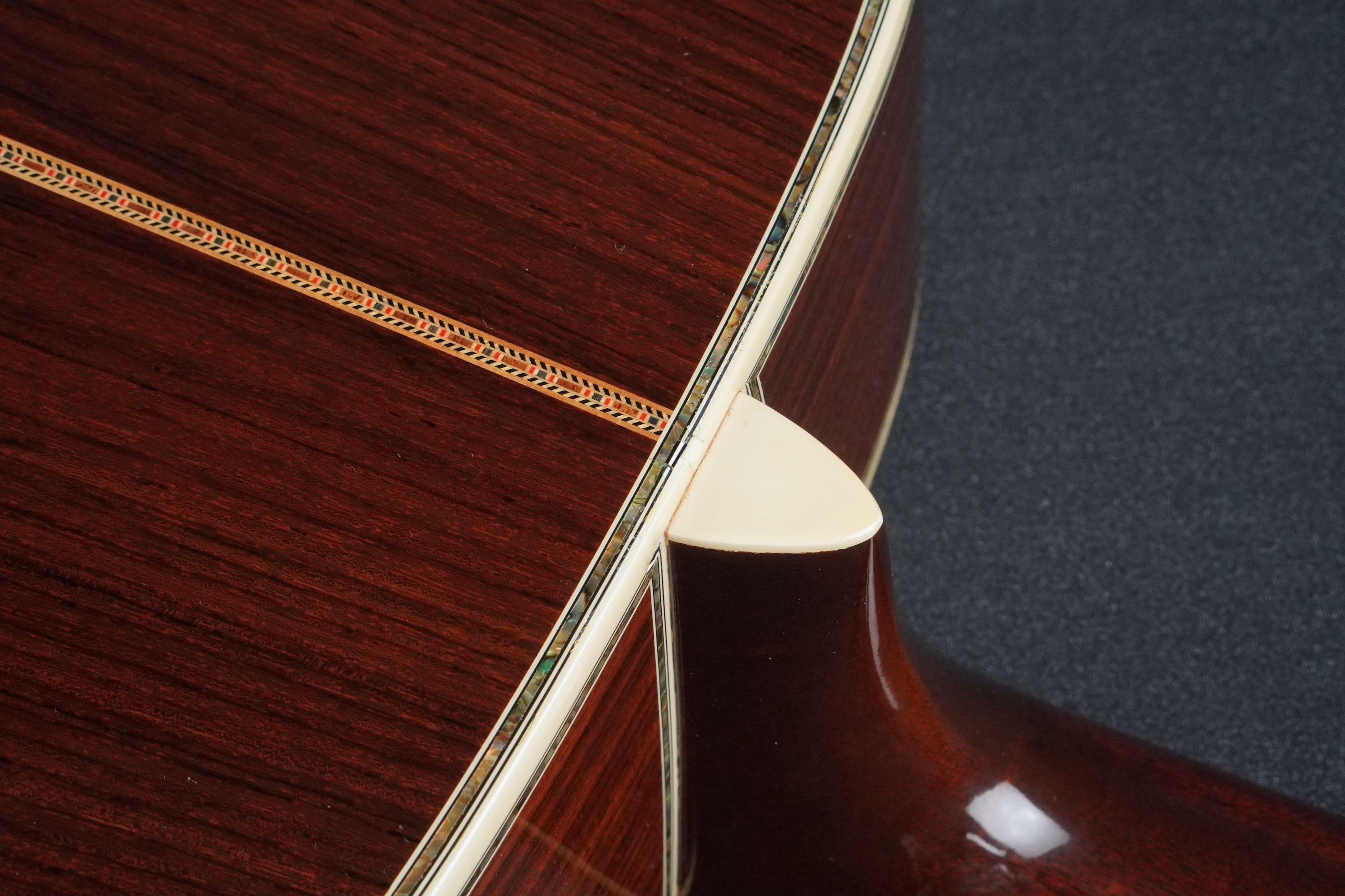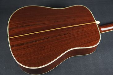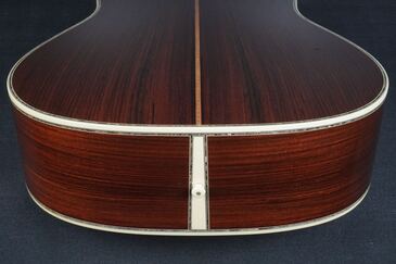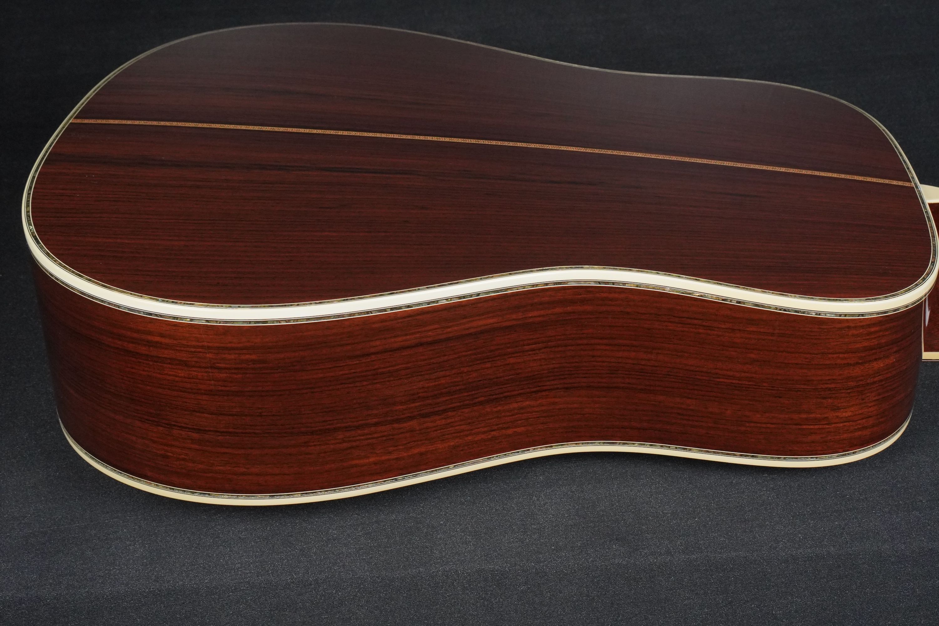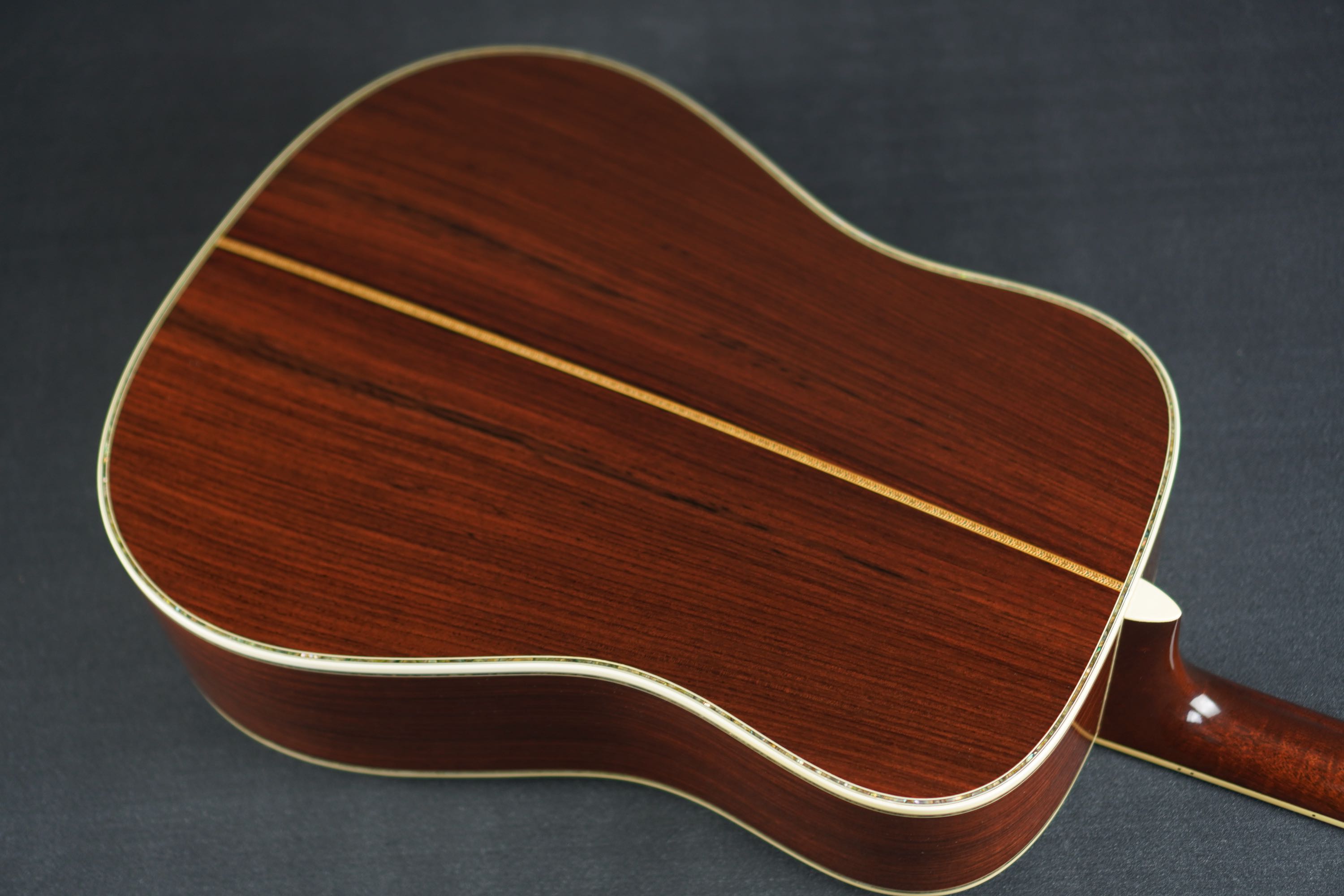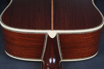 サイド&バックもD-45らしい、とても美しい柾目のイーストインディアンローズウッドが使わており、赤褐色の木肌には所々で黒い筋が通る、古い時期の木材のような風合いを持った良材で、そこに45スタイルらしい細かくカラフルなセンターストリップやアバロントリムが合わさり、魅惑的な素晴らしいルックスとなっております。