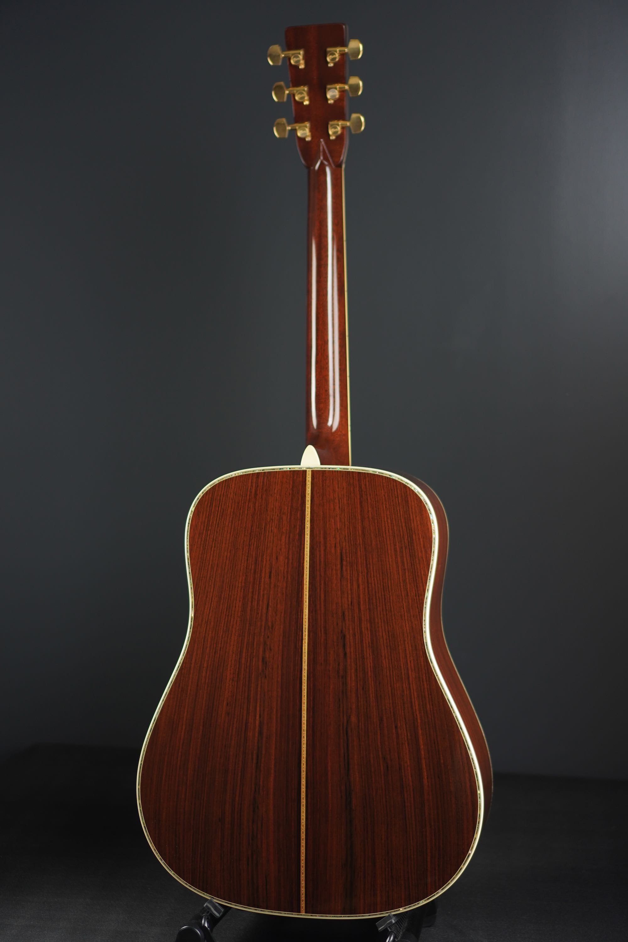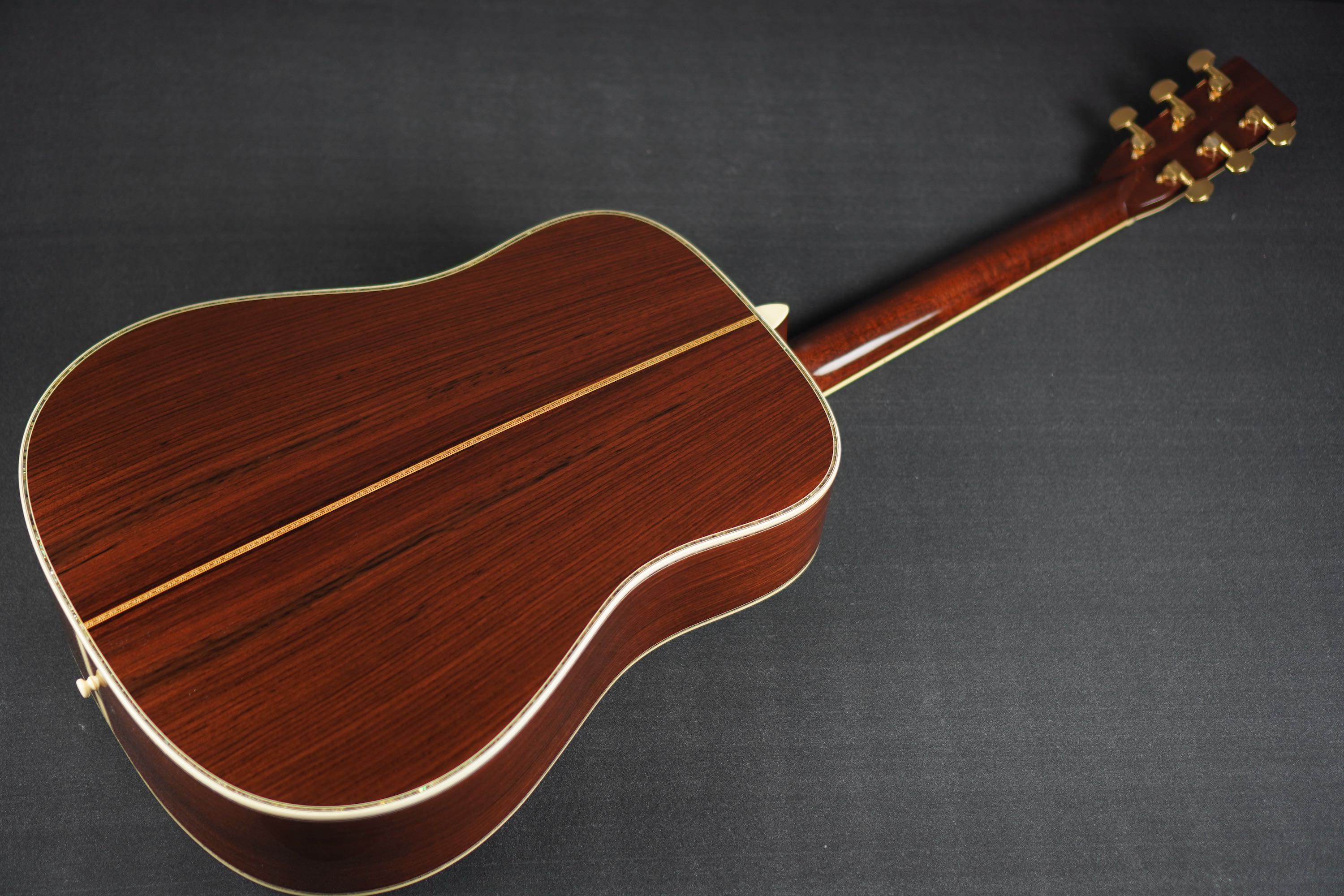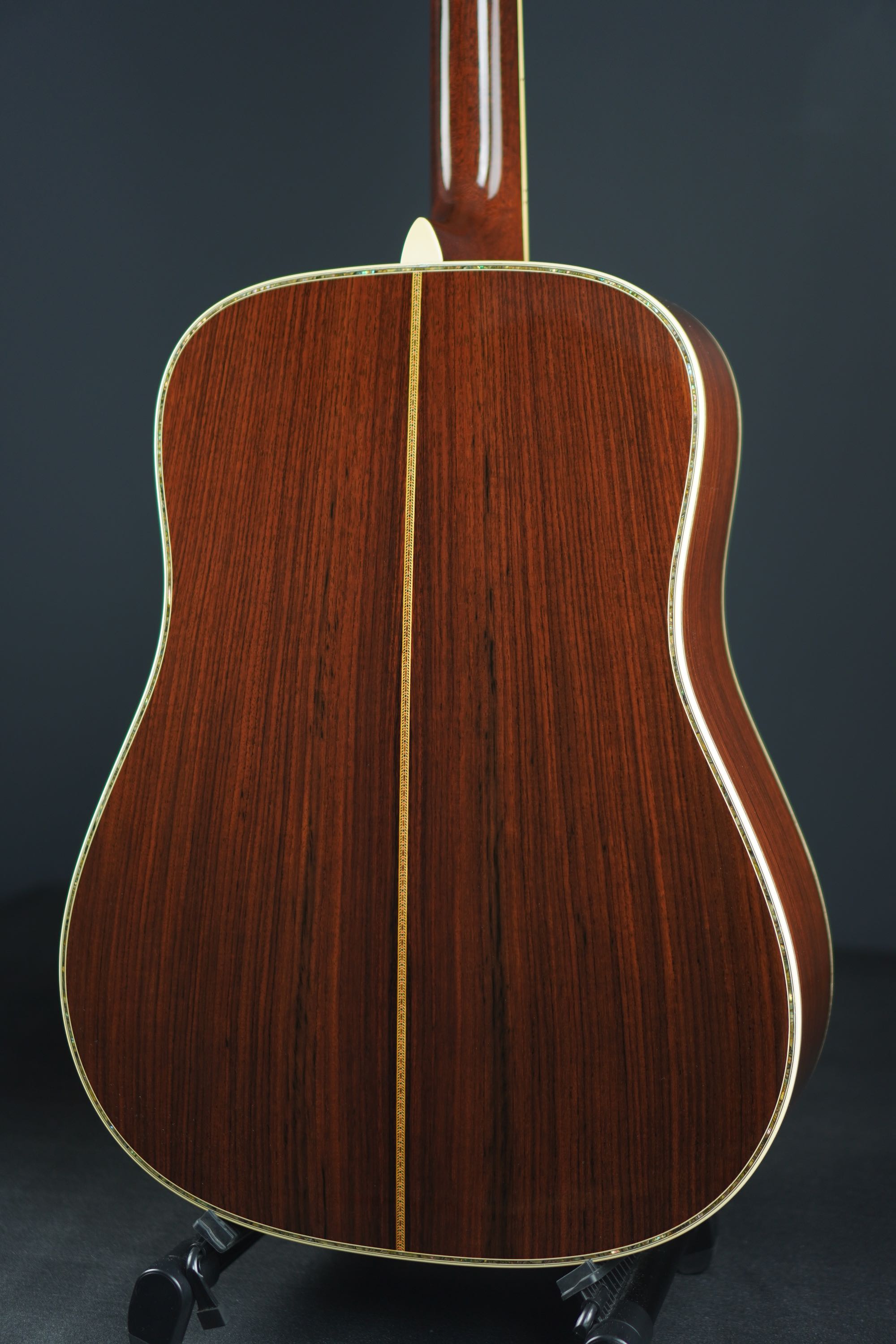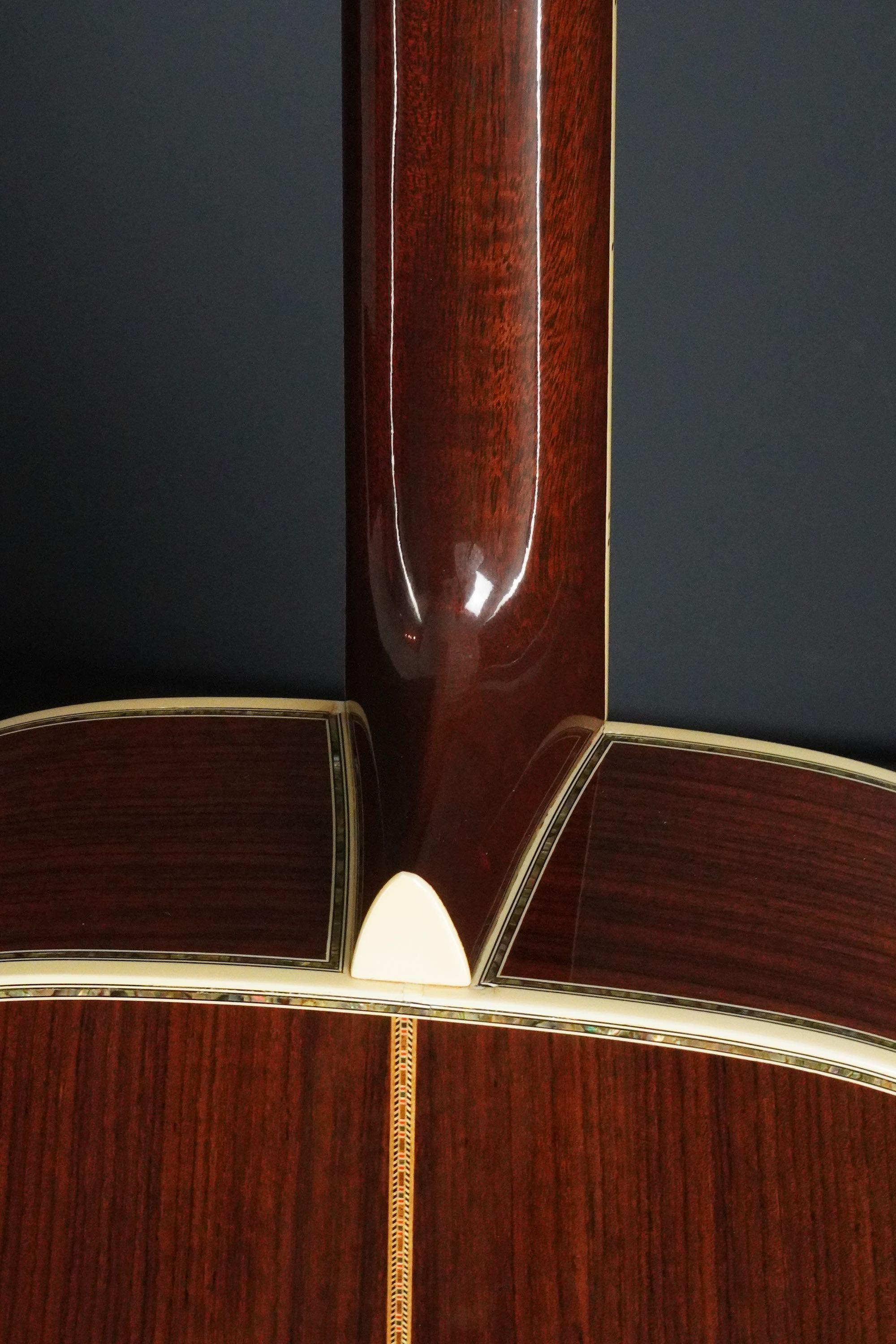 サイド&バックもD-45らしい、とても美しい柾目のイーストインディアンローズウッドが使わており、赤褐色の木肌には所々で黒い筋が通る、古い時期の木材のような風合いを持った良材で、そこに45スタイルらしい細かくカラフルなセンターストリップやアバロントリムが合わさり、魅惑的な素晴らしいルックスとなっております。