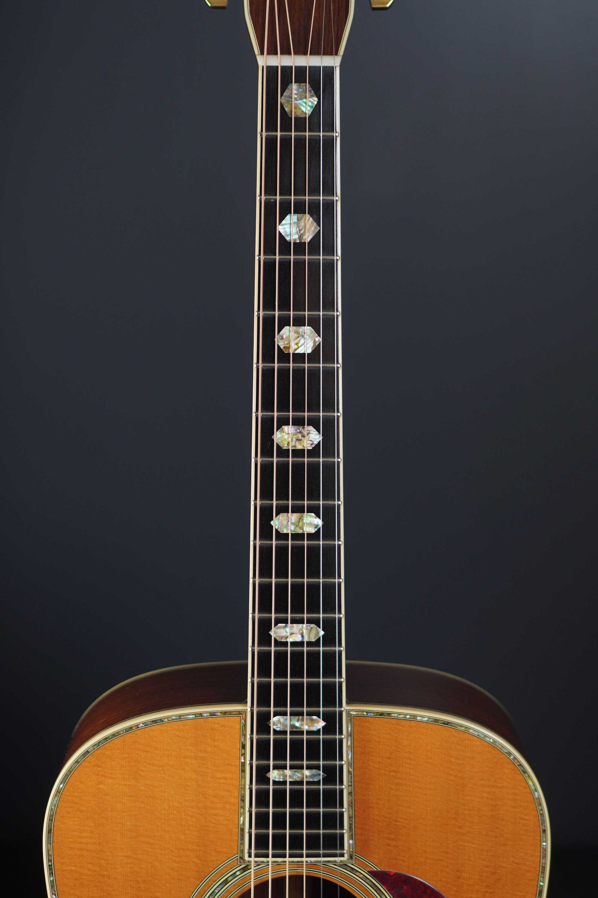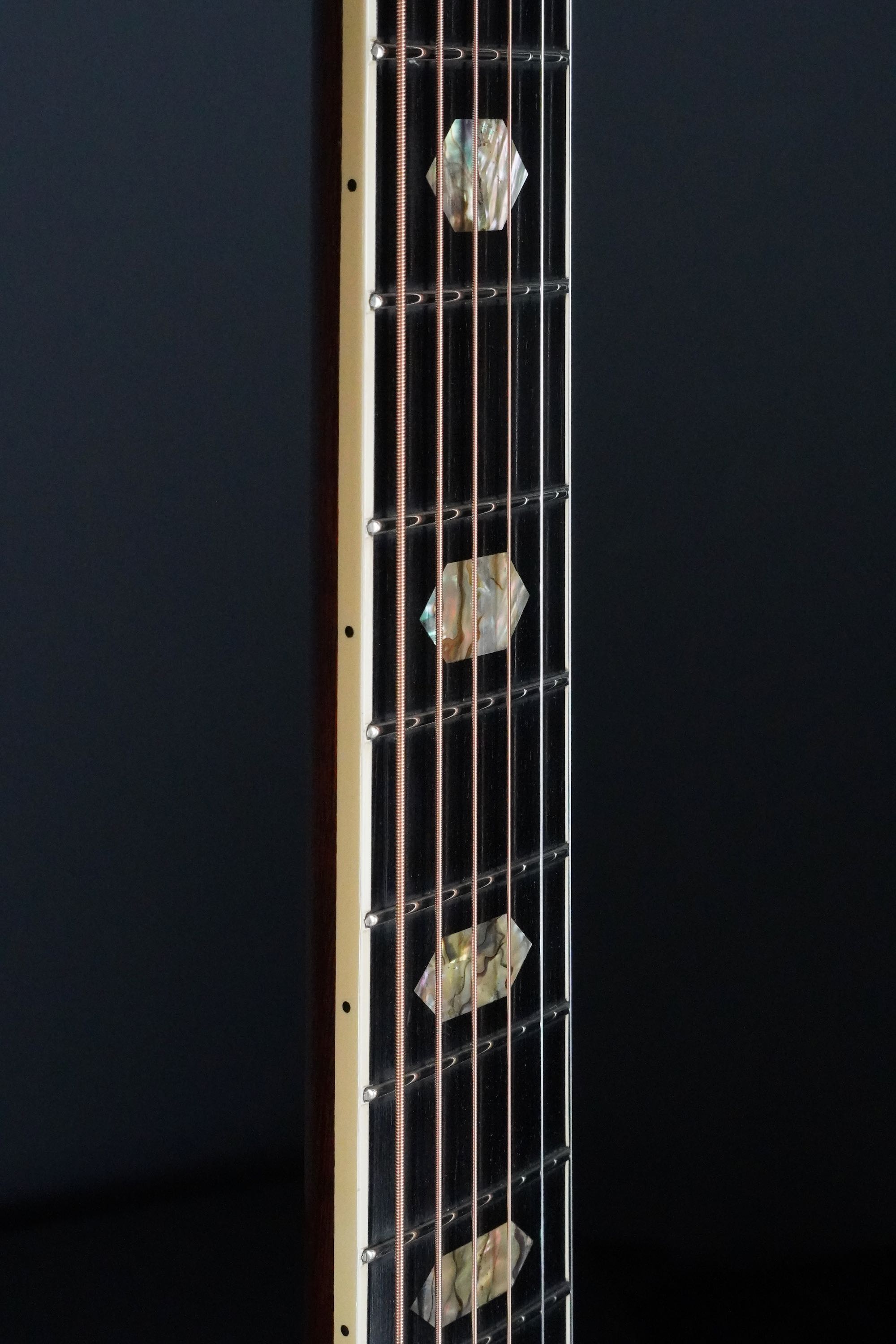 ネックも、エボニーの黒い指板に鮮やかなヘキサゴンのポジションマークが印象的で、アバロンの複雑な色味が鮮やかに輝きに、角度によってキラキラと表情豊かに変化します。
