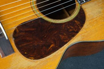 色褪せたベッコウ柄のピックガードも30年代独特の色味を持つオリジナル、ベッコウ柄のバインディングやシンプルなサウンドホールのパーフリングなどは18スタイルらしい仕様で、ベリーブリッジはブラジリアンローズウッドで作り直されておりますが、指板やブリッジがブラジリアンローズウッドなのもこの時期の特徴です。