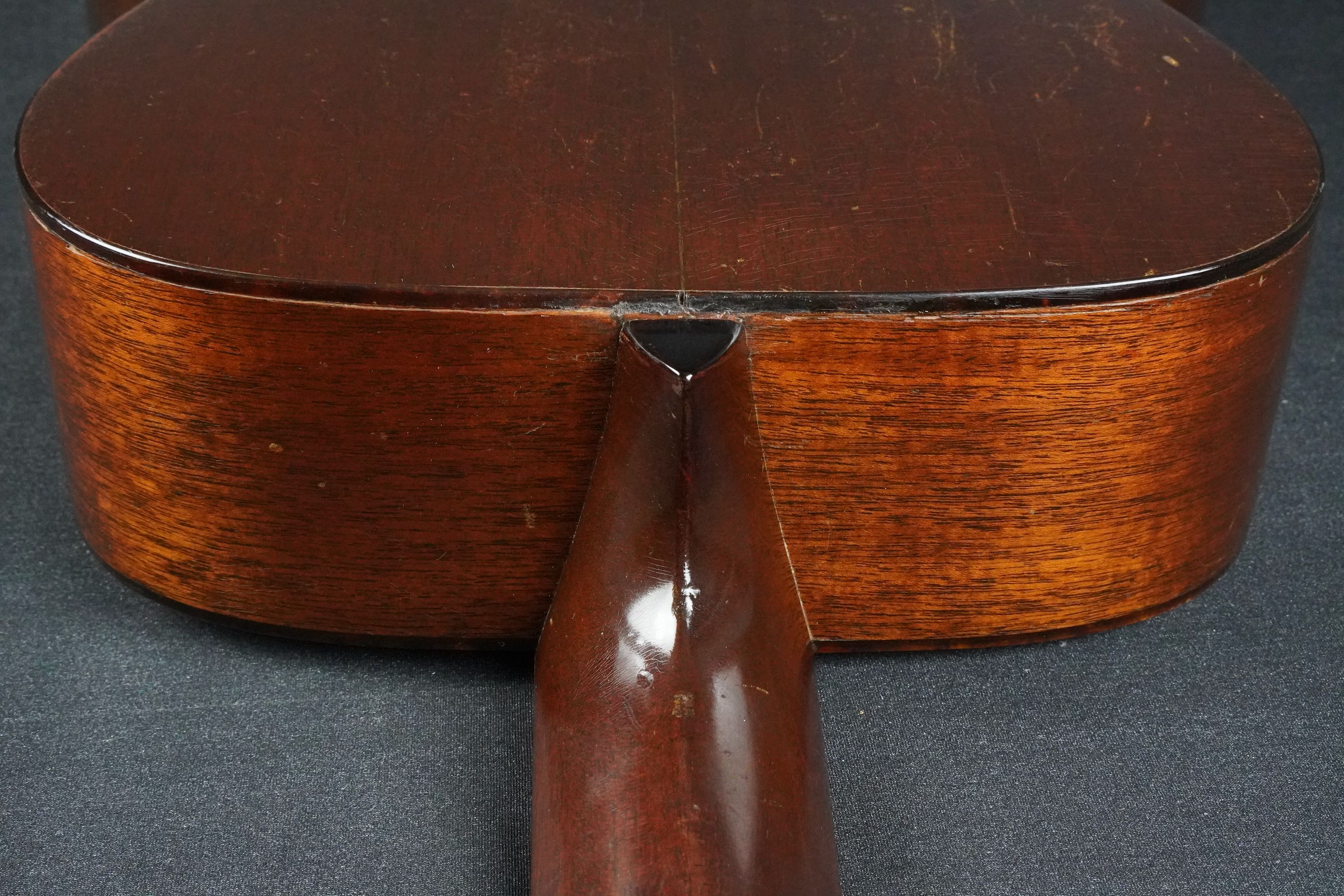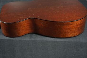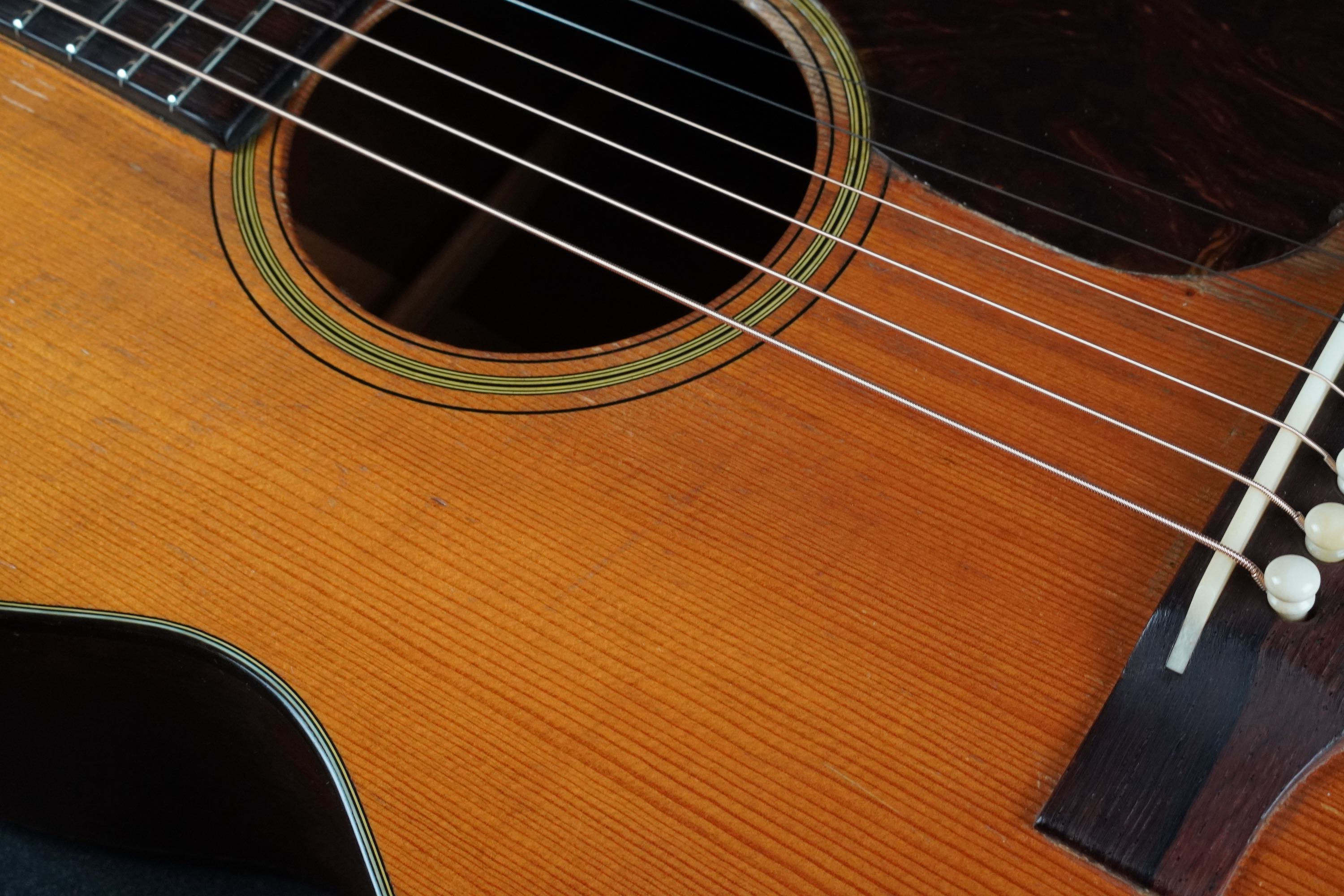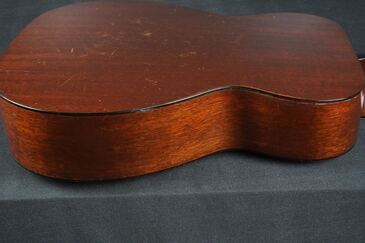 単音で弾いた時の出音の存在感の強さ、コードをストロークするとグイグイと音が前に出る感覚は、この小さなボディとは思えないような響きで、音の艶っぽさや深み、音の立ちや抜け等々がどれも素晴らしく、プリウォー品でしか味わえない野太く枯れたマホガニーサウンドは別格です。