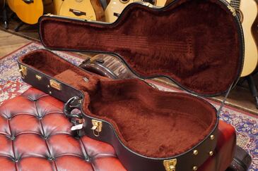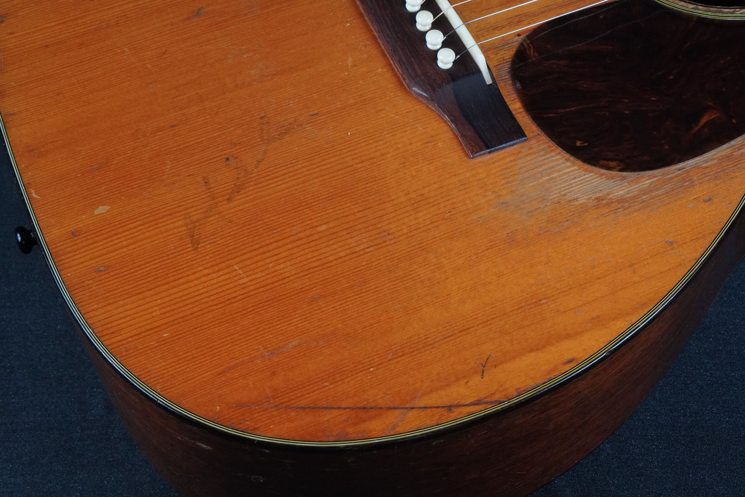 ネックの首とヘッドトップにオーバーラッカーが有り、ネックは以前にリセットされた跡が残り、ブリッジベーズの作り直し、リフレット、ナットやサドル、ブリッジピンの交換、以前にピックアップが取り付けられていたようで、エンドピンジャックの穴跡に、太めのブリッジピンが取付けられており、付属のケースはノンオリジナルのハードケースです。