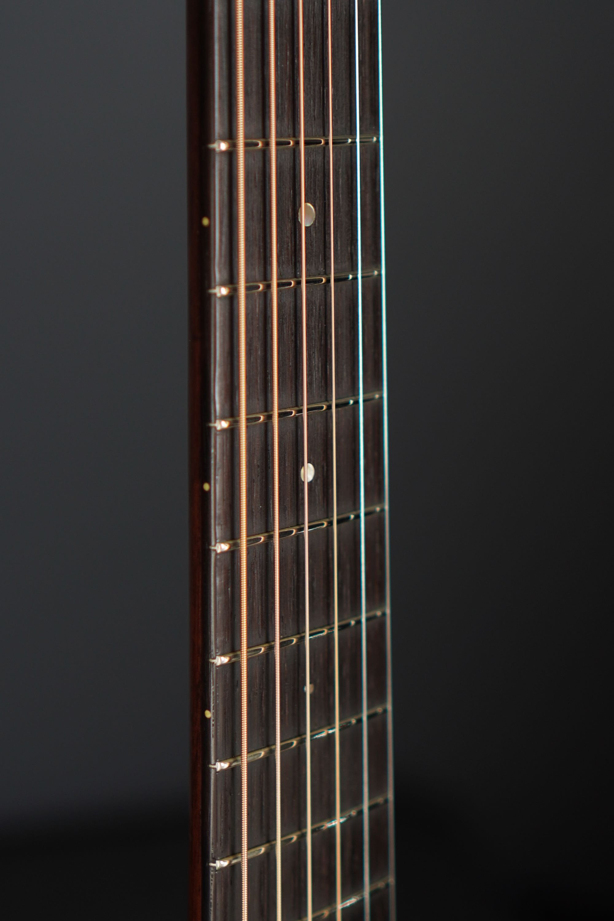ブラジリアンローズウッドの指板にはシンプルなドットのポジションマーク、5F、7F、9Fとシングルドットがだんだんと小さくなり、12Fにはダブル、15Fにはまたシングルの小さなドットが入った、可愛らしいスタイルです。