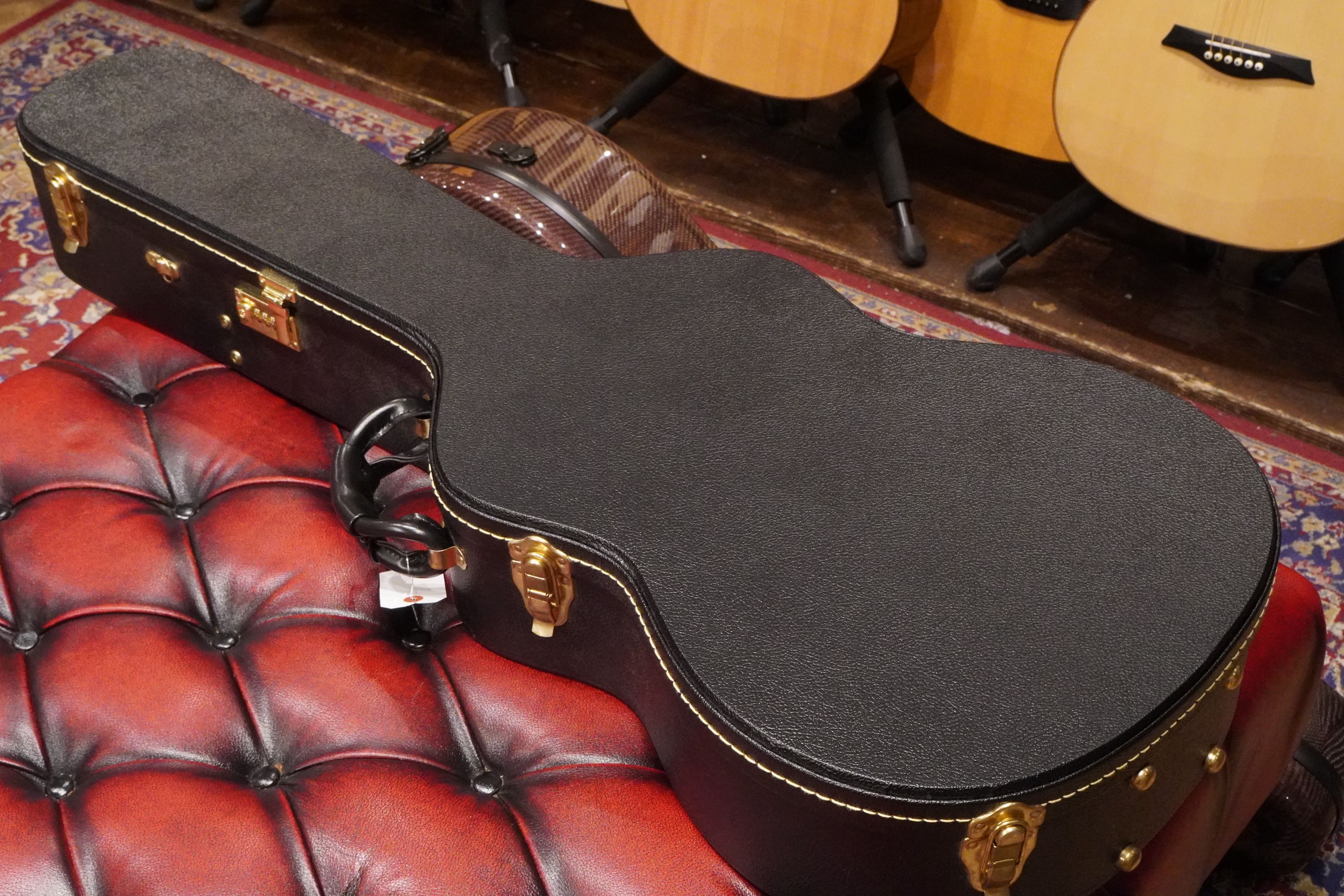 トップはきめ細かな通りの良い木目のアディロンダックスプルース材で、やや明るめに色焼けたこの時期らしい表情、サイド&バックには、こちらも密度が高く美しいホンジュラスマホガニーで、バックのセンターにはブラジリアンローズウッドのラインが細く入っています。