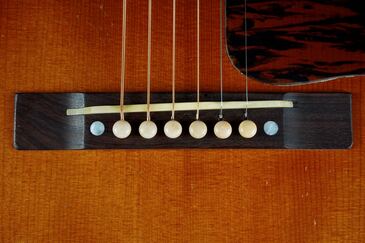 ロングサドル仕様で、ホワイトのブリッジピン脇に、パールのドットインレイ。サドルやブリッジピンは、経年で少し汚れたようにレリックされています!!