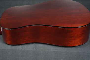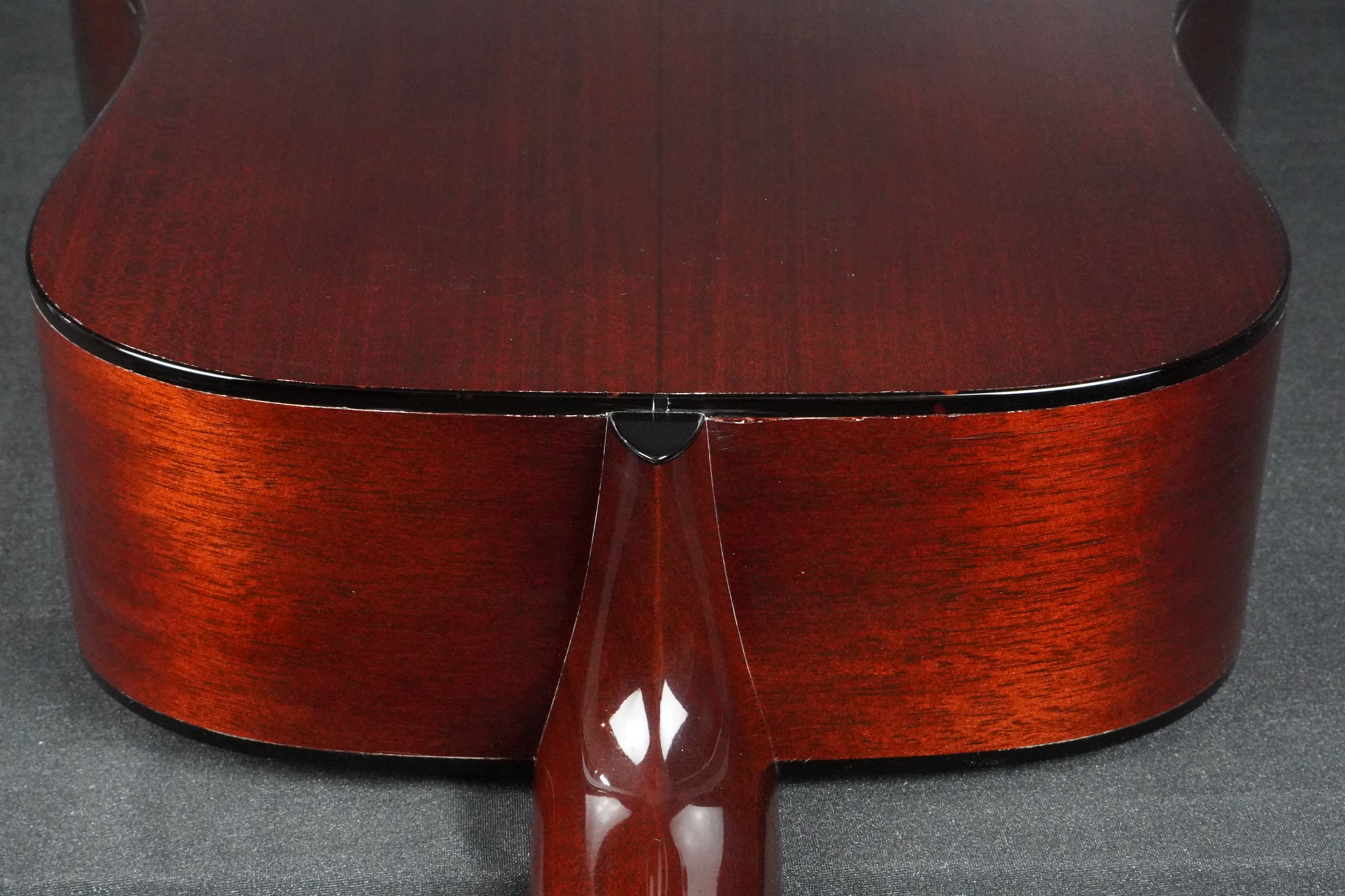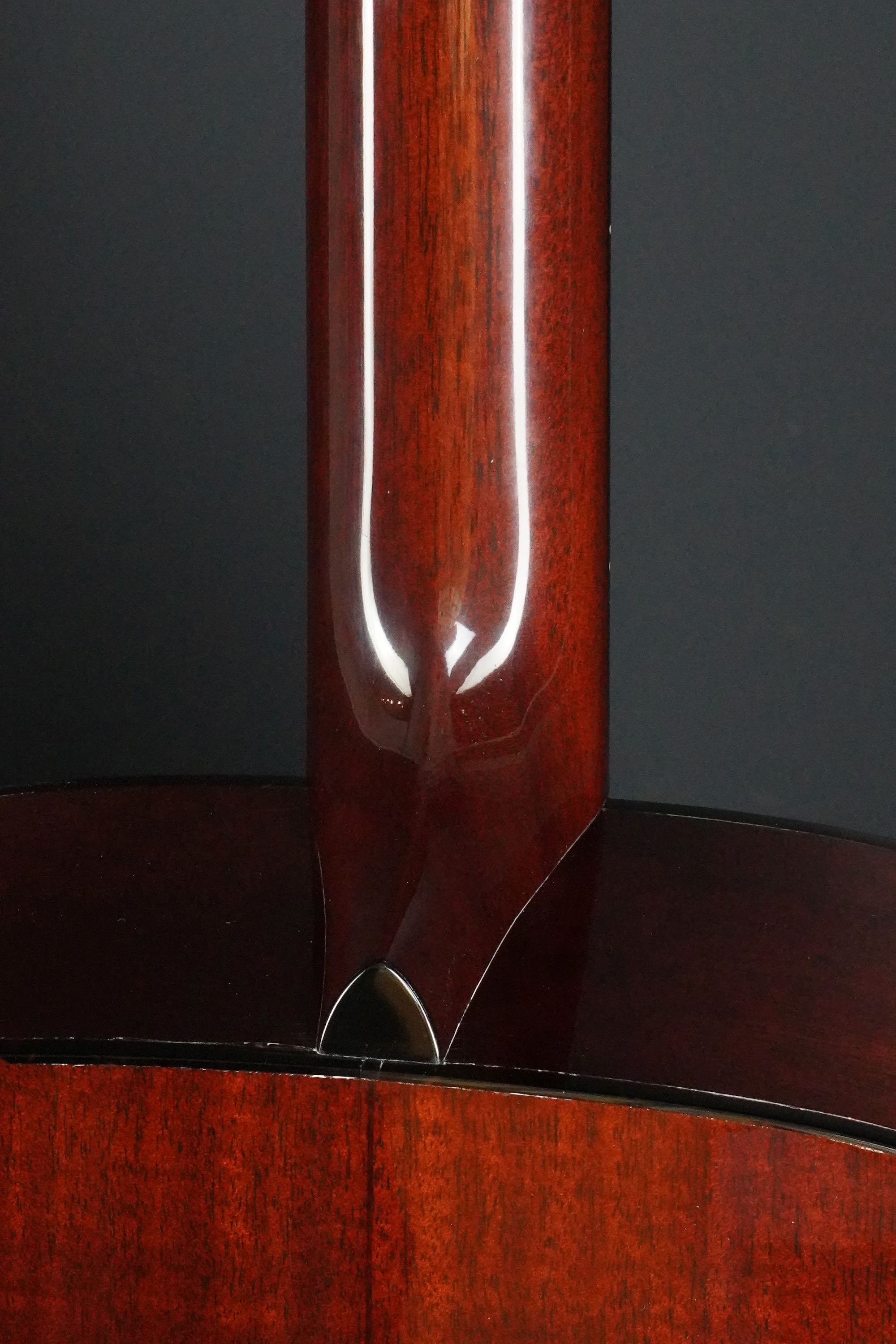 ダークなマホガニーブラウンカラーのフィニッシュは、ややマッドな仕上げで、素直な綺麗な杢目が走っています。