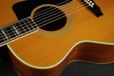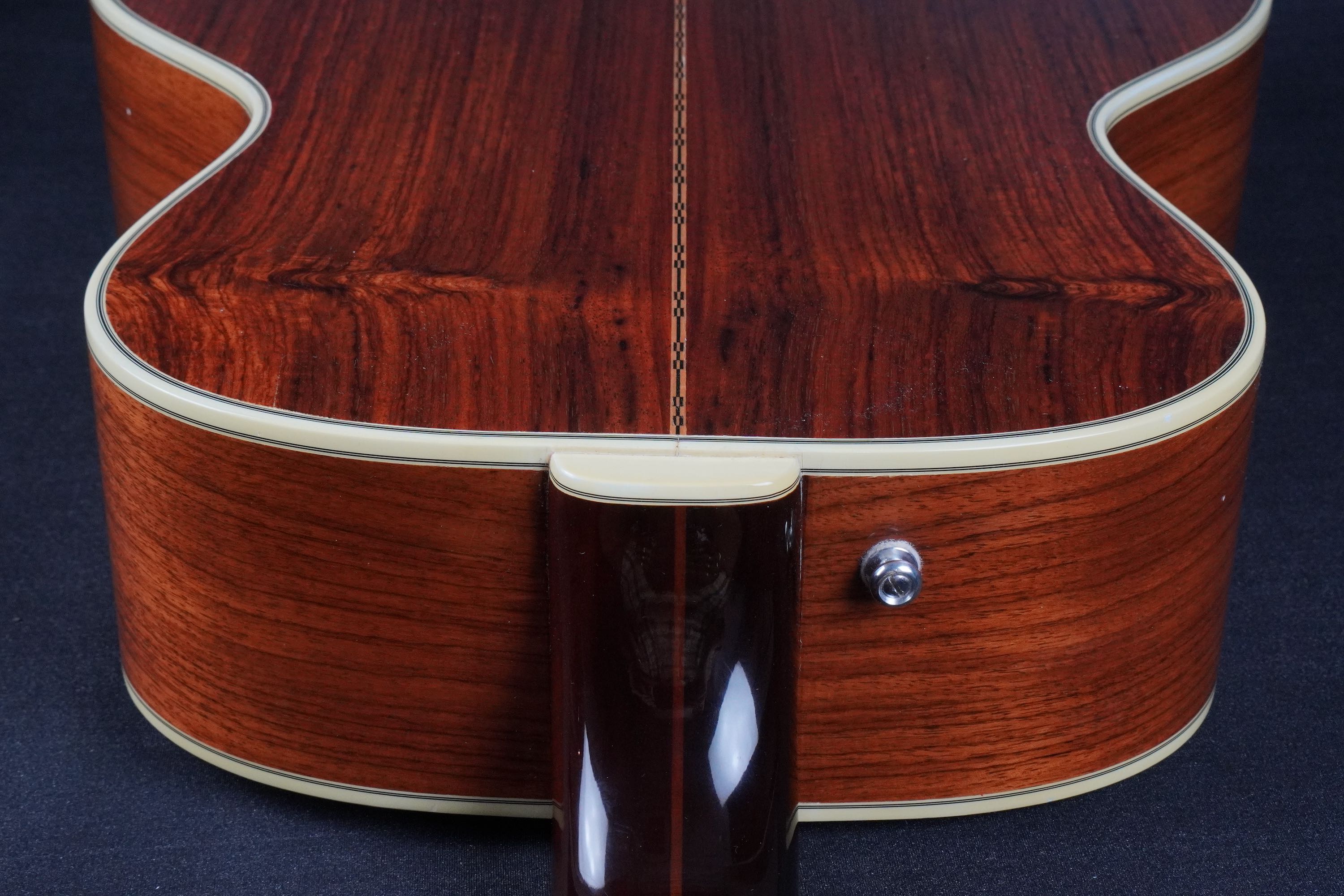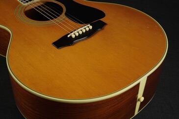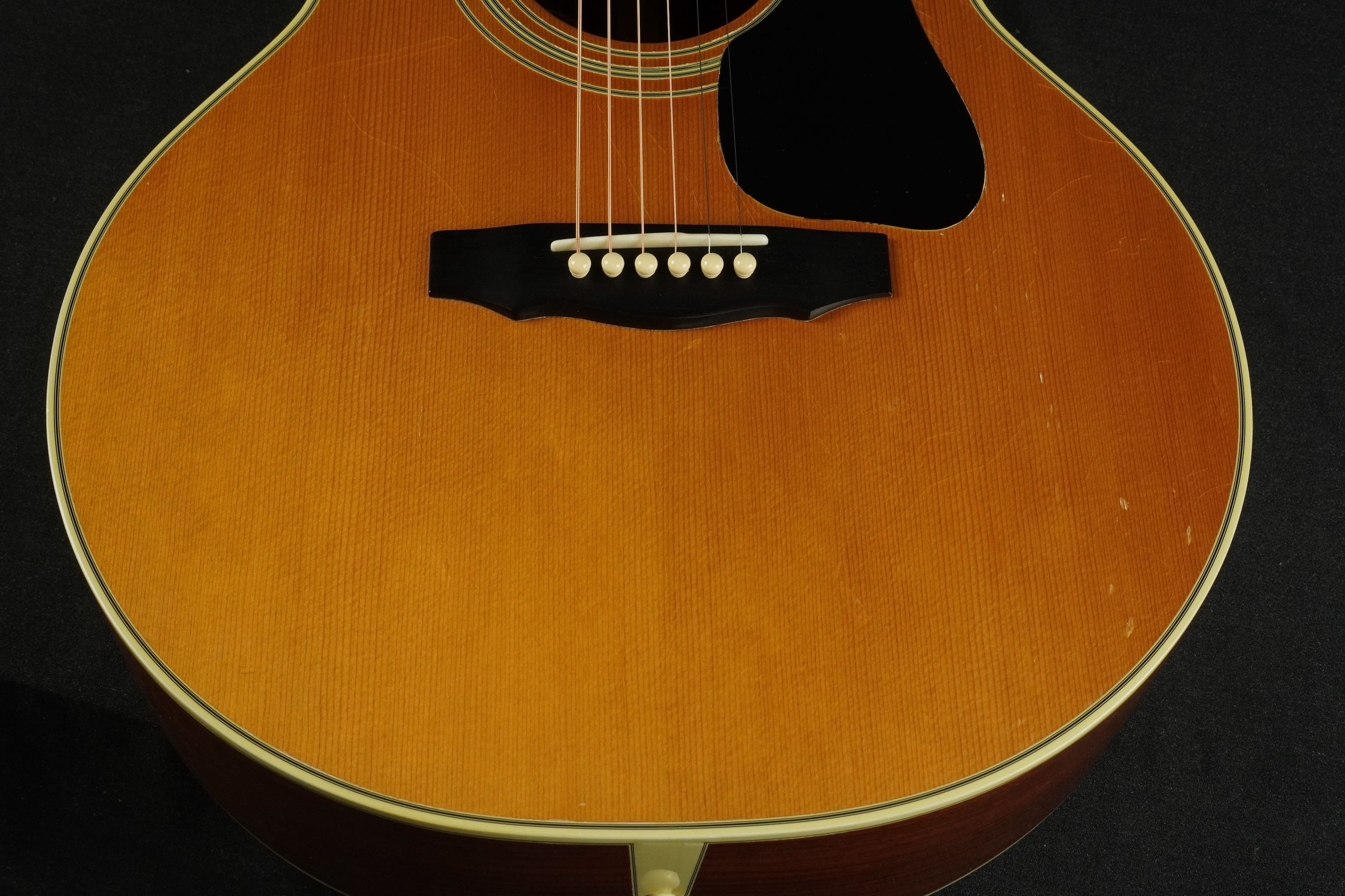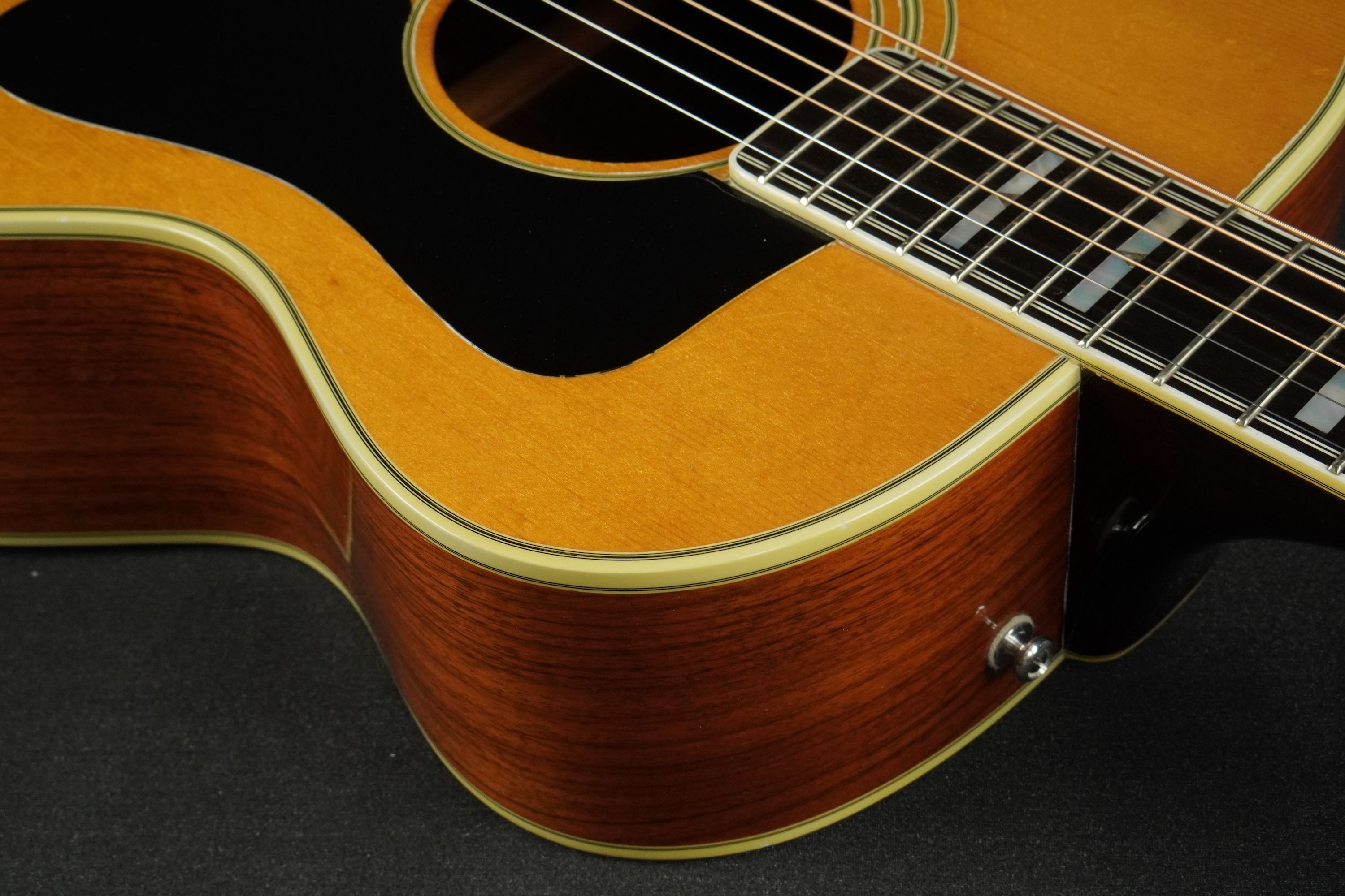 ギルドでは「Aragon」などとも呼ばれるF-30は、MartinでいうOMや000と同程度のボディサイズで25.5インチスケール、スプルース トップにマホガニーのサイド&バックを持ったモデルですので、感覚的にはOM-18のような立ち位置の機種でありますが、1970年代に入ってお尻が丸みを持ったボディシェイプで、胴厚も厚めとなったボディシェイプに変更されており、70年代の初頭にはサイド&バックにローズウッドを用いたF-30Rというモデルも登場します。