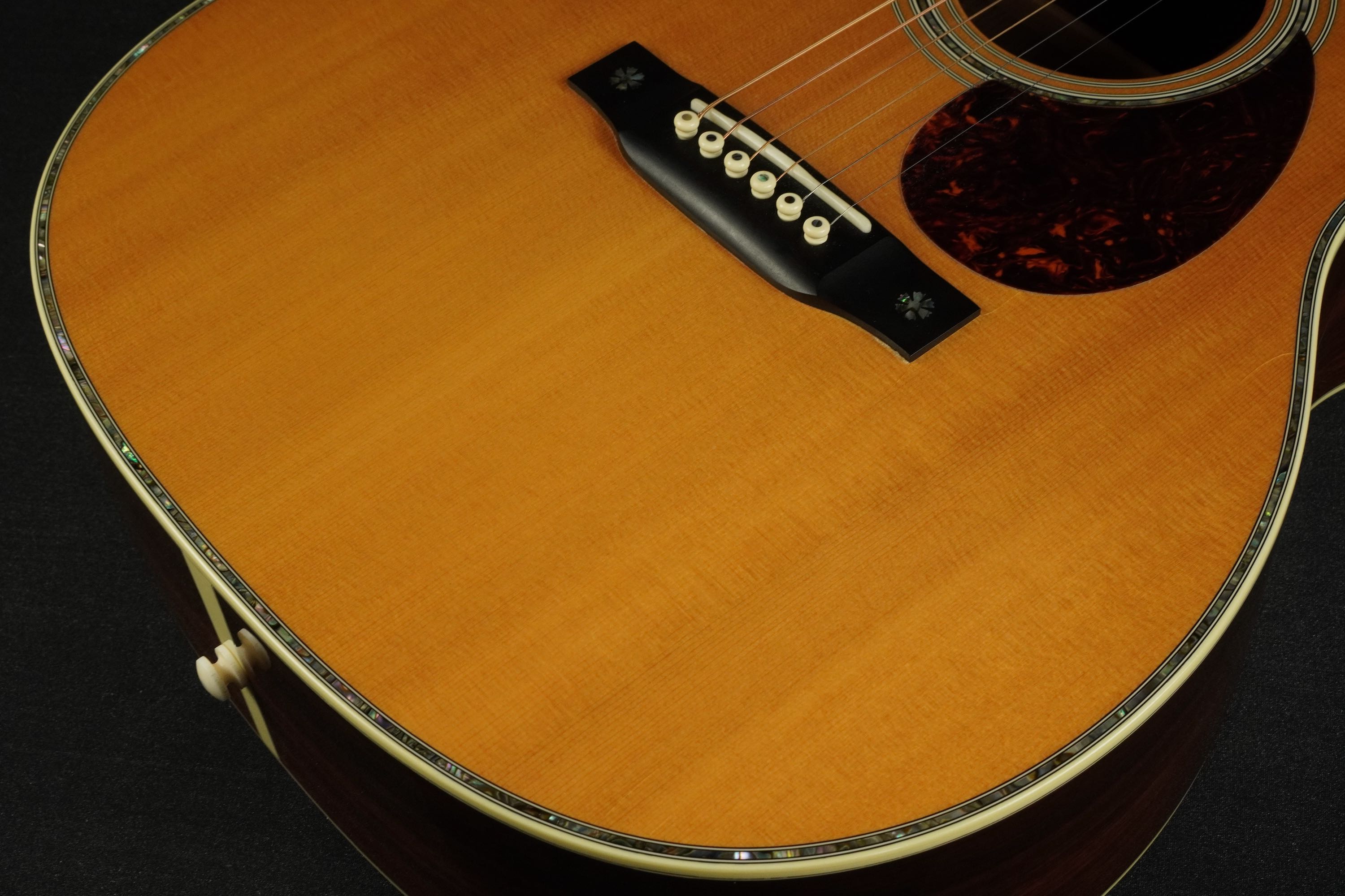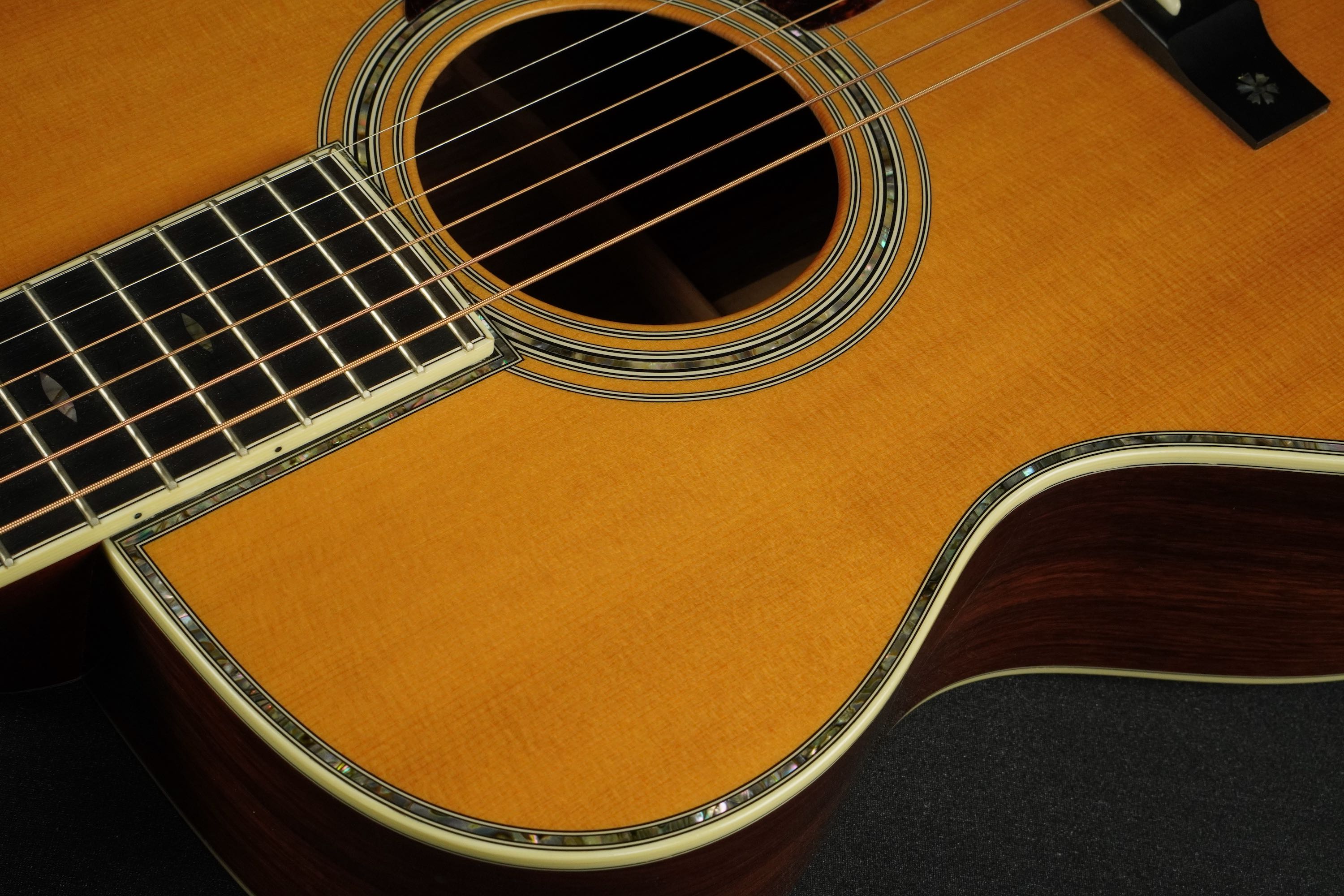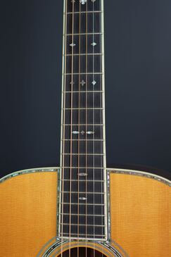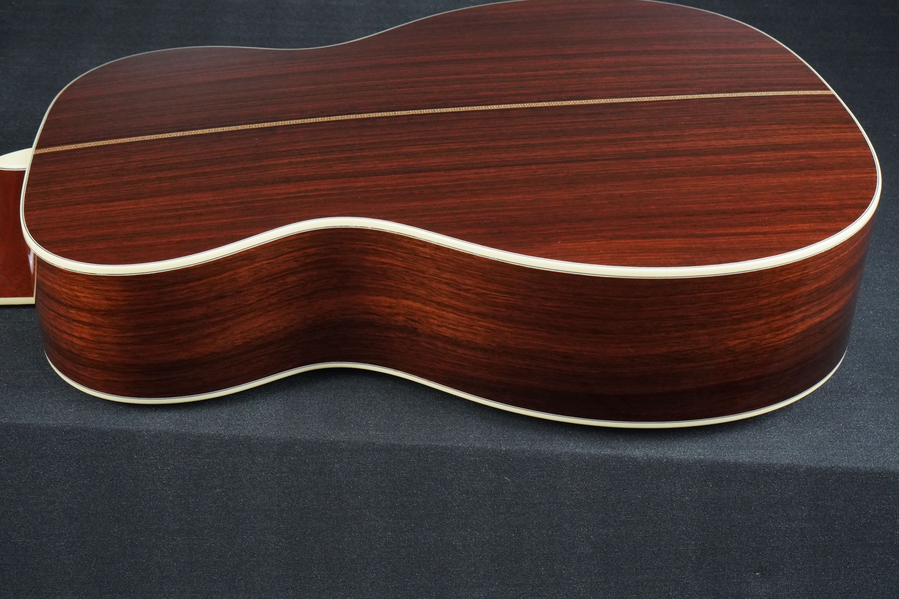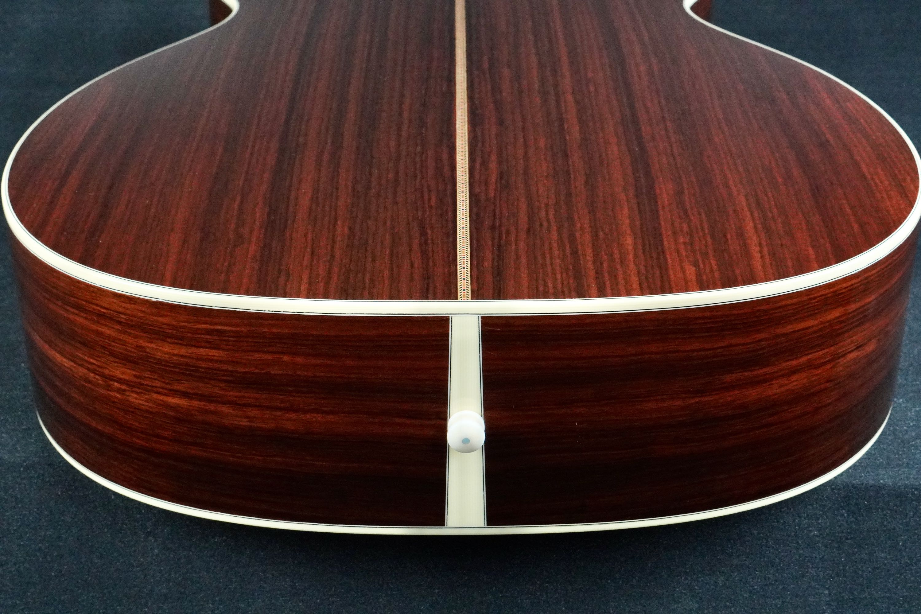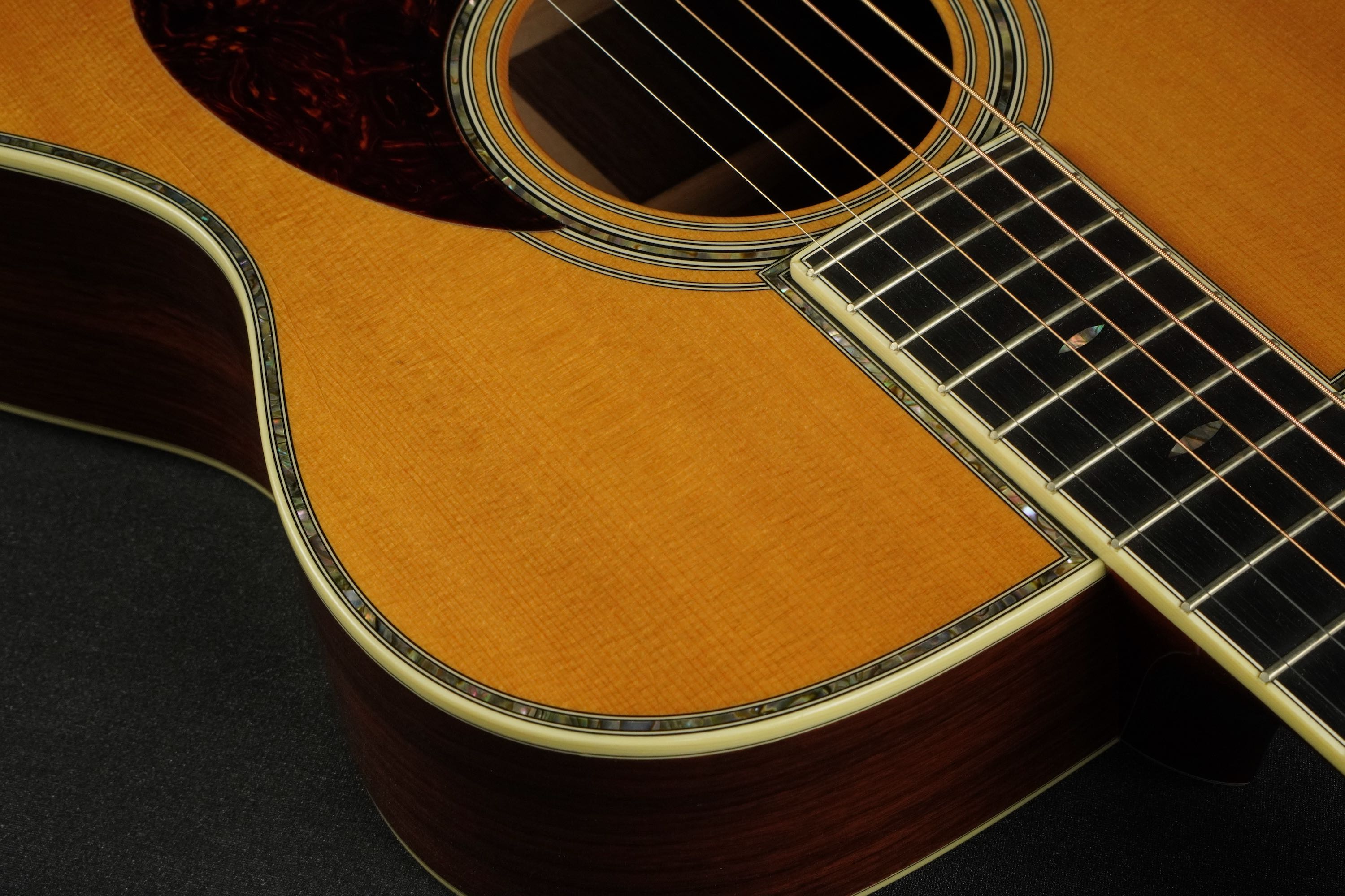 ボディトップの外周には45と同じようにアバロン貝のトリムが入り、白いアイボロイドのバインディングが装飾されています。