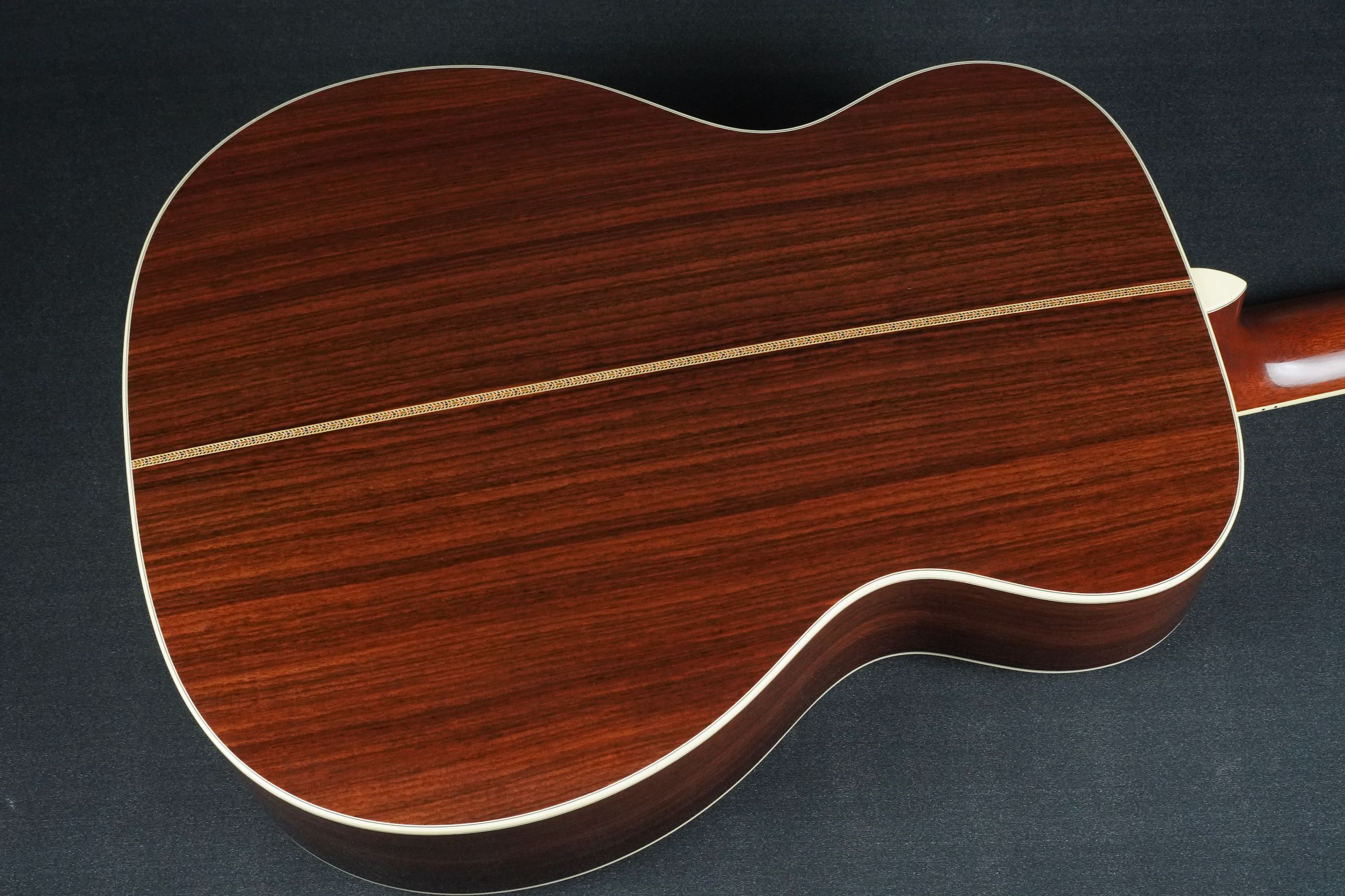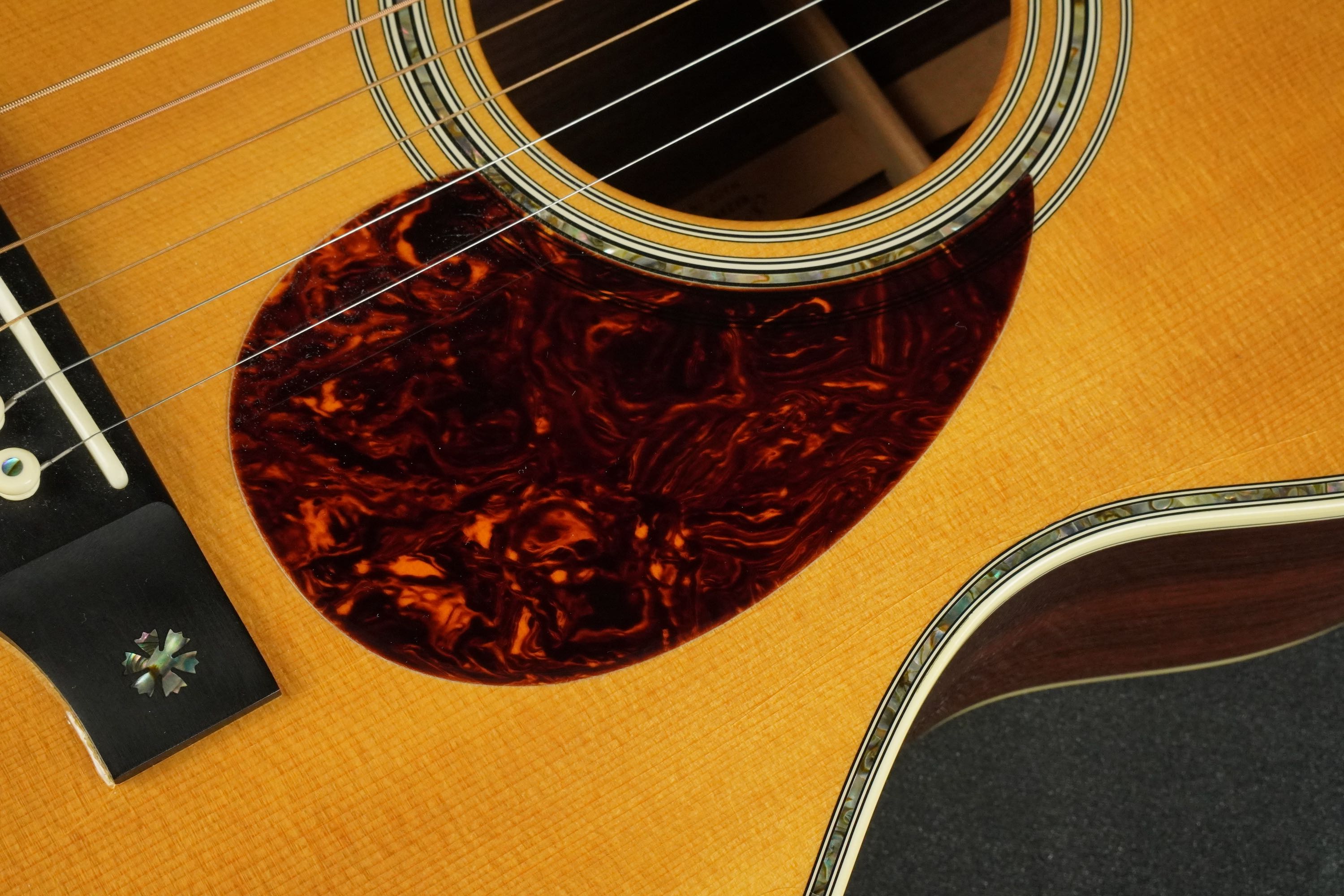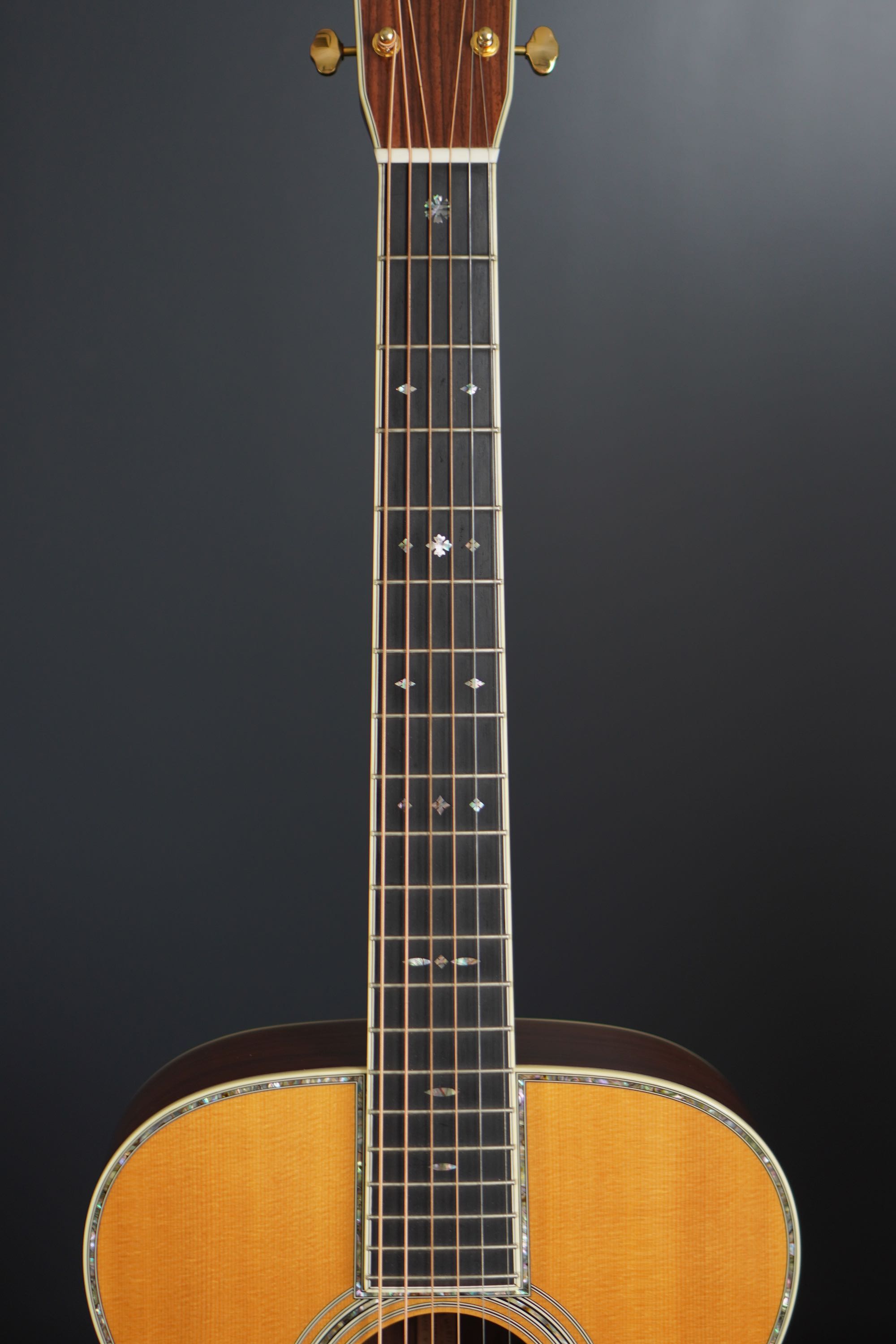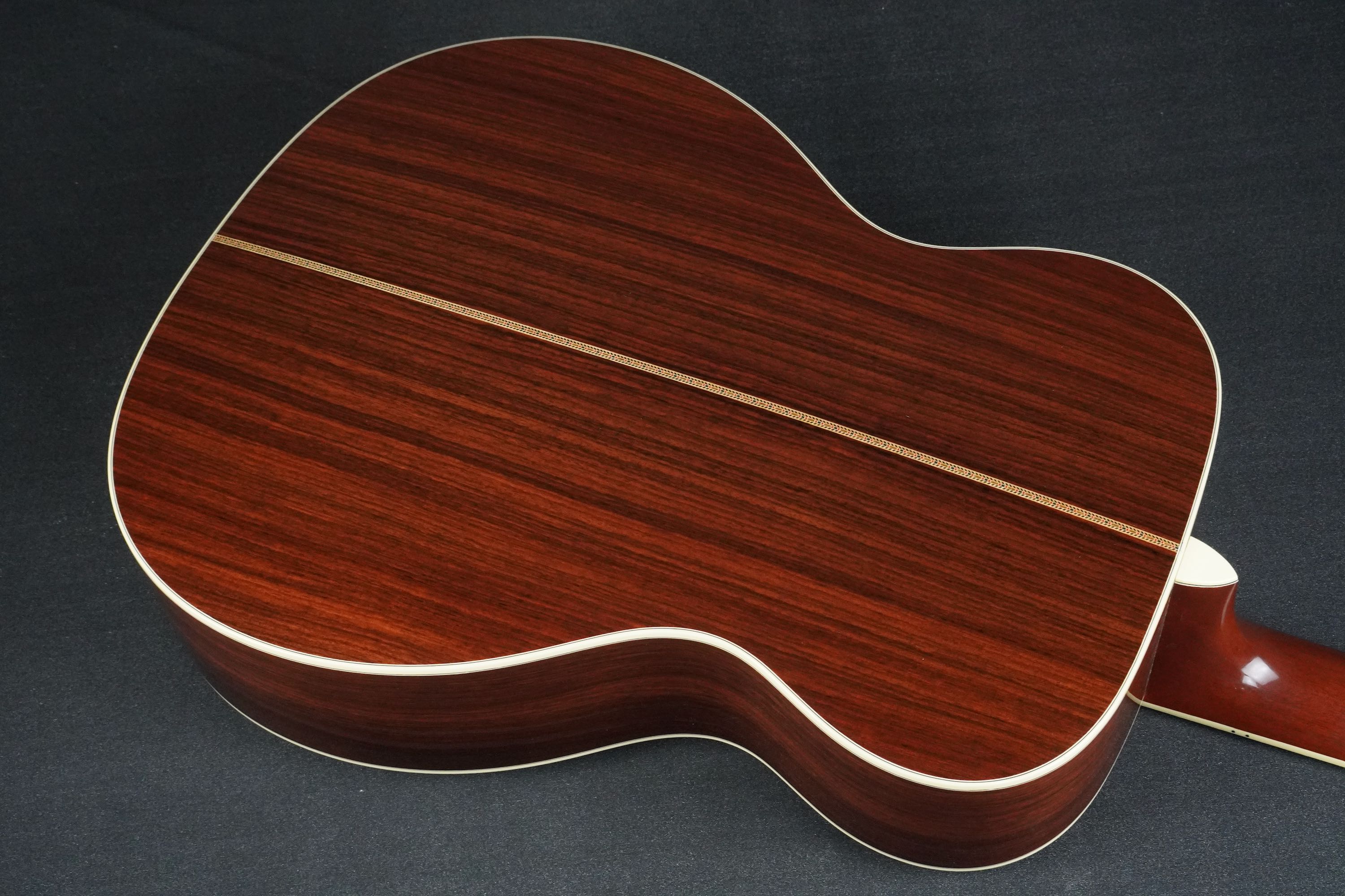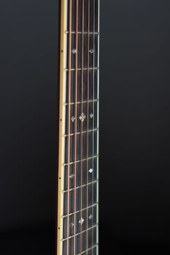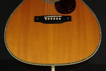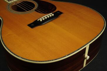 ボディトップの外周には45と同じようにアバロン貝のトリムが入り、白いアイボロイドのバインディングが装飾されています。