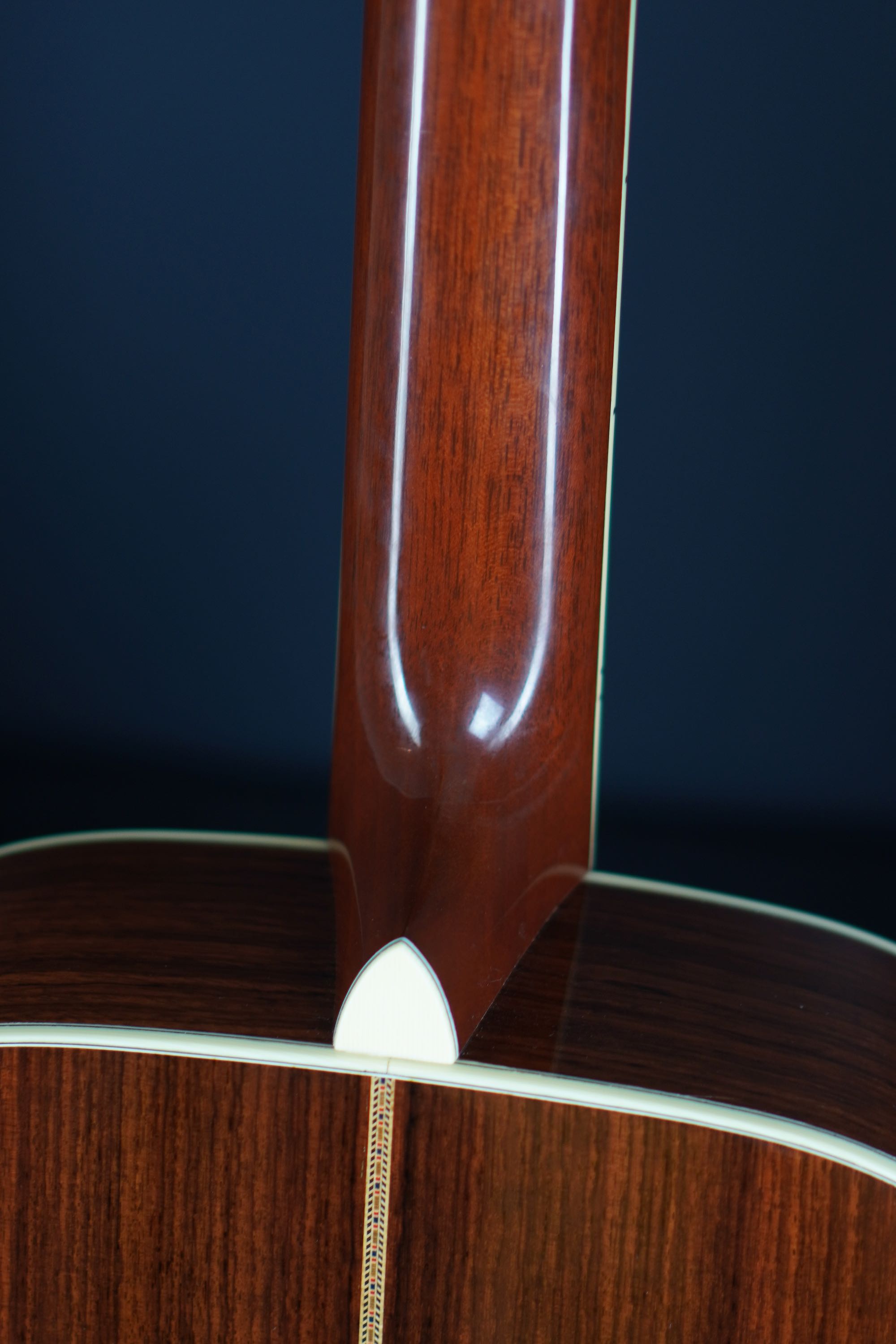 アイボロイドバインデイングの入ったヘッドにはローズウッドの突き板。