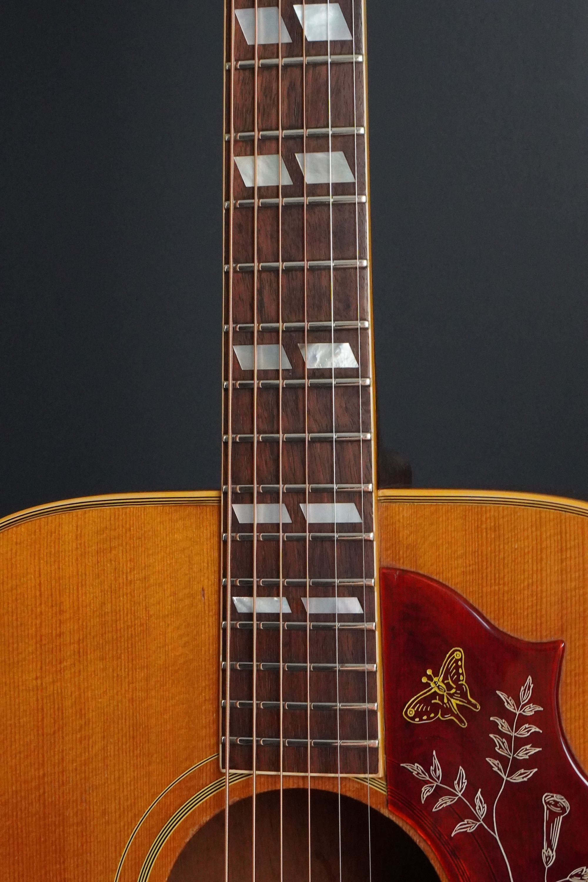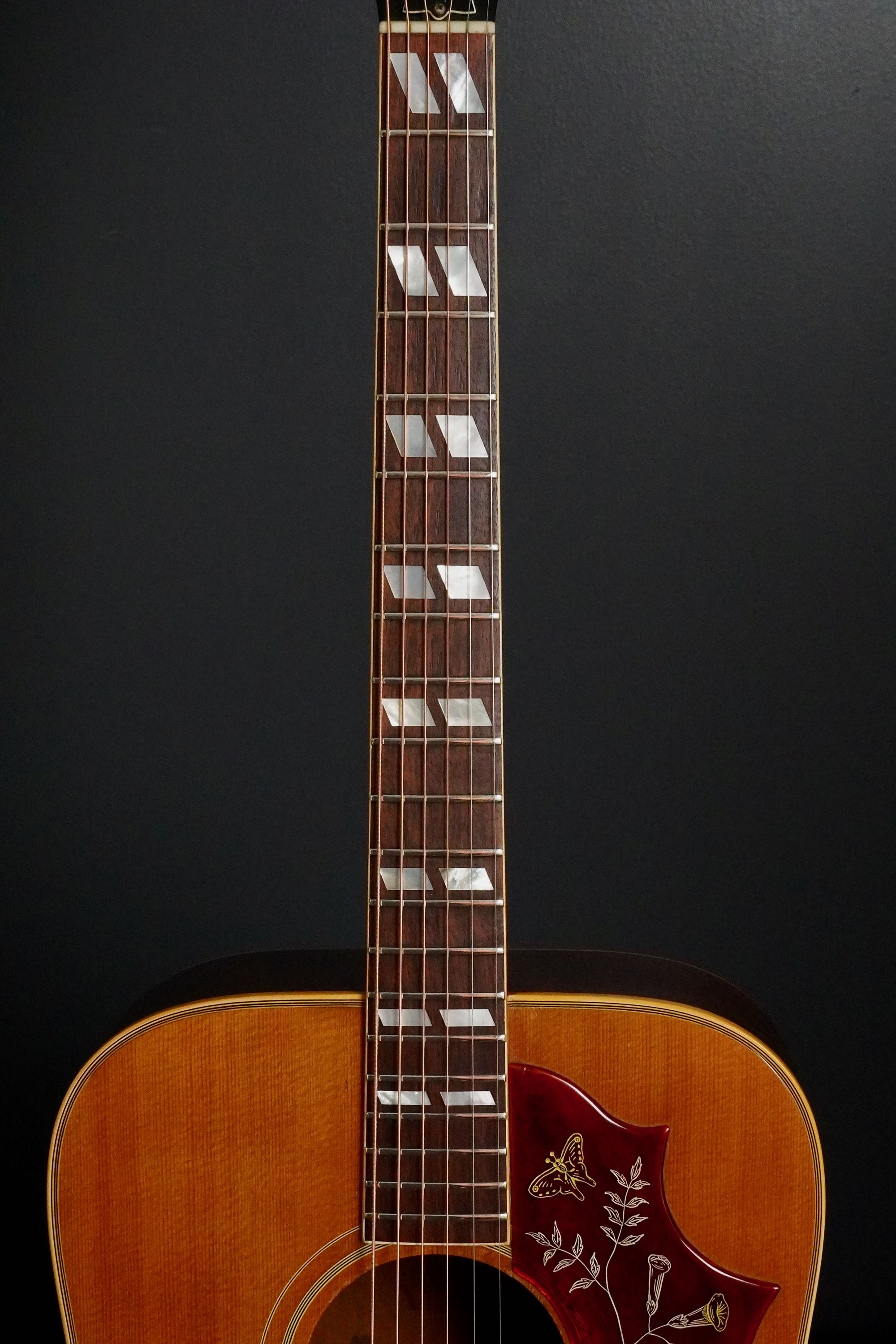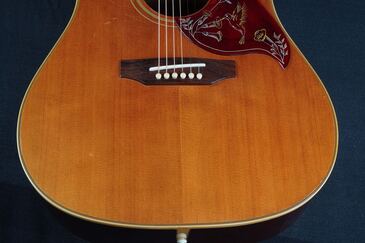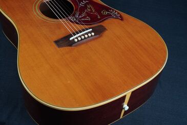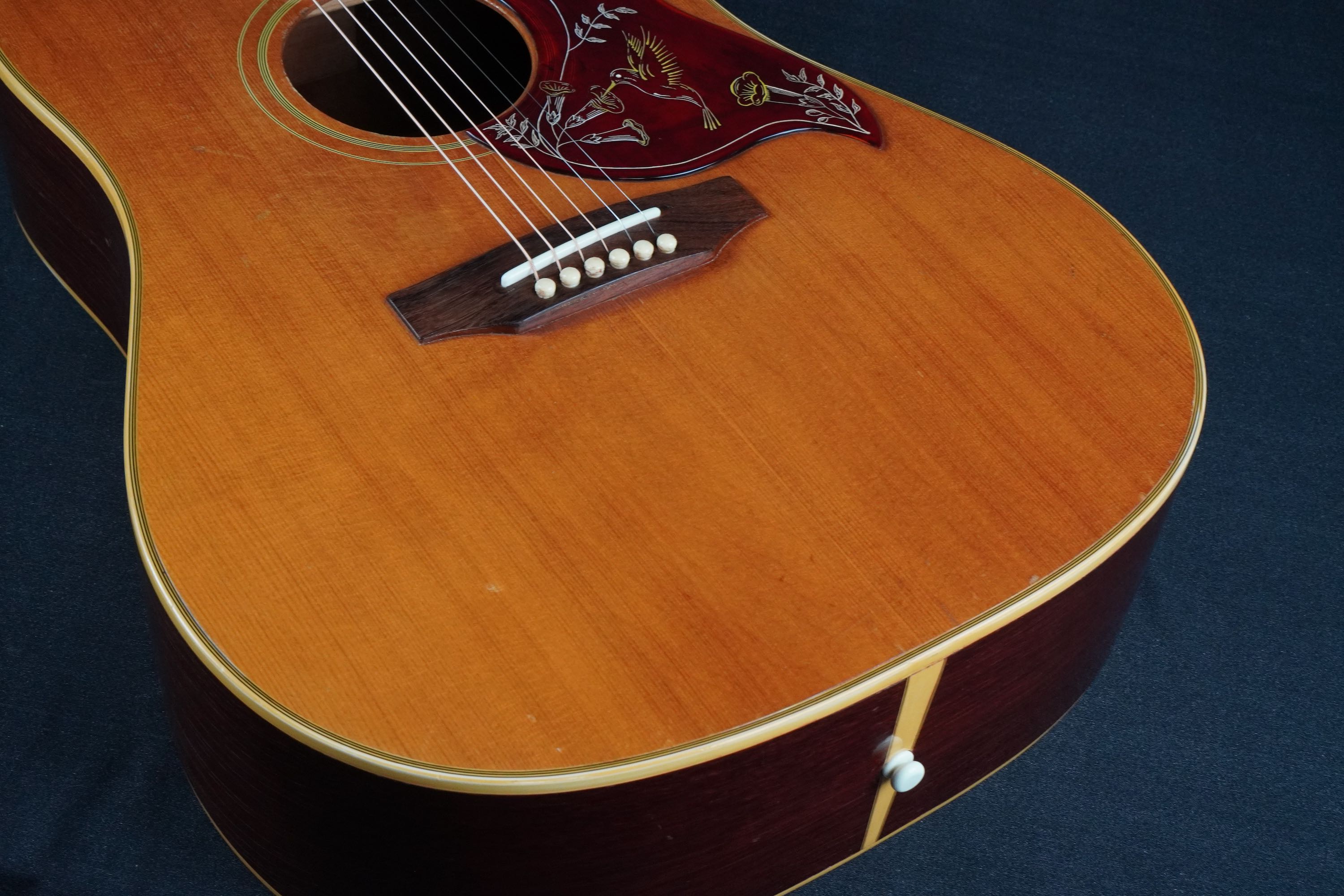ボディはノーマルサドル以前の元々がアジャスタブル時期をサドル改造しており、ブレーシングも60年代後期の、ややガッチリし出した頃ですが、ダブルXになる以前、ネックグリップもナローからレギュラーグリップになった頃ですので、ギターの鳴り方は69年頃のハミングバードに近い感じです。