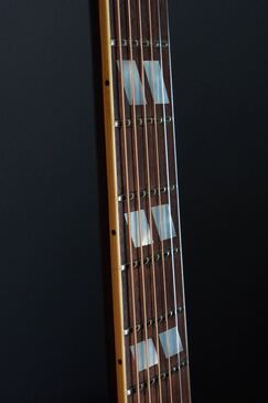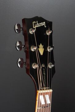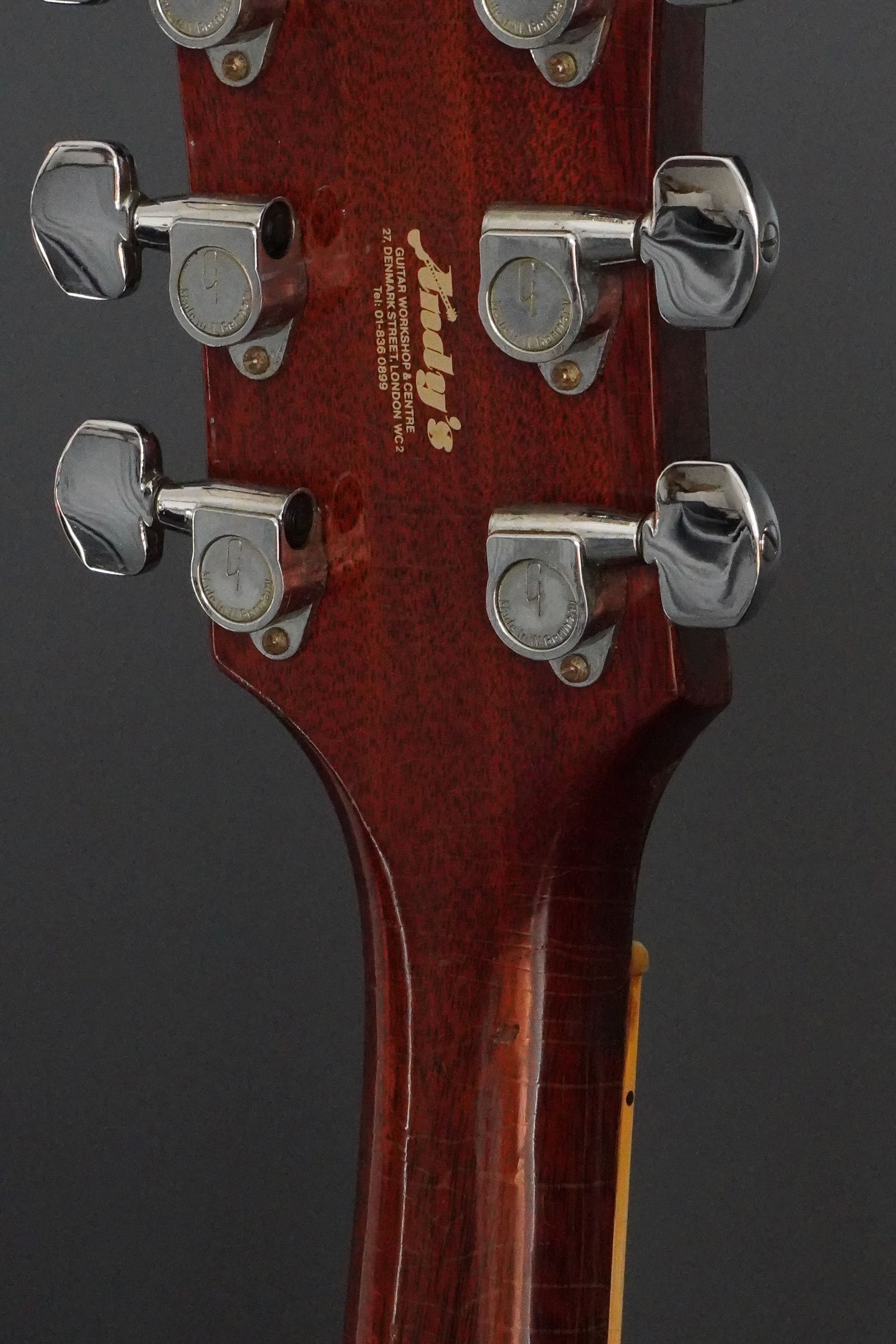 3ピースでボリュート無しのマホガニーネックは、ナット幅が42.8mmとナローネック以降のレギュラーグリップですので、69年前後のような仕様ですが、ヘッドシェイプやヘッドのGibsonロゴ、トラスロッドカバーは70年に入った頃のスタイルで、ペグはG刻印のシャーラーであったり、ヘッド裏には「MADE IN USA」の刻印も入っております。