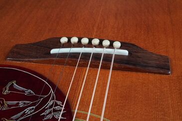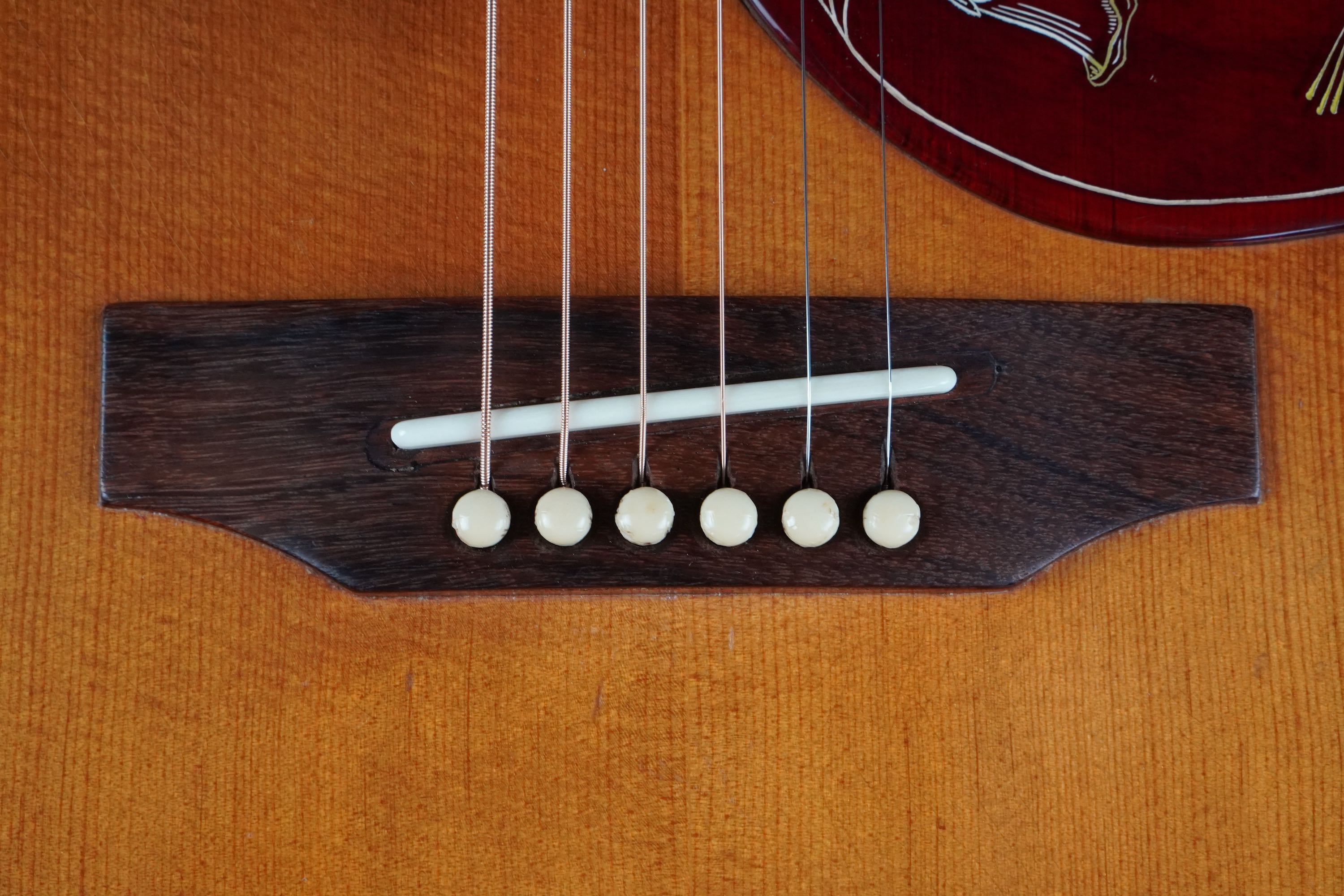 厚めのハミングバードのピックガードには、ネジ止めは無く、ローズウッドのダウンベリーブリッジには、元々アジャスタブルブリッジでしたが、現在はアジャスタブルのブリッジスロットを埋め、新たにノーマルサドル仕様に改造されております。