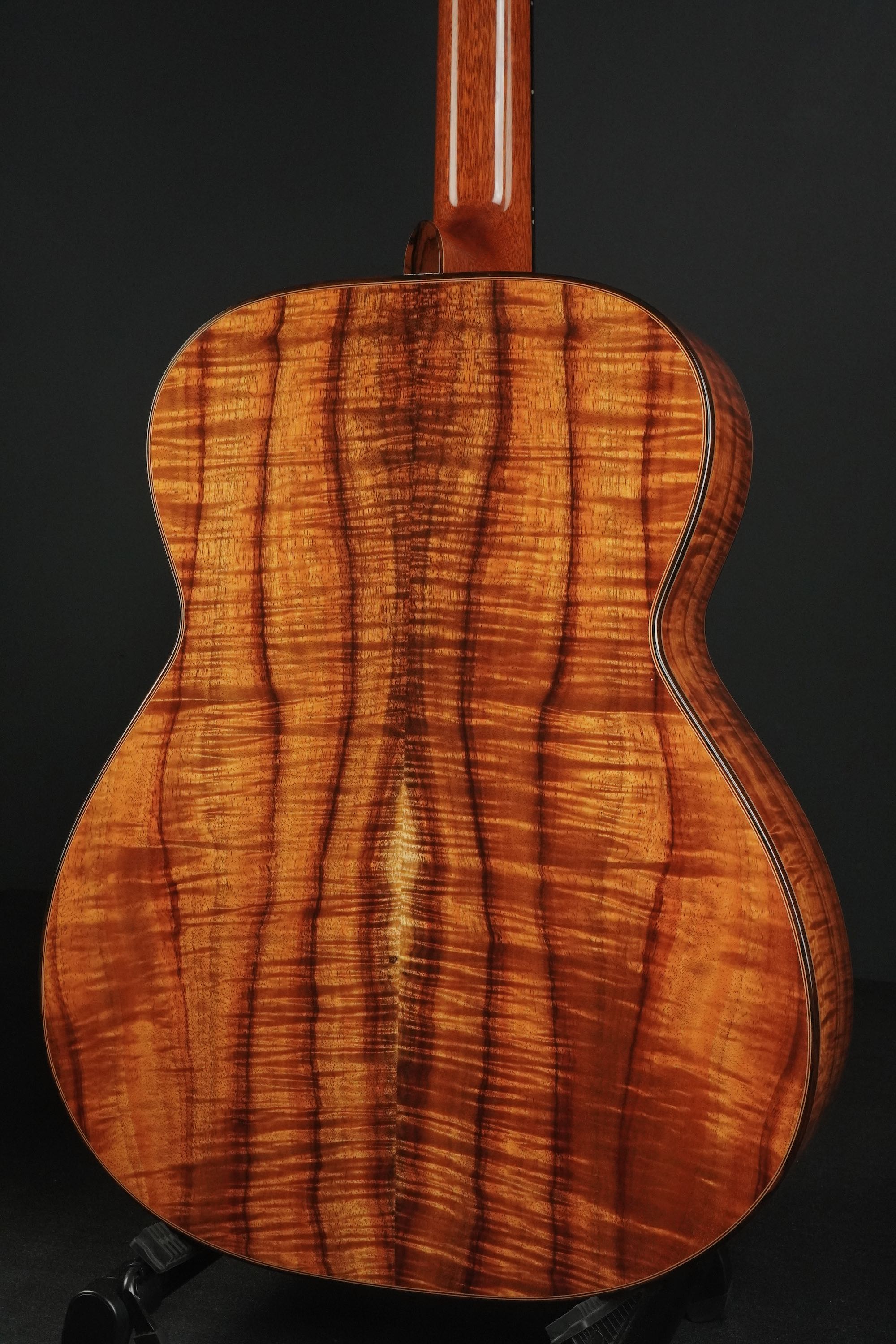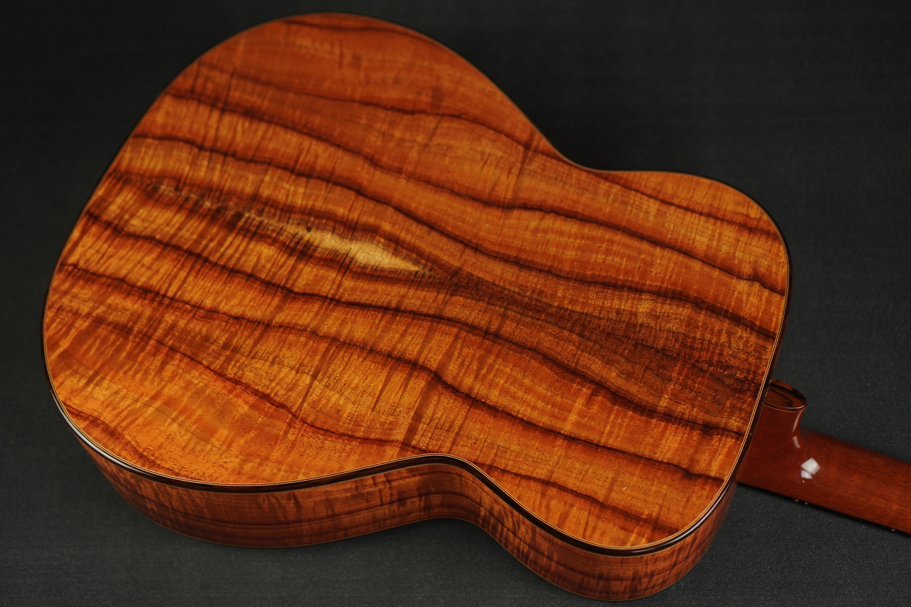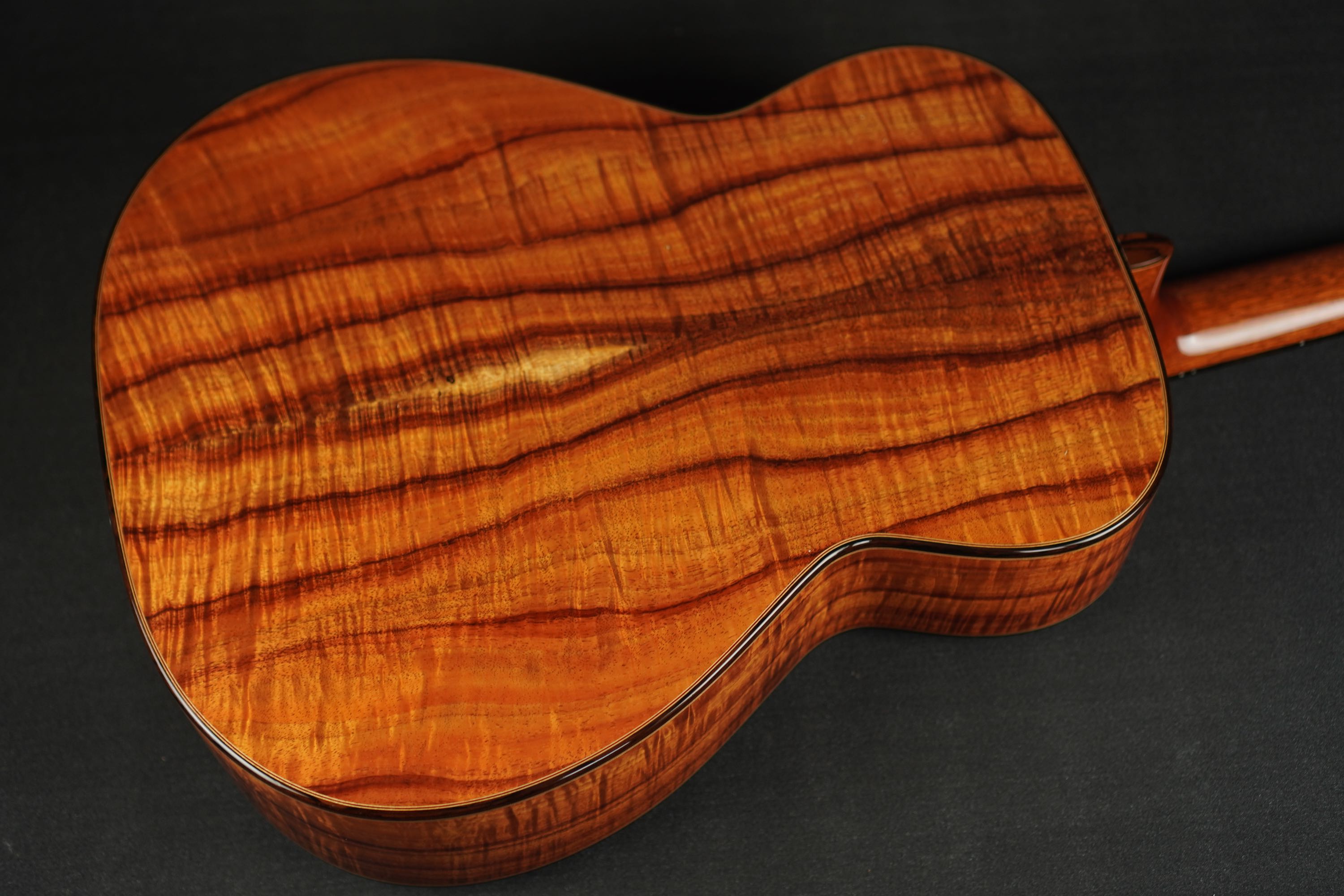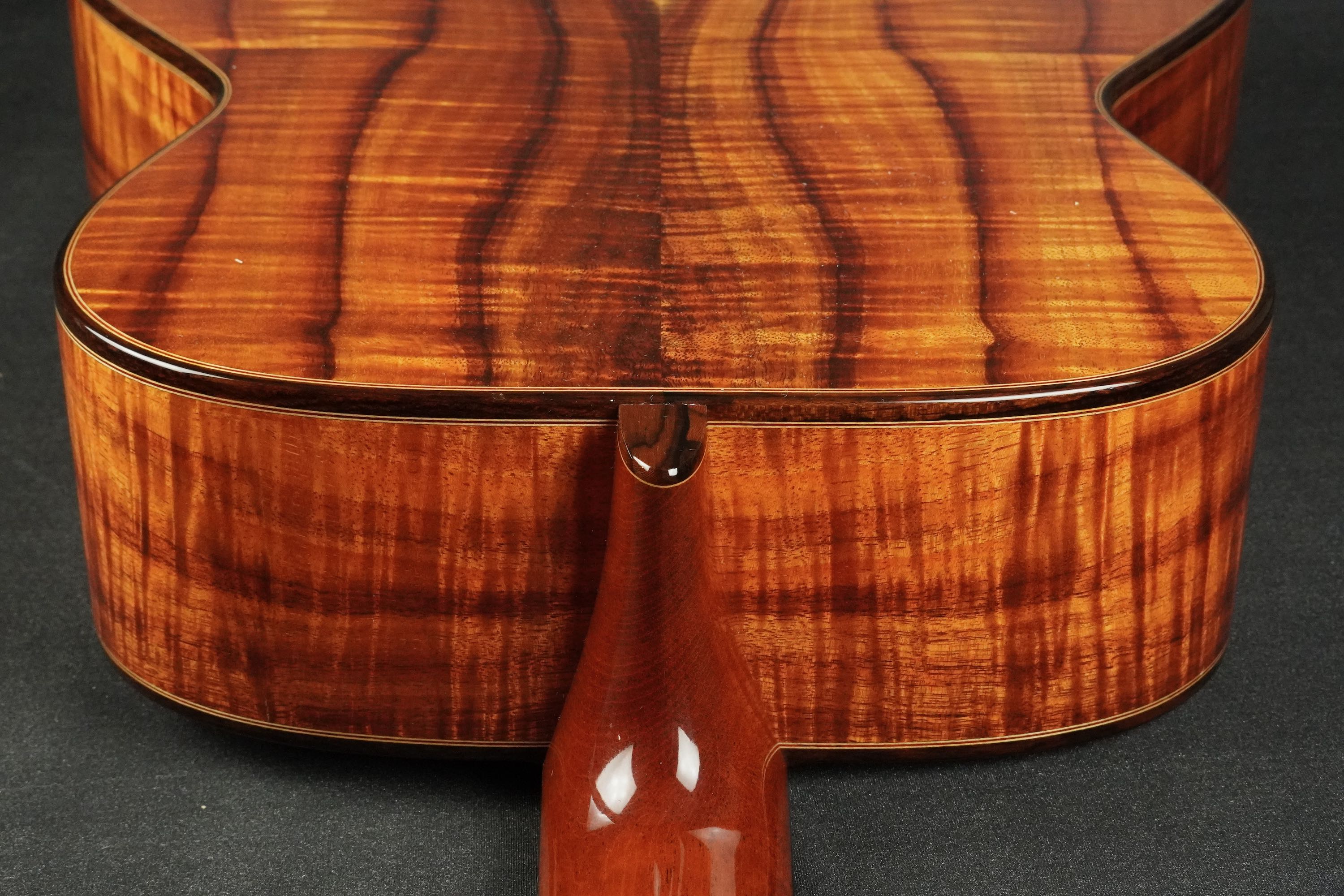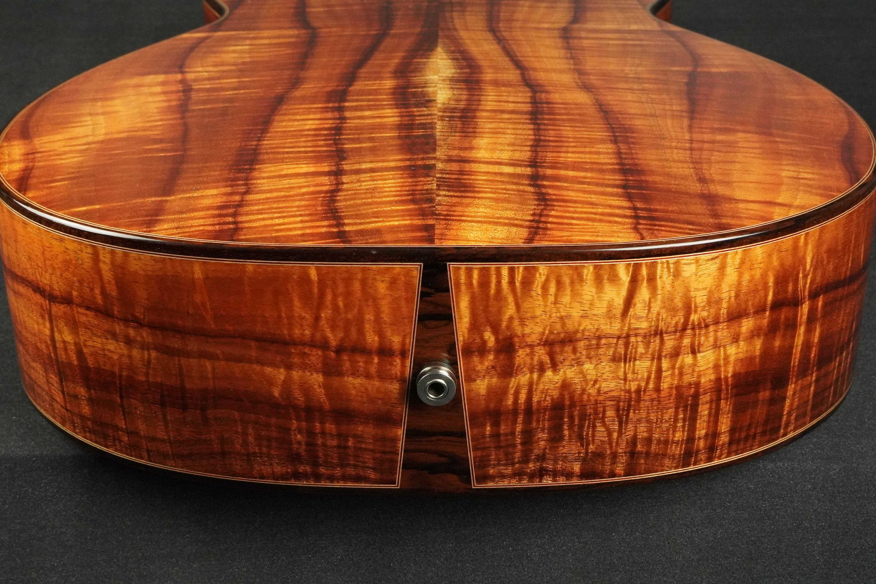 ブックマッチのセンターには仄かにサップが入り、濃い冬目の黒いラインが幾筋かやや暴れて流れ、フィギアドの杢目もビッチリと入りながらも整い過ぎず、見る角度によってギラギラと表情を変える様は貫禄すら有り、まさに圧巻のハワイアンコアです!