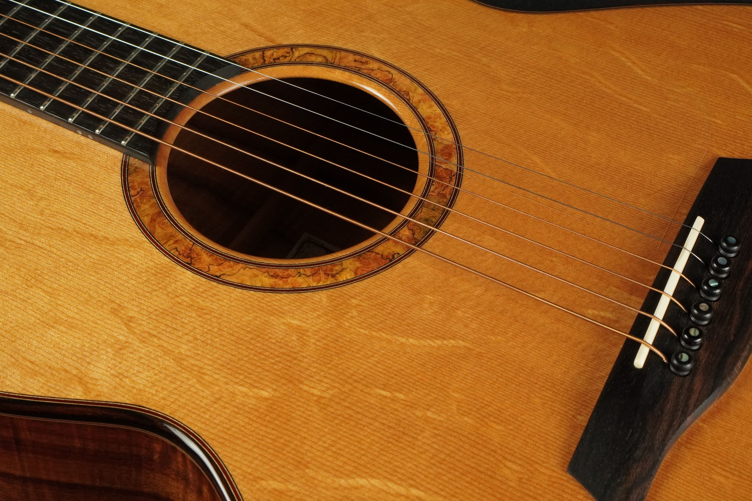 この立体的な造形のブリッジや、細かく木材を重ねたバインディングやサウンドホール、そのサウンドホールも縁が斜めに面取りされ、指板エンドが一体化したような美しい仕上がりとなっており、サーゲイらしい造り込みの良さを感じさせます。