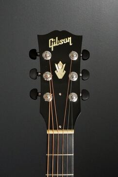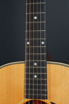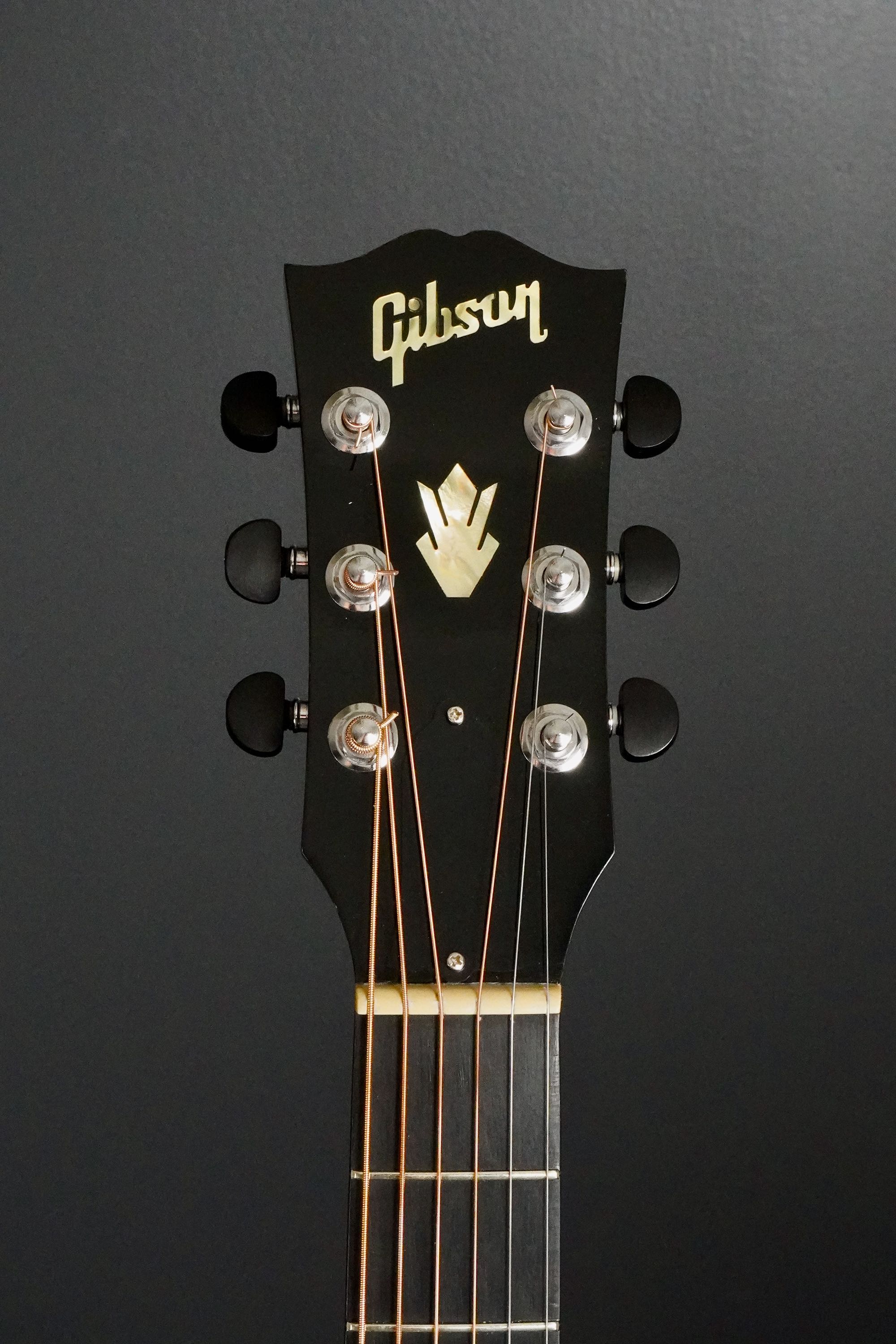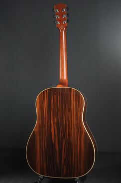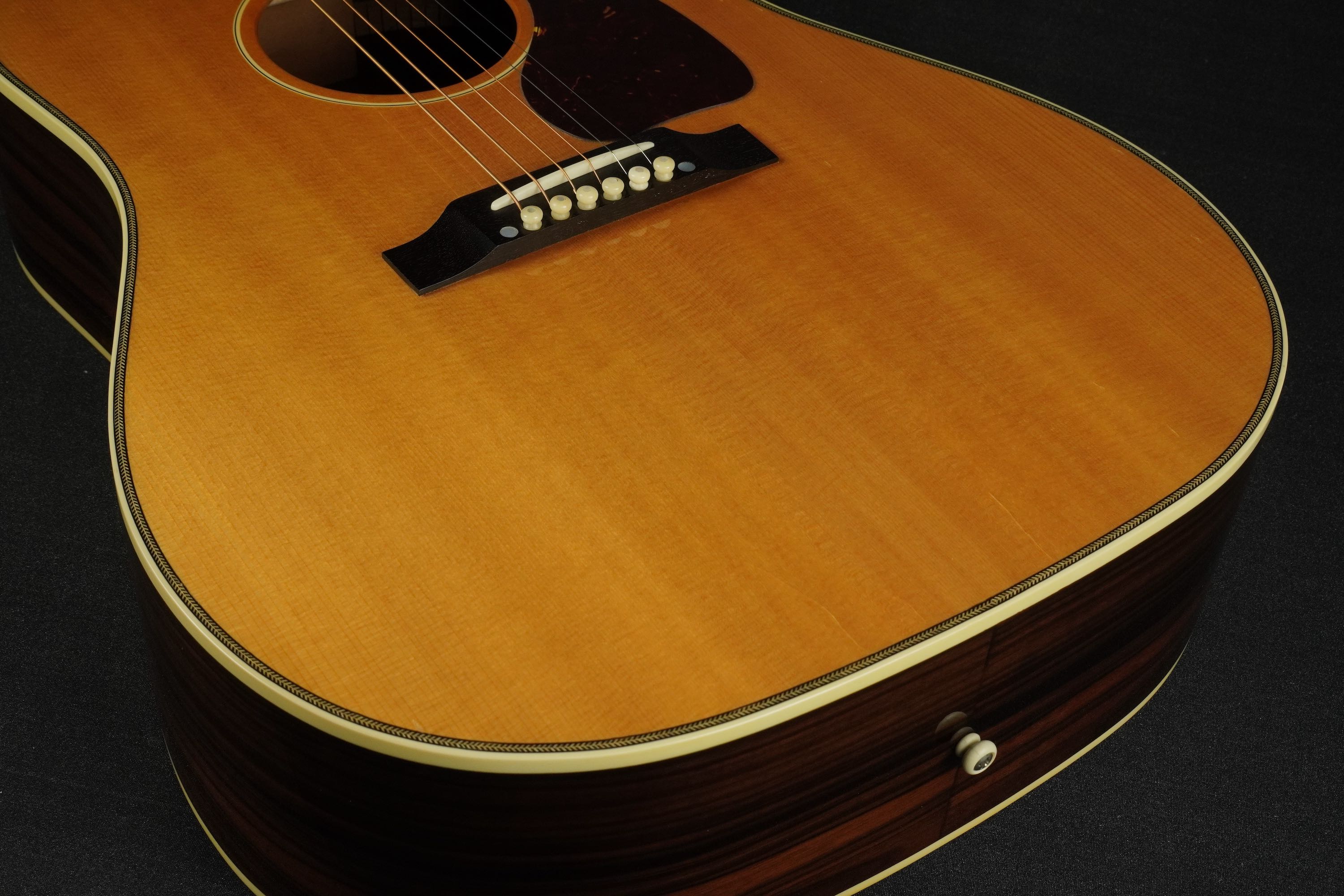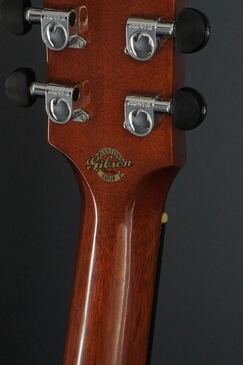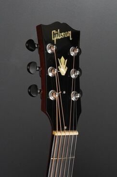 やや色焼けたホワイトのバインディングに、ギブソンでは珍しいヘリンボーントリム、サウンドホールのパーフリングは白黒白のシンプルな1リング、ベッコウ柄のスモールガードにベリーブリッジはエボニーであったりして、派手過ぎず地味過ぎず、ギブソンとしては凛とし、どことなく気品溢れるエレガントなルックスです。