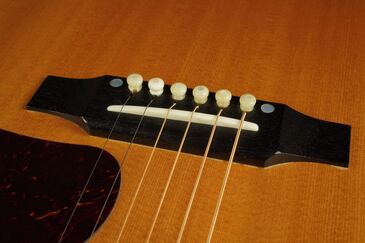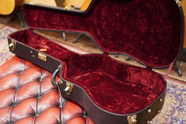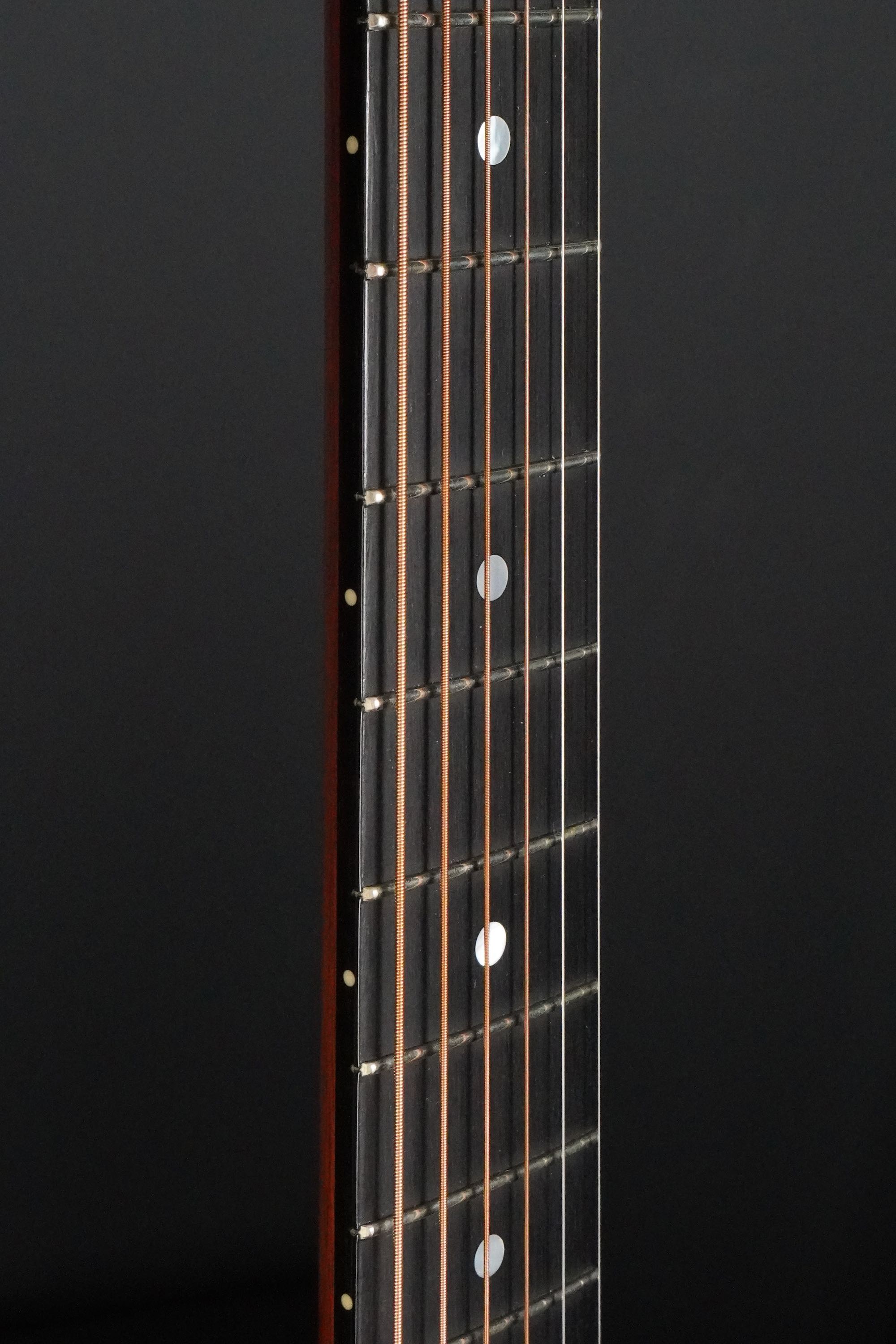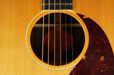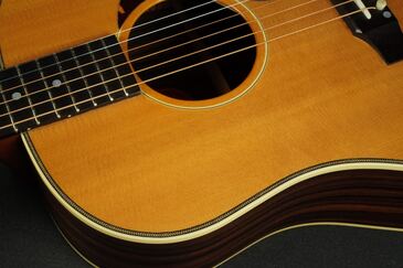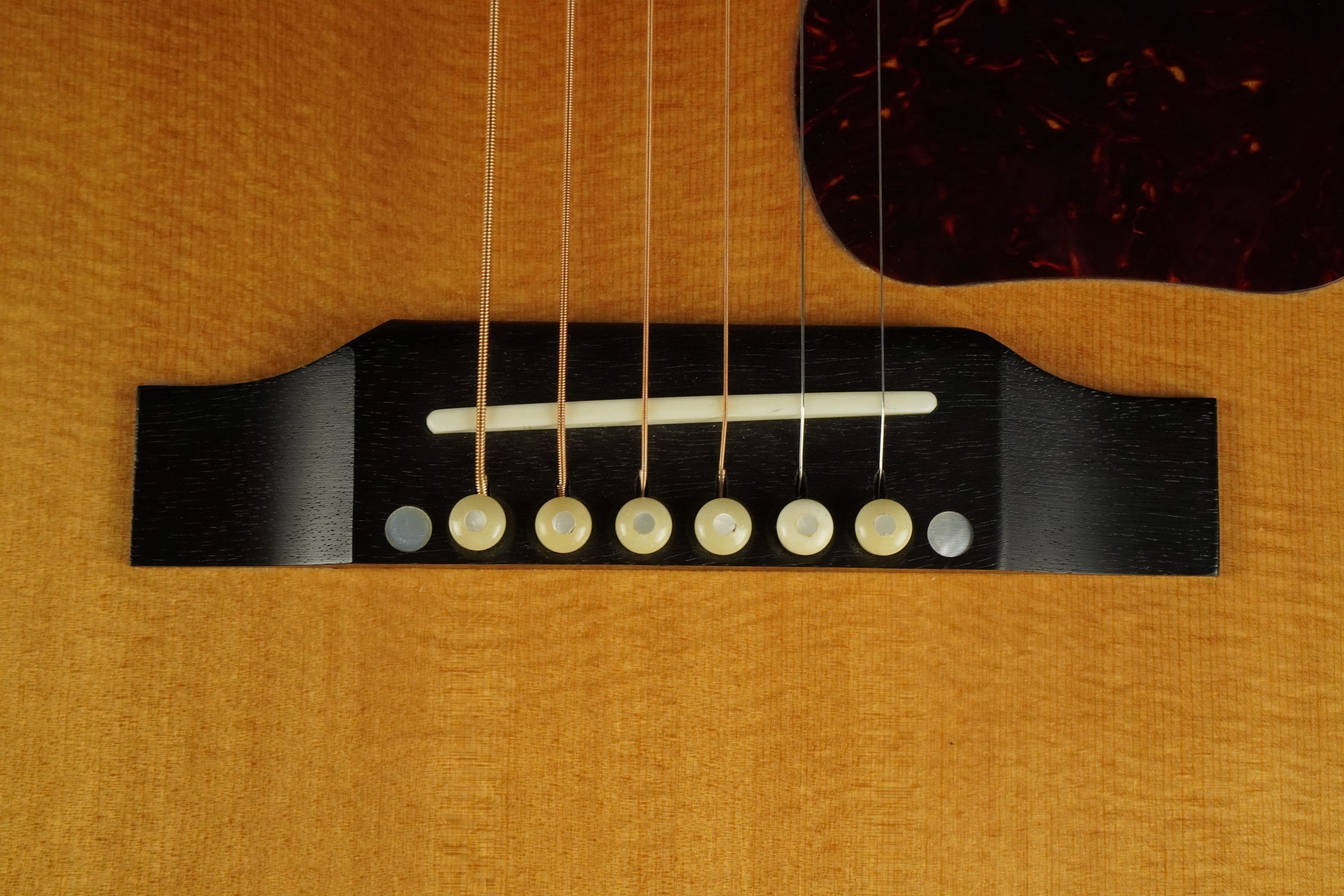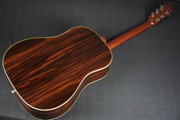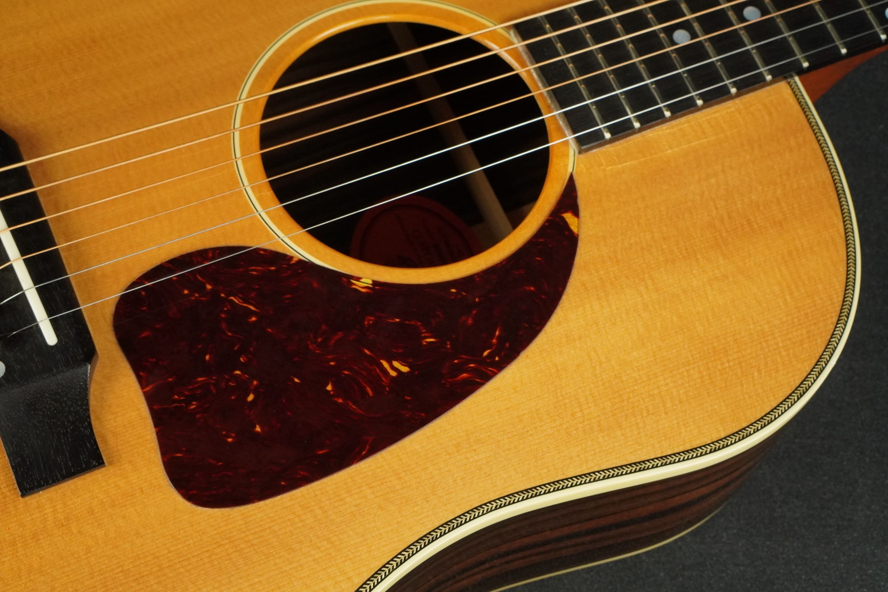 やや色焼けたホワイトのバインディングに、ギブソンでは珍しいヘリンボーントリム、サウンドホールのパーフリングは白黒白のシンプルな1リング、ベッコウ柄のスモールガードにベリーブリッジはエボニーであったりして、派手過ぎず地味過ぎず、ギブソンとしては凛とし、どことなく気品溢れるエレガントなルックスです。