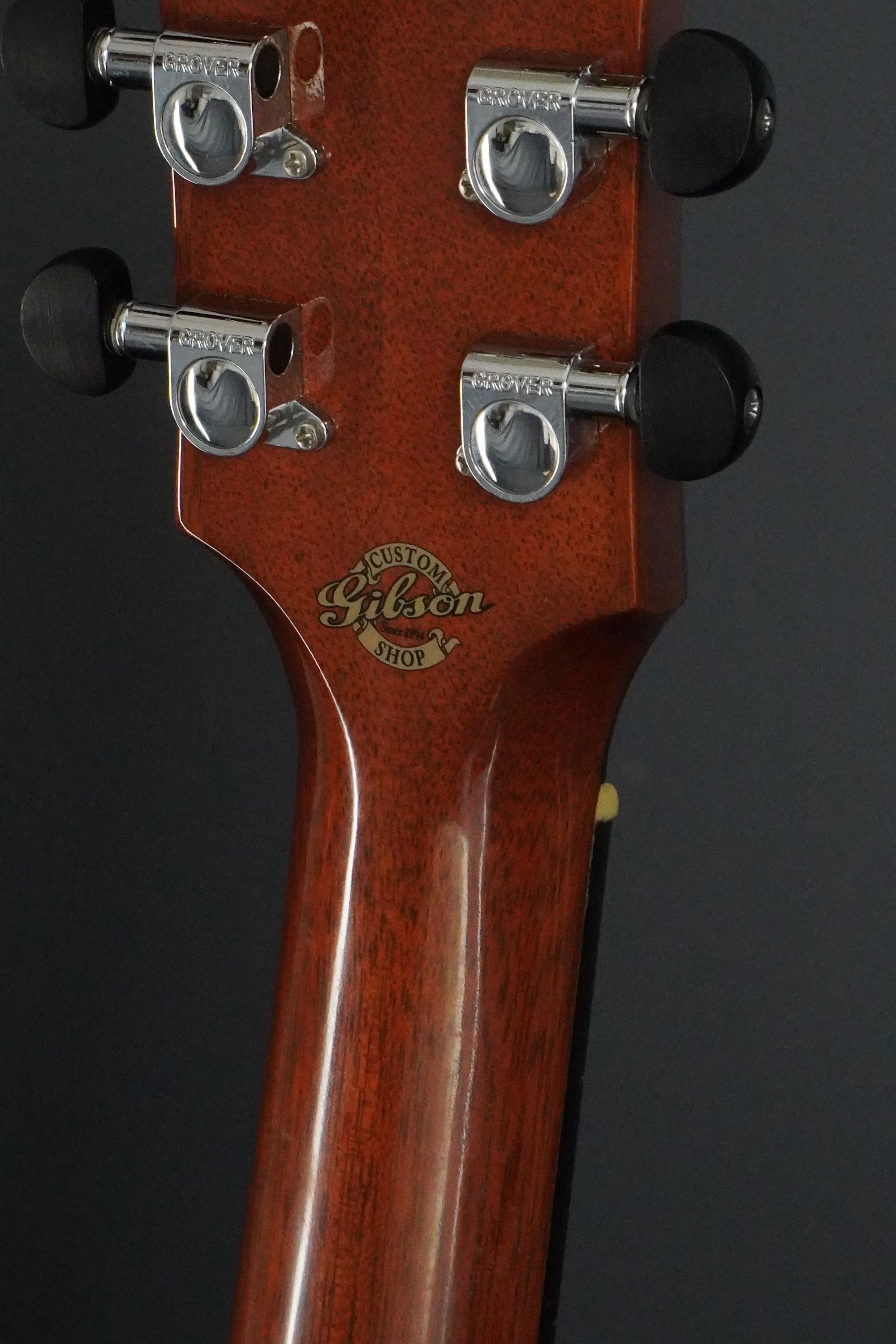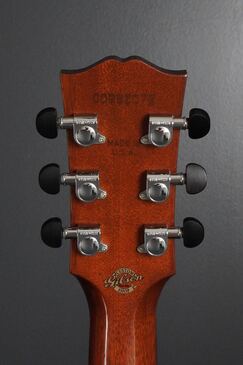 ヘッドも、黒くバインディングの無いヘッドトップはJ-45らしいのですが、ヘッドロゴがパールロゴでクラウンインレイも入り、グローバーミニのペグはエボニーつまみ、バインディングの無い指板にもエボニーが用いられたりと、こちらもギブソンらしからぬエレガントな雰囲気を纏うスタイルとなっております。