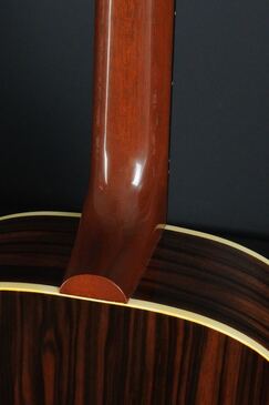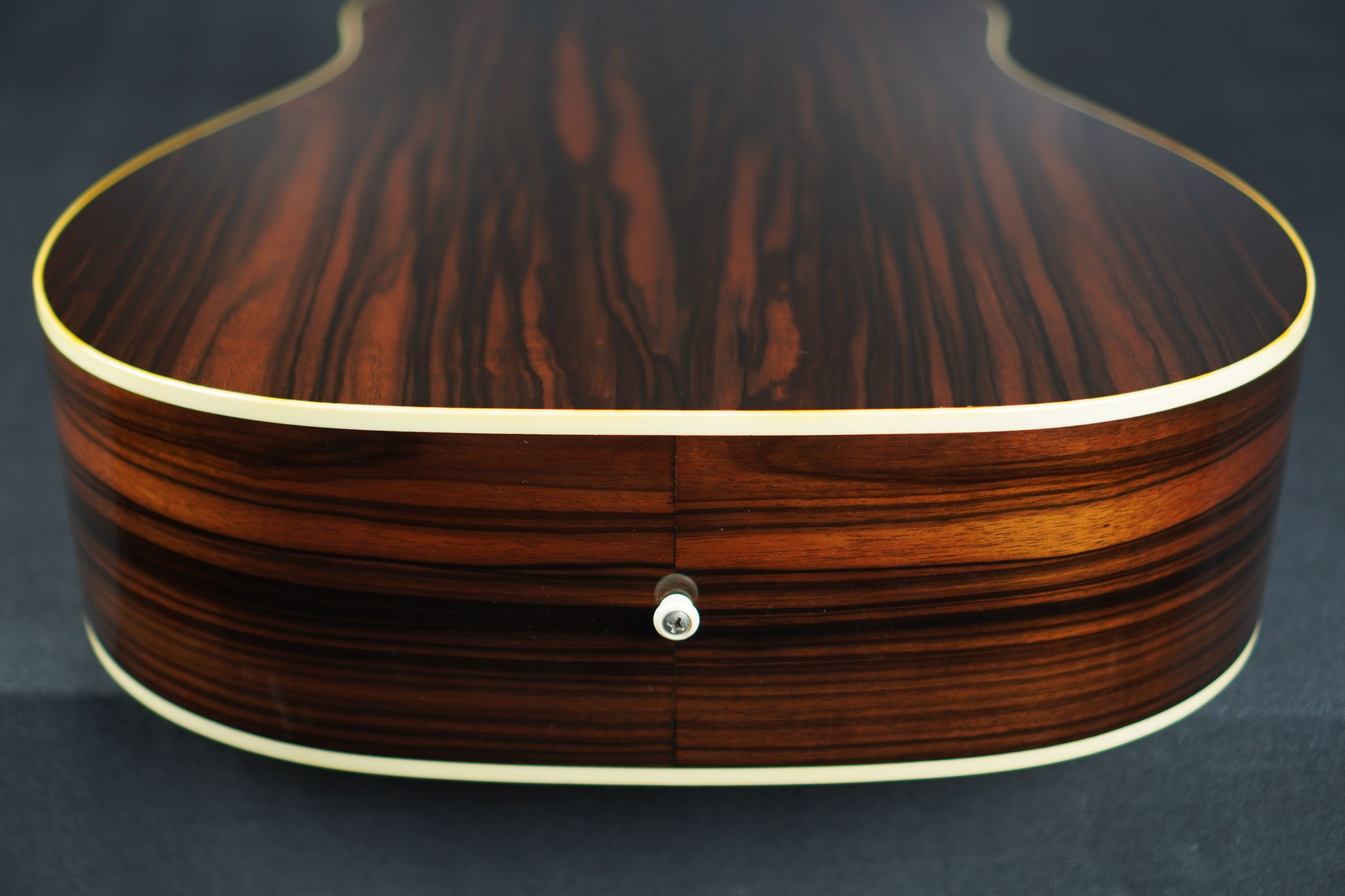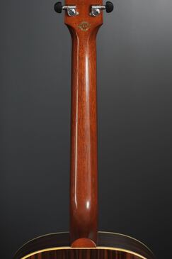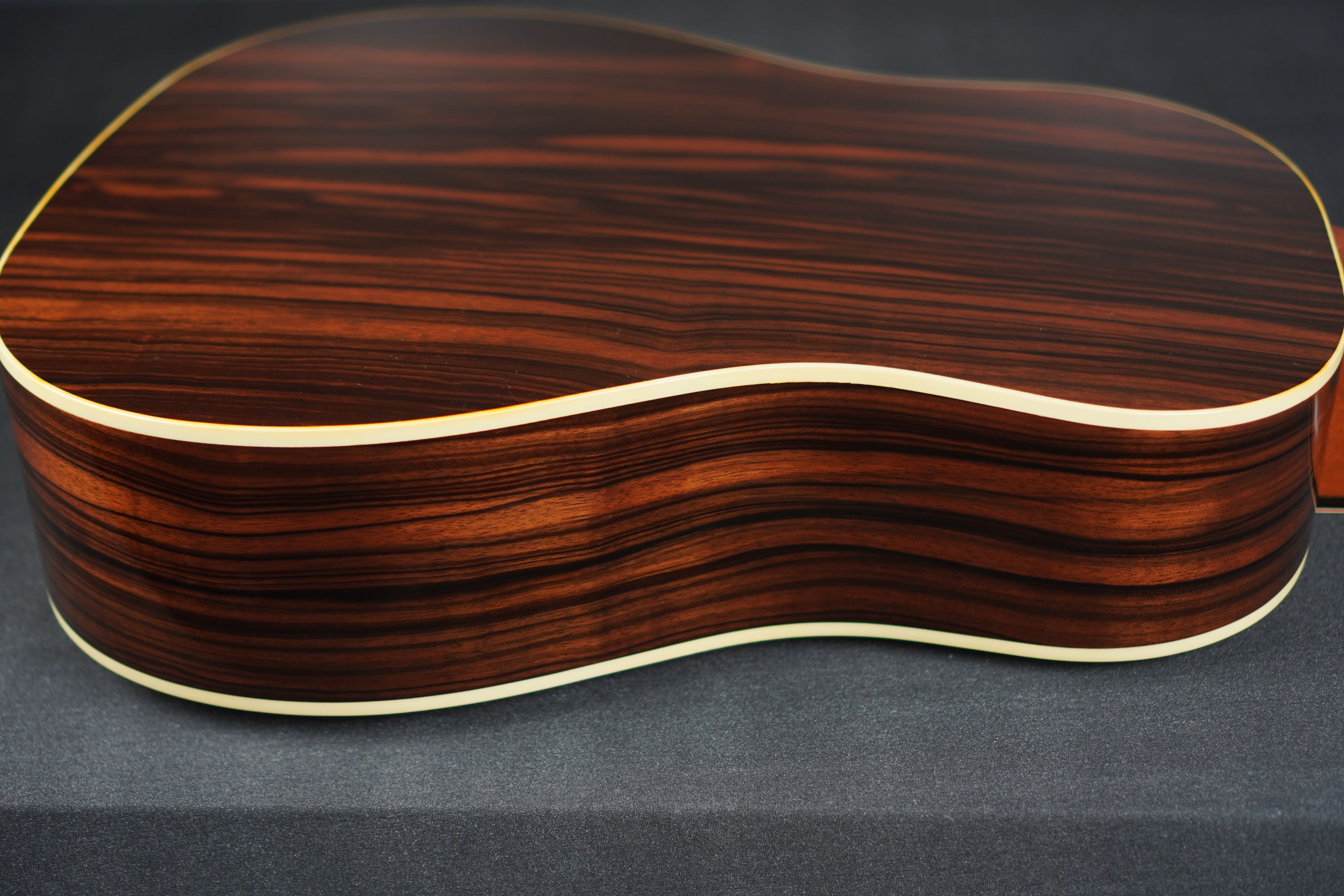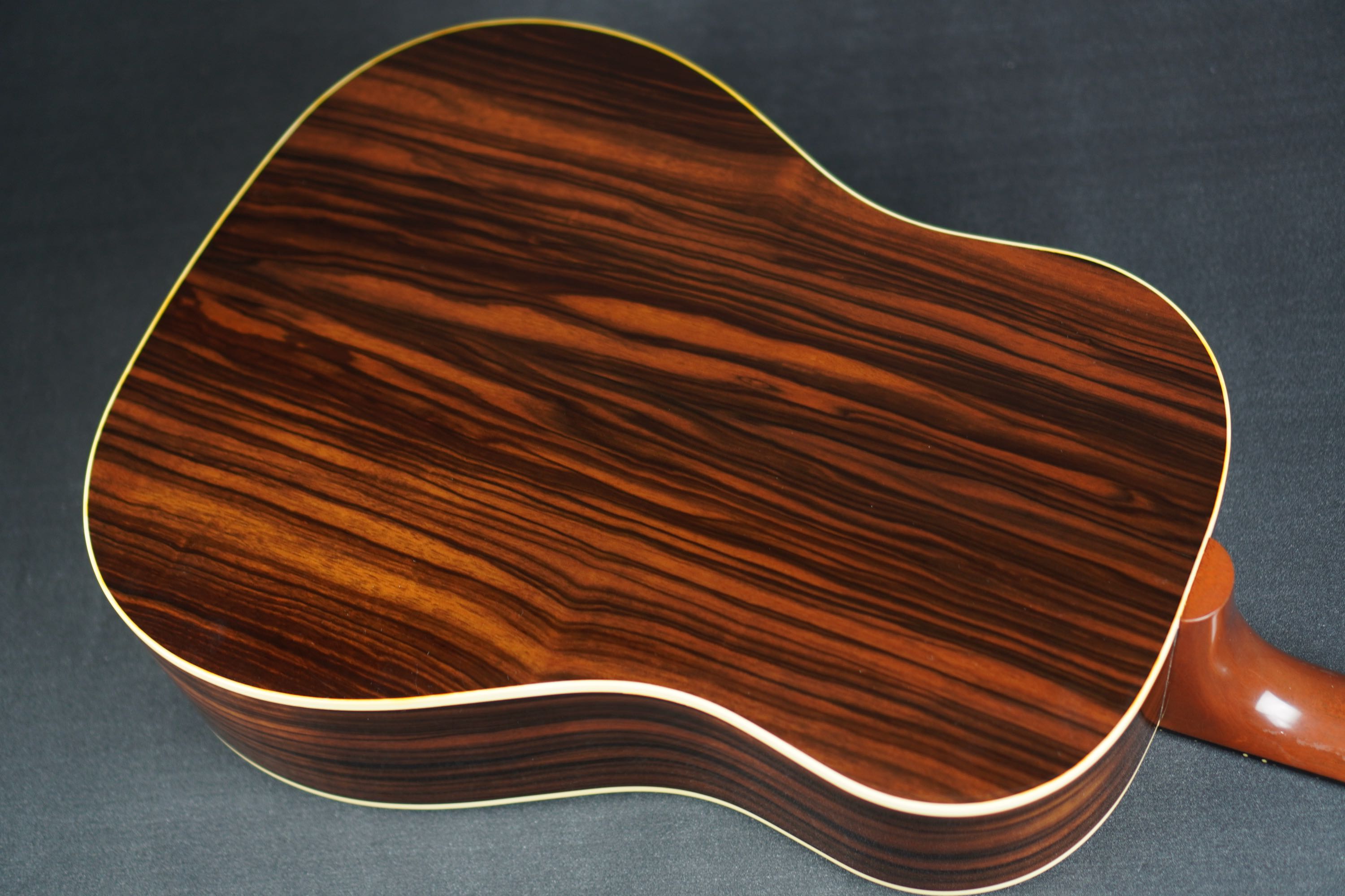 本機のサイド&バックを見ると、一見ではローズウッド系の木目にも見えますが、かなり厳選されたマッカーサーエボニーが用いられており、柾目の木取りですが適度にユラっとした木目の流れで、木目の濃淡もハッキリとした様は、なかなか魅力的なルックスです。