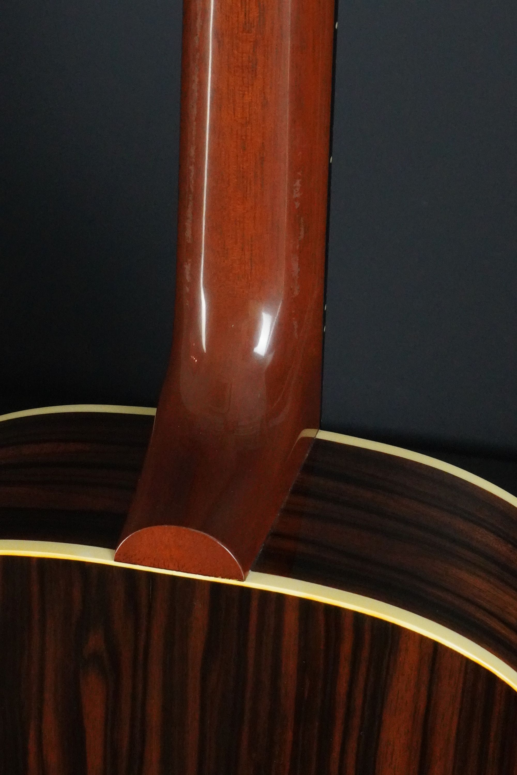 ナット幅43mmのマホガニーネックは握り易いラウンドシェイプ、ハイフレットでもそれ程太くならず、程よいグリップ感で弾き易いスタイルです。