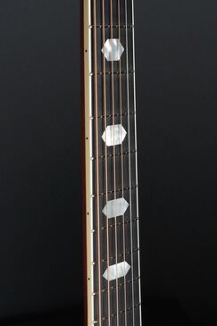 ローズウッドのヘッドトップにはマザーオブパールの縦ロゴ、そしてゴールドのグローバーペグも味わい深い仕上がりで、エボニー指板のヘキサゴンの指板インレイにもマザーオブパールを用いた様は、白黒のコントラストが際立ち、とてもエレガントです。