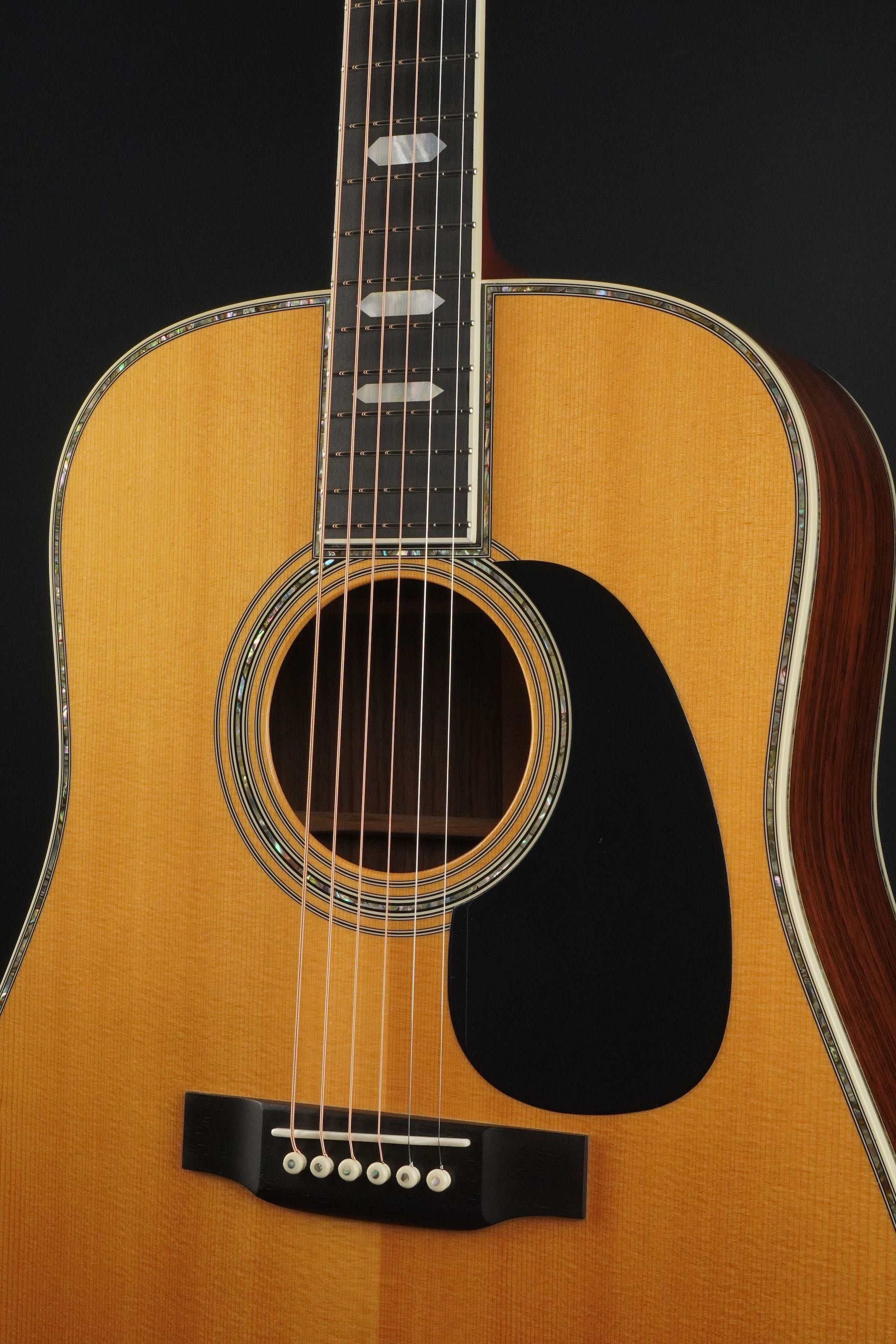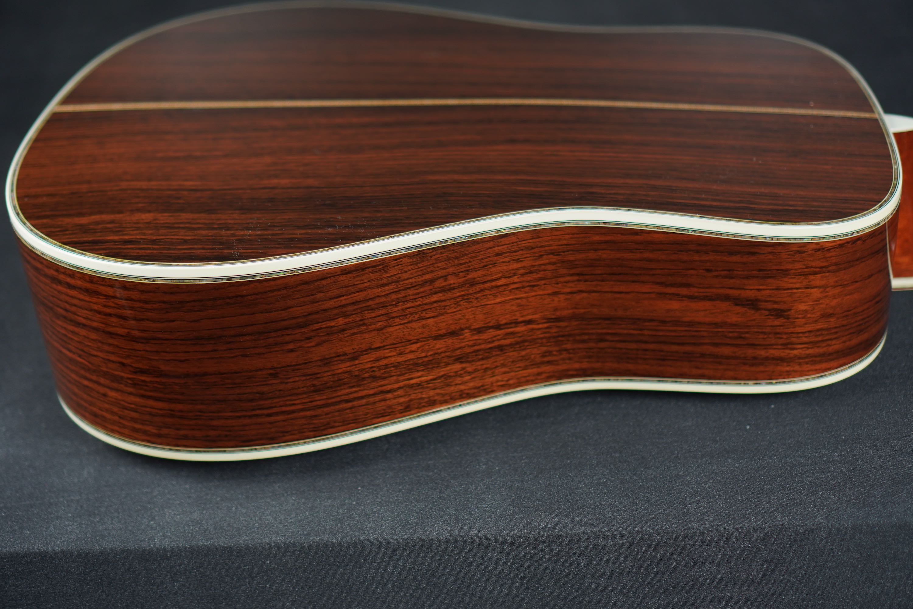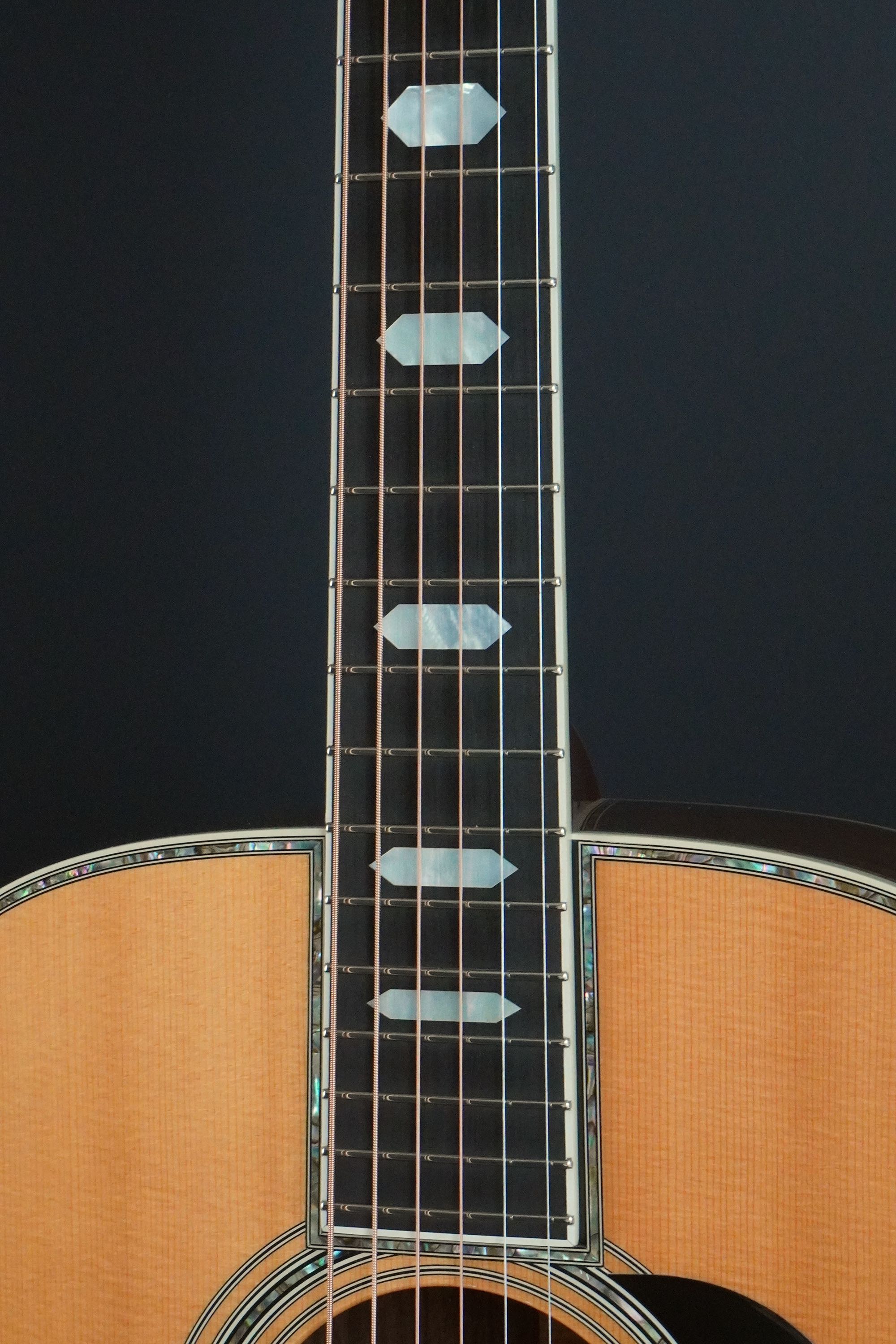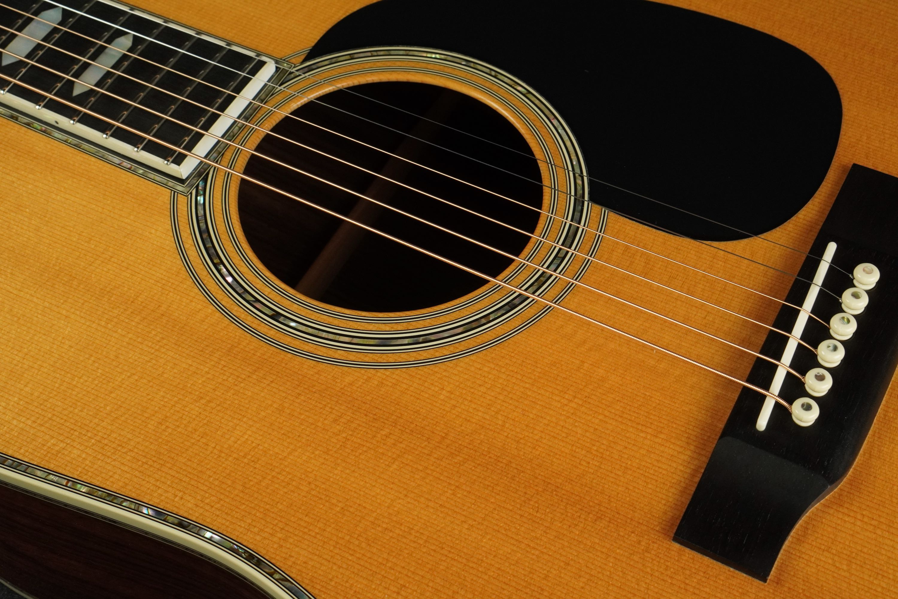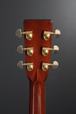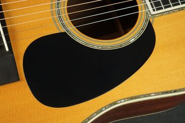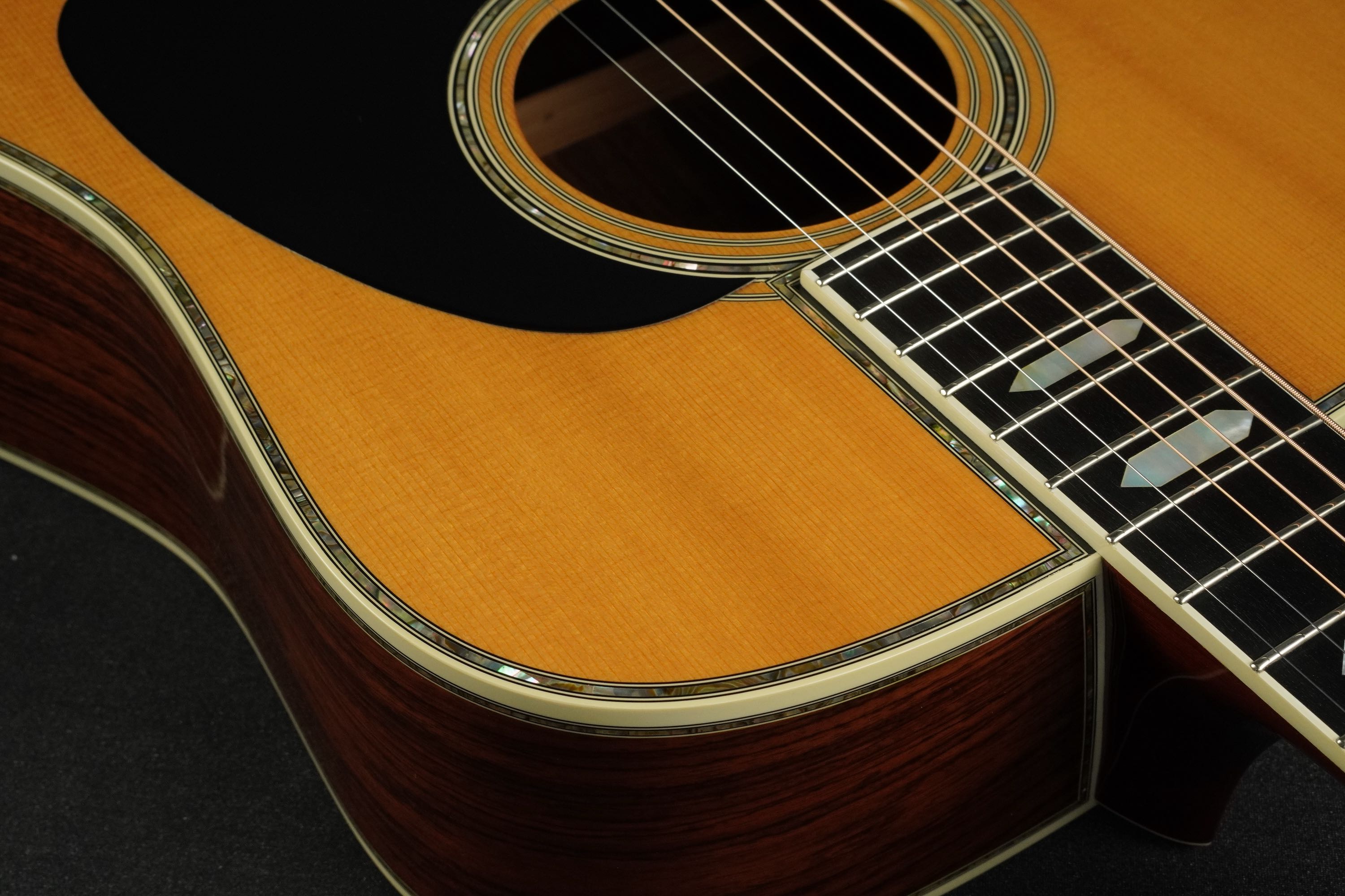 やはり45スタイルですので、バインディングやサウンドホールのパーフリングのアバロンが映え、ピックガードは敢えてブラックガードとする事で、懐かしいルックスとなっております。