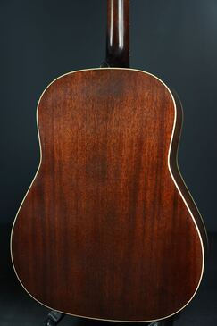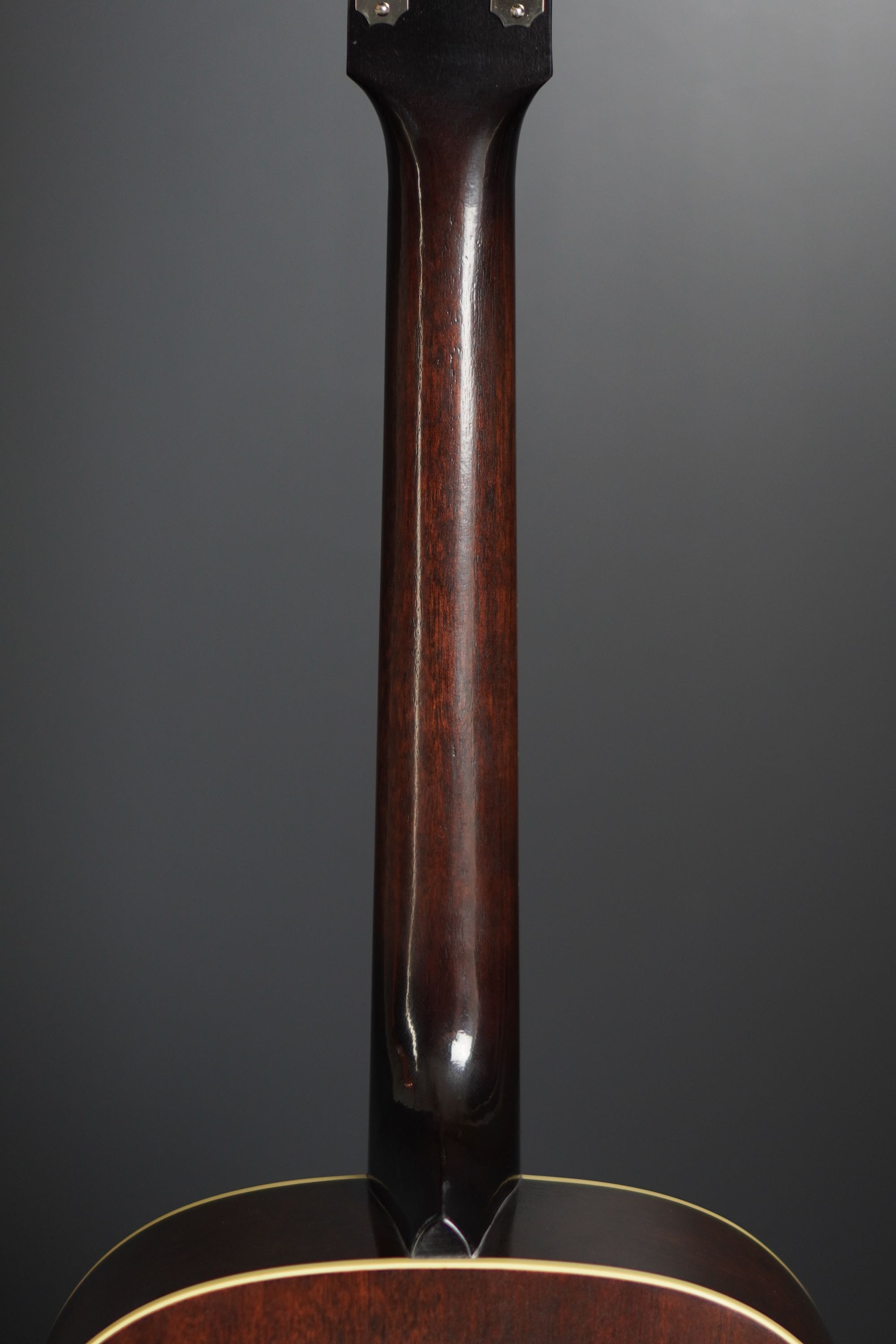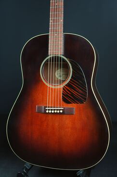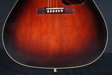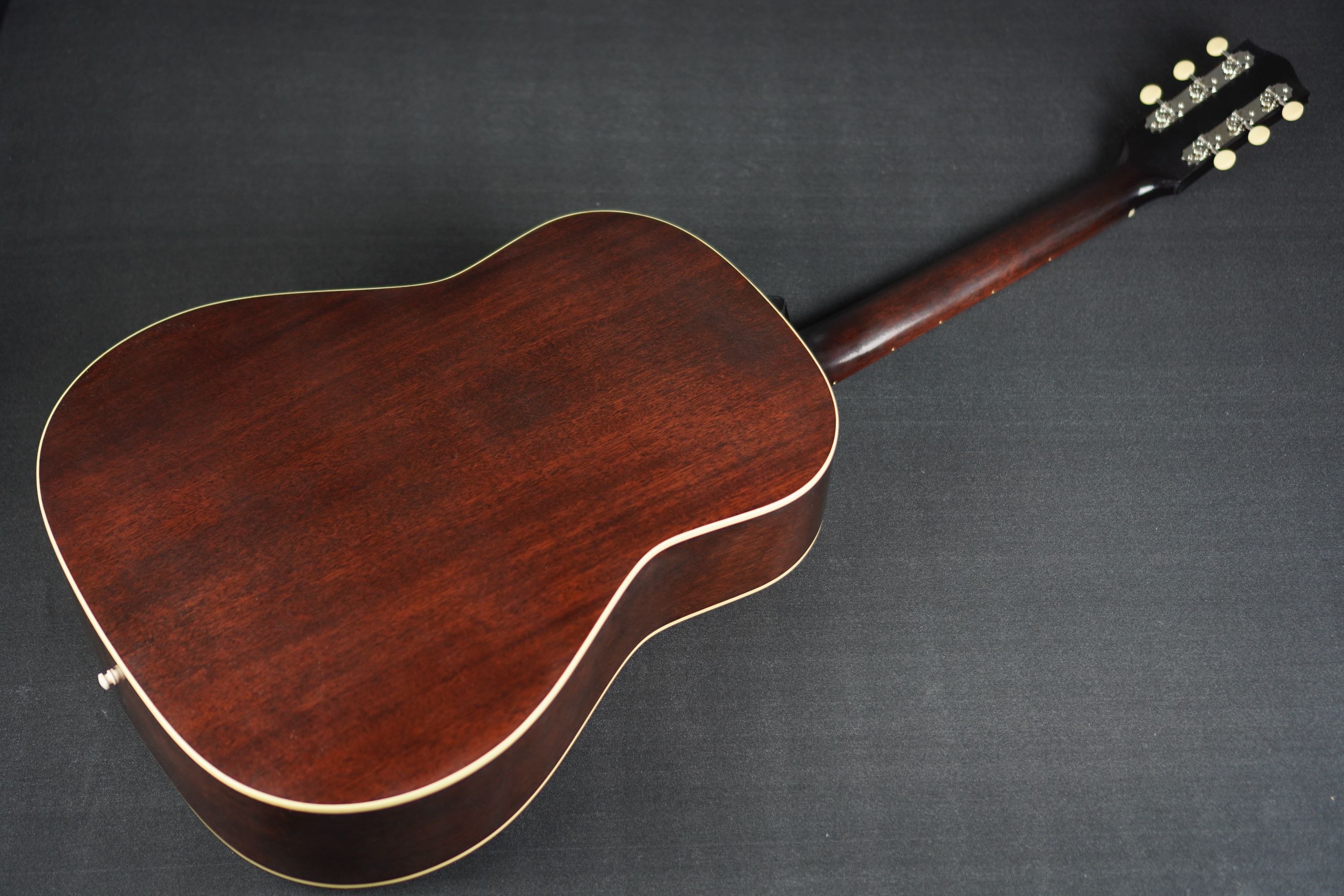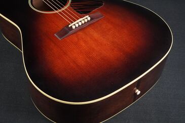 40年代風のダークなサンバーストフィニッシュ、仕上げは経年で塗装が褪せた質感を再現した「Closet Relic Finish 」で、塗装面が木部に馴染んだかのようなアンティークな仕上がりで、新品時は微細な擦り傷程度のマットな仕上がりですが、恐らく少し年が経ってしまうだけでもウェザーチェックの入ってしまいそうな、とても極薄なラッカー仕上げです。