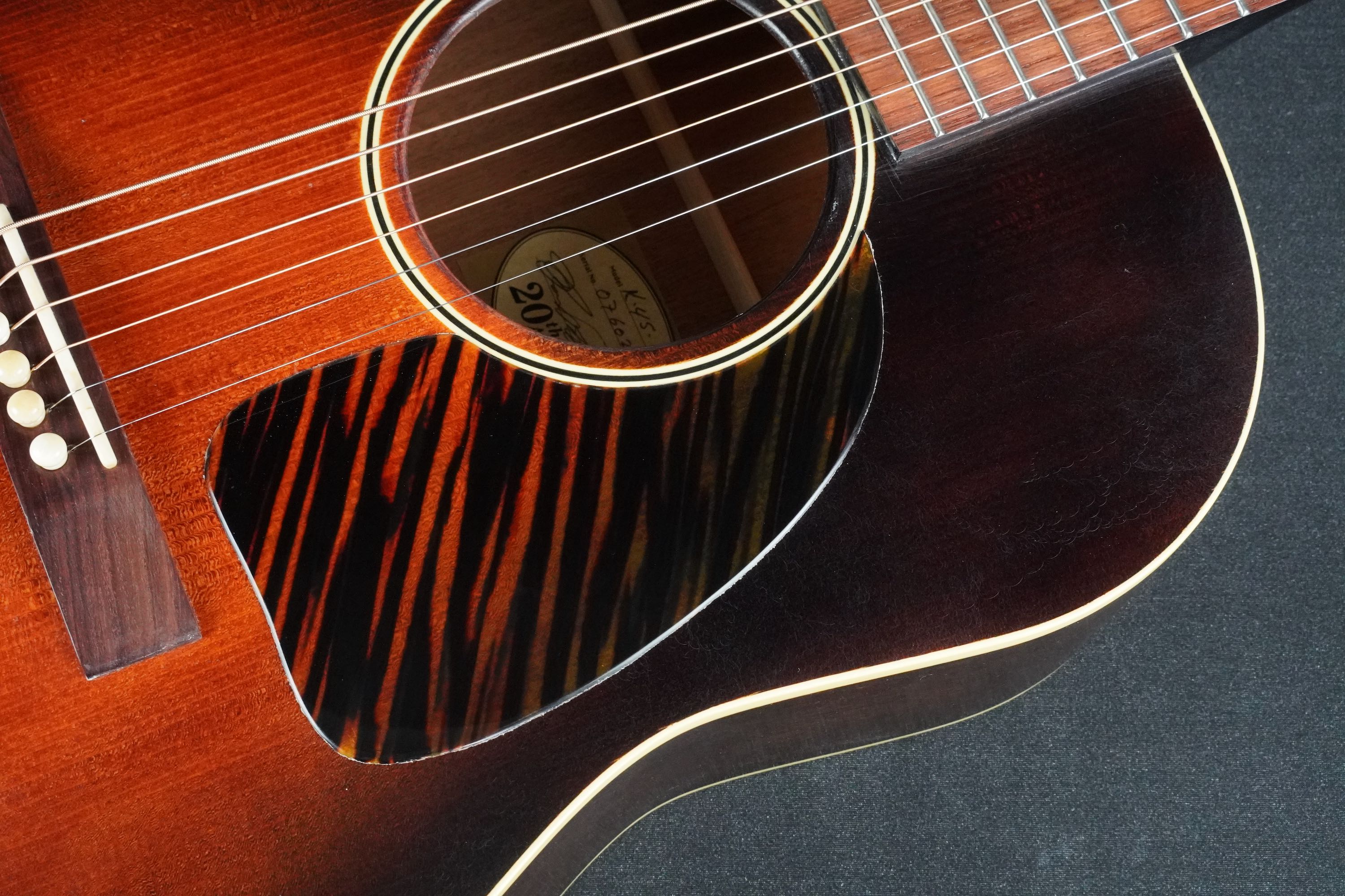 白黒白の太いワンリングのロゼッタに、ピックガードは戦前スタイルのファイヤーストライプ柄をリクエストしました。