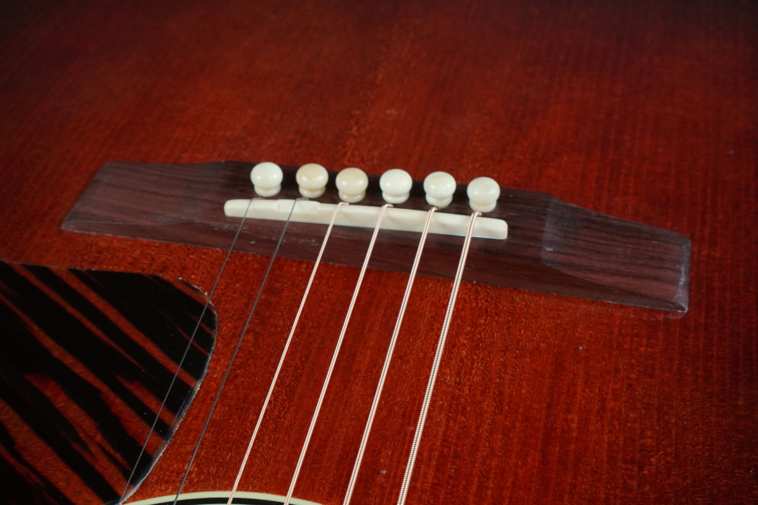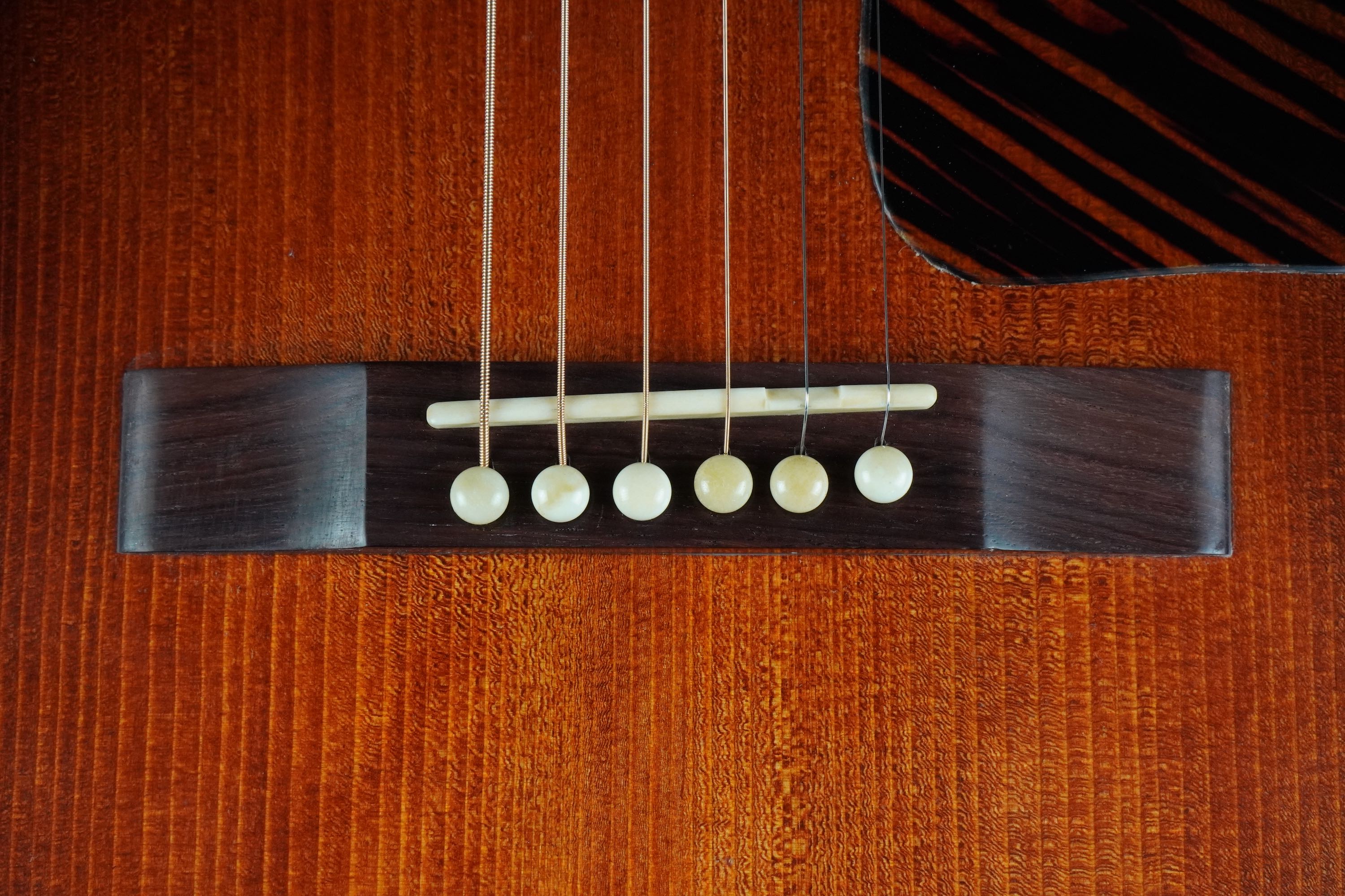 ストレートの短冊形のブリッジは、美しいマダガスカルローズウッドが使われており、ブリッジピンは、ホワイトの牛骨です。