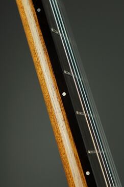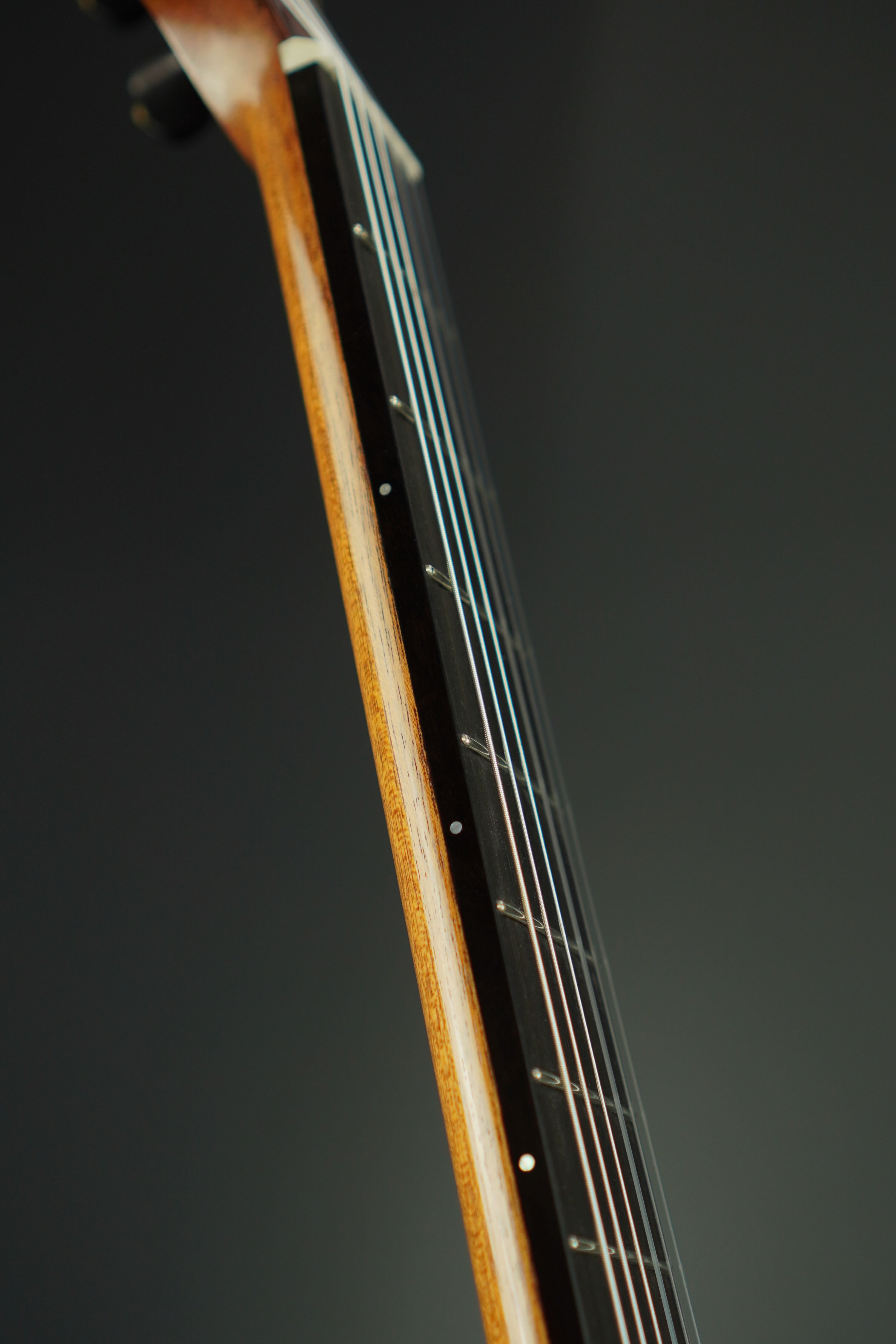 ボディのバインディングは、エキゾチックエボニーが使われ、濃いブラウンカラーと、やや赤みのある色味が、