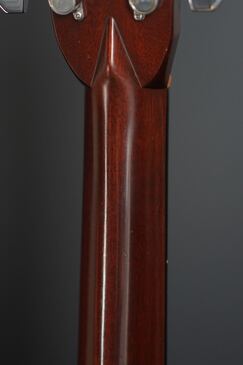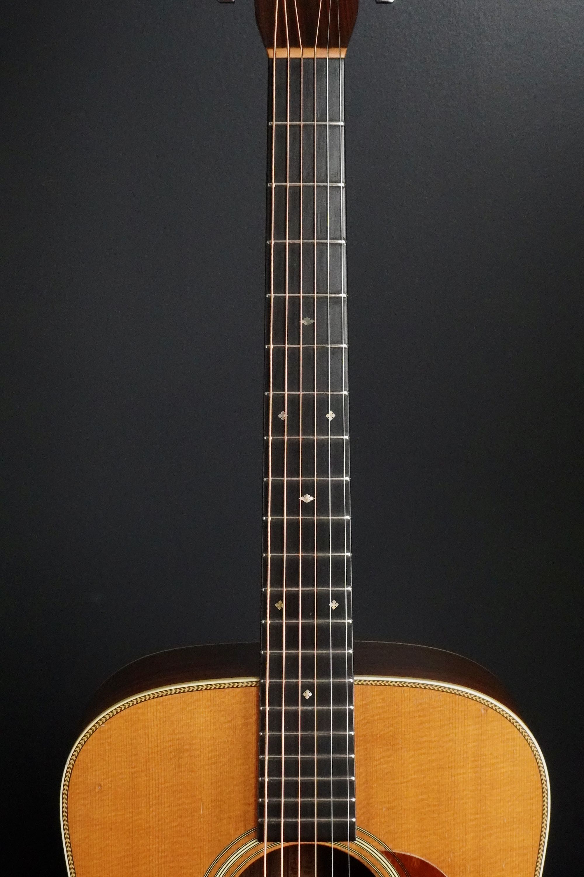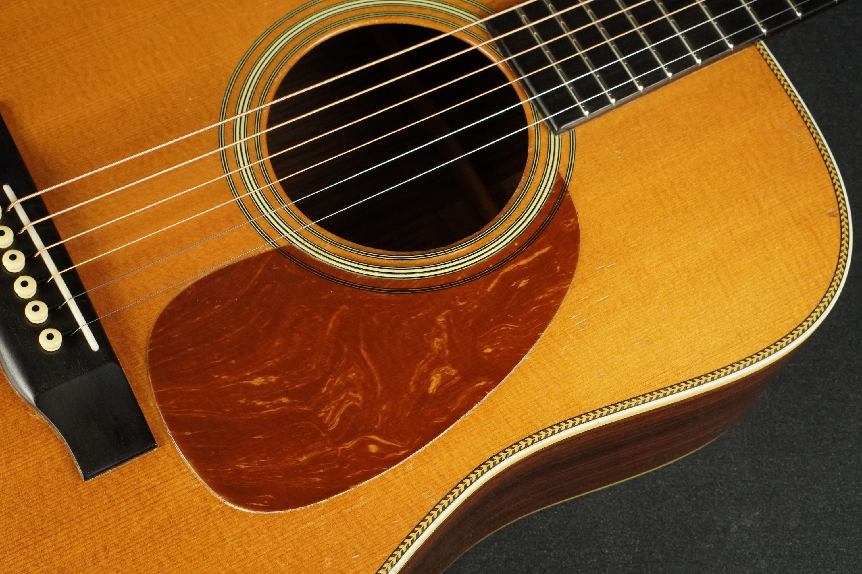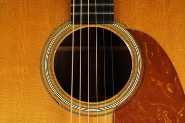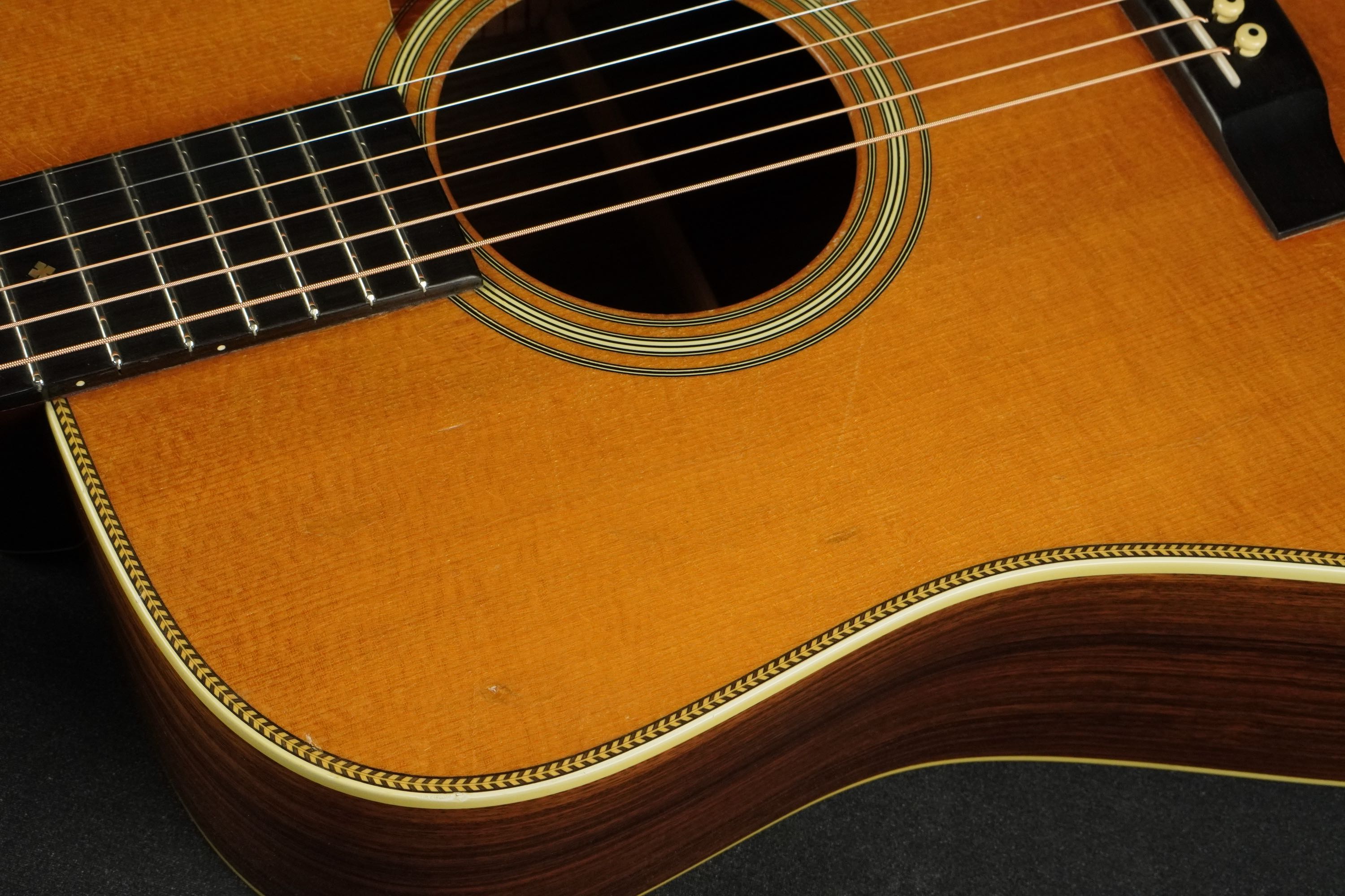 この年式らしい色味の薄いベッコウ柄のピックガードはレトロな風合いで、28スタイルのロゼッタでエボニーのベリーブリッジには通常のショートサドル仕様、アンティークに色焼けした白いバインディングにヘリンボーントリムのパーフリングというレトロなスタイルです。