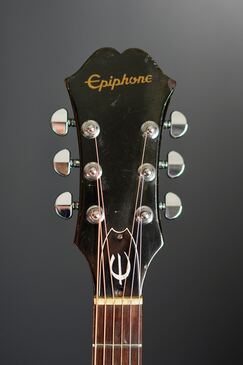 エピフォンらしい面長なヘッド形状、黒いヘッドトップにはシルクスクリーンのエピフォンロゴ。