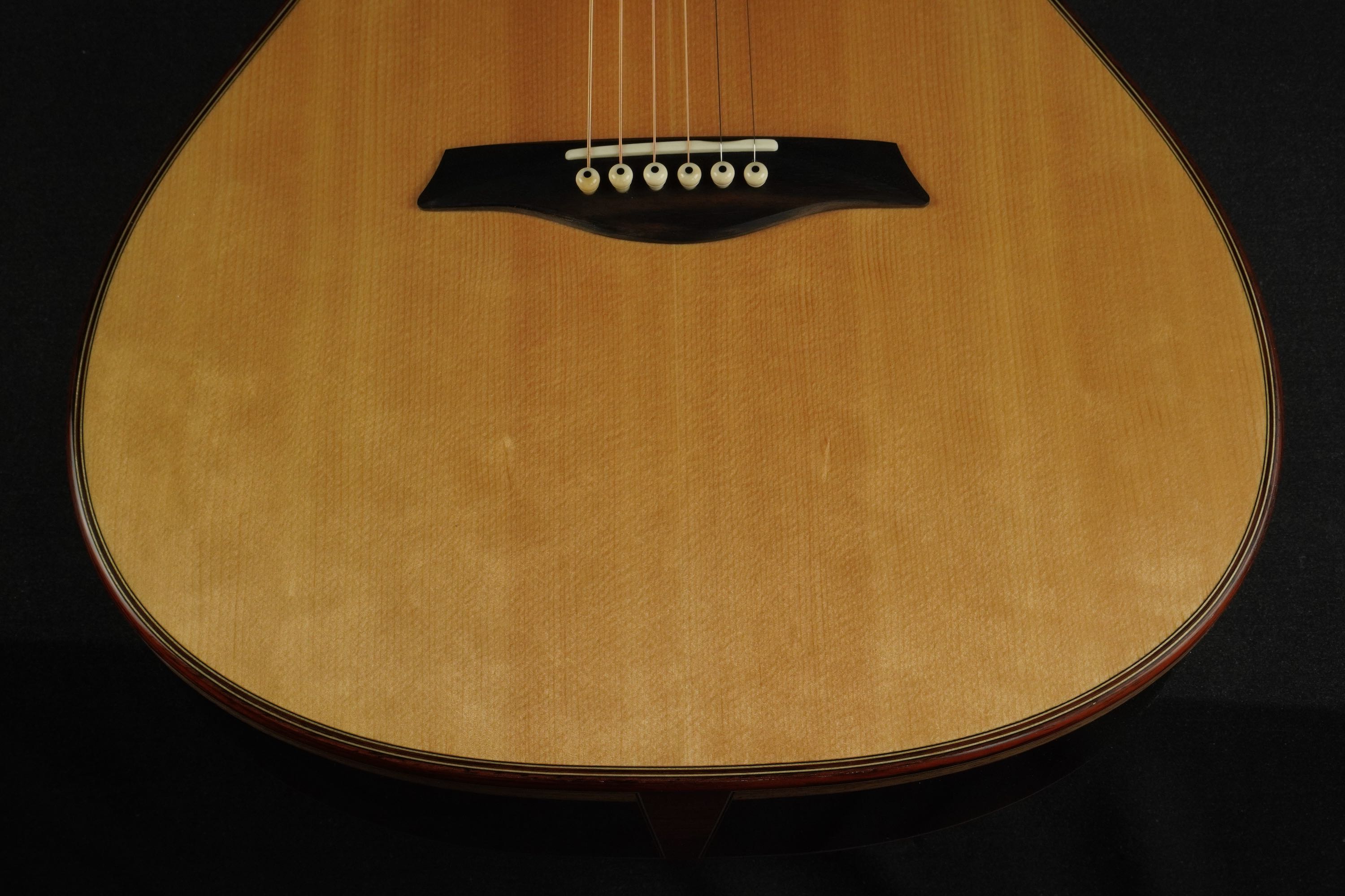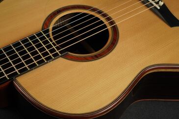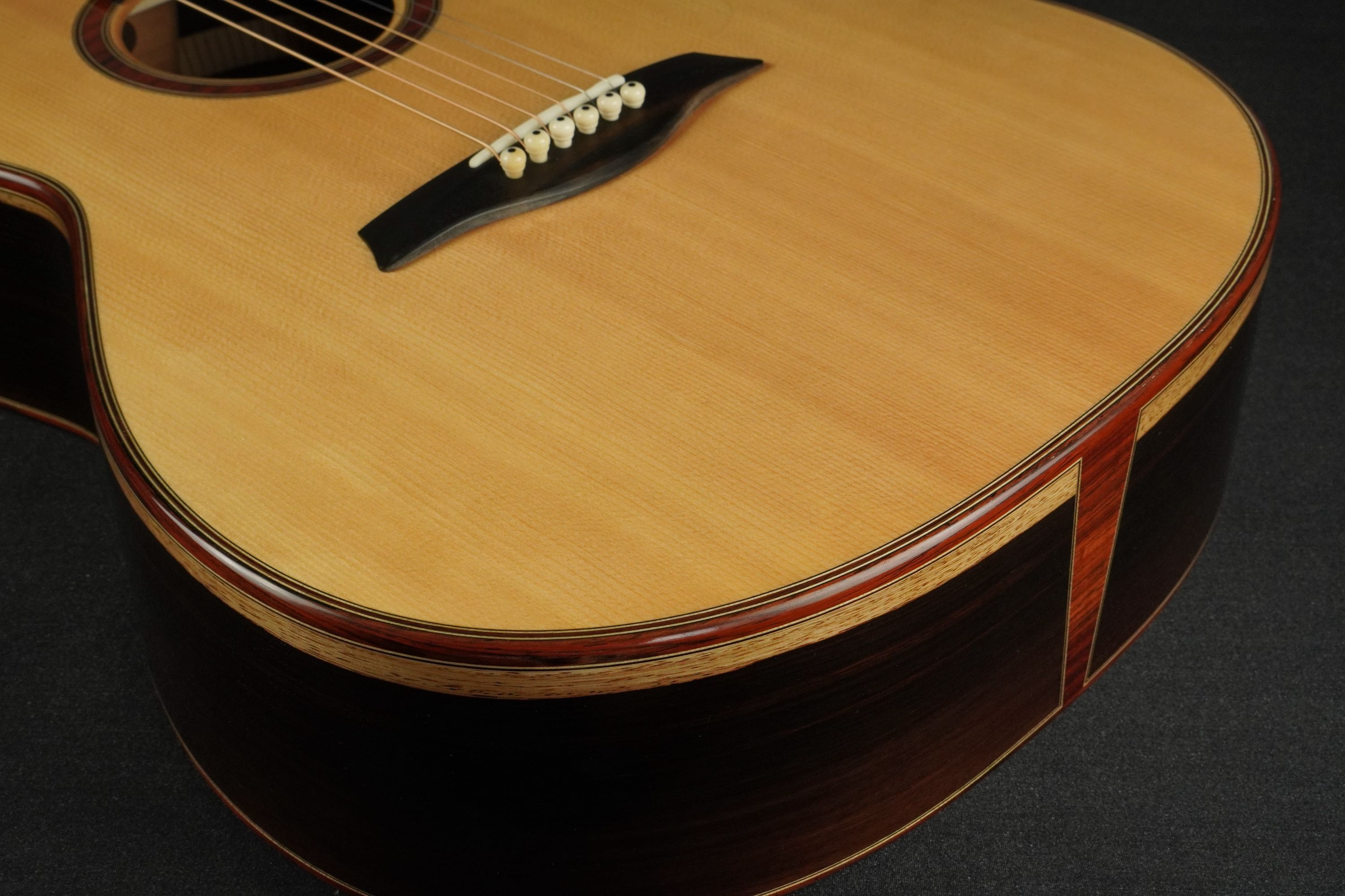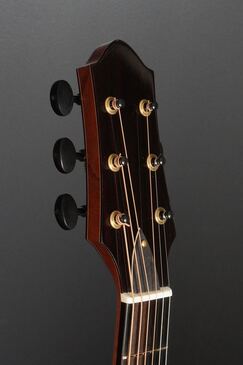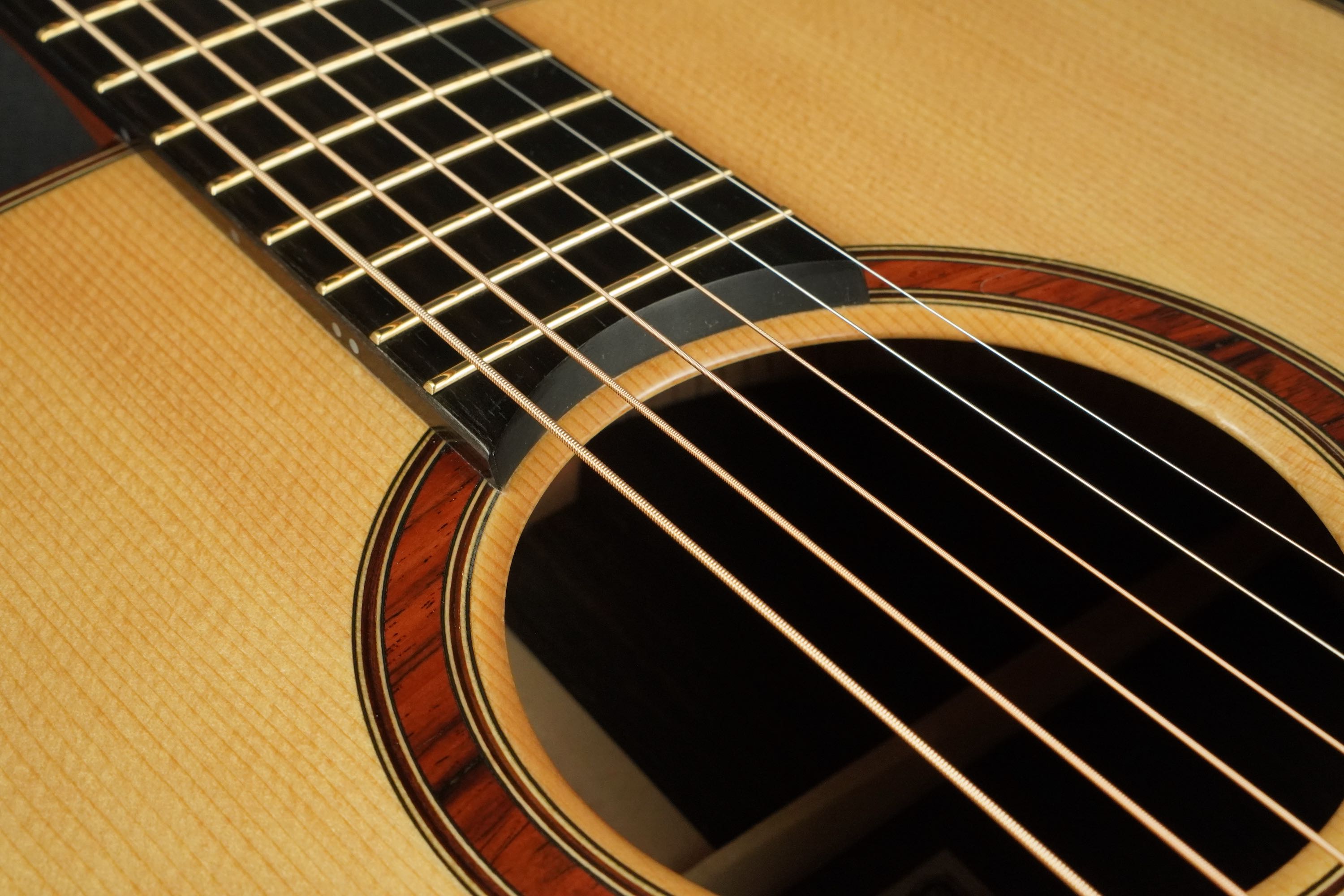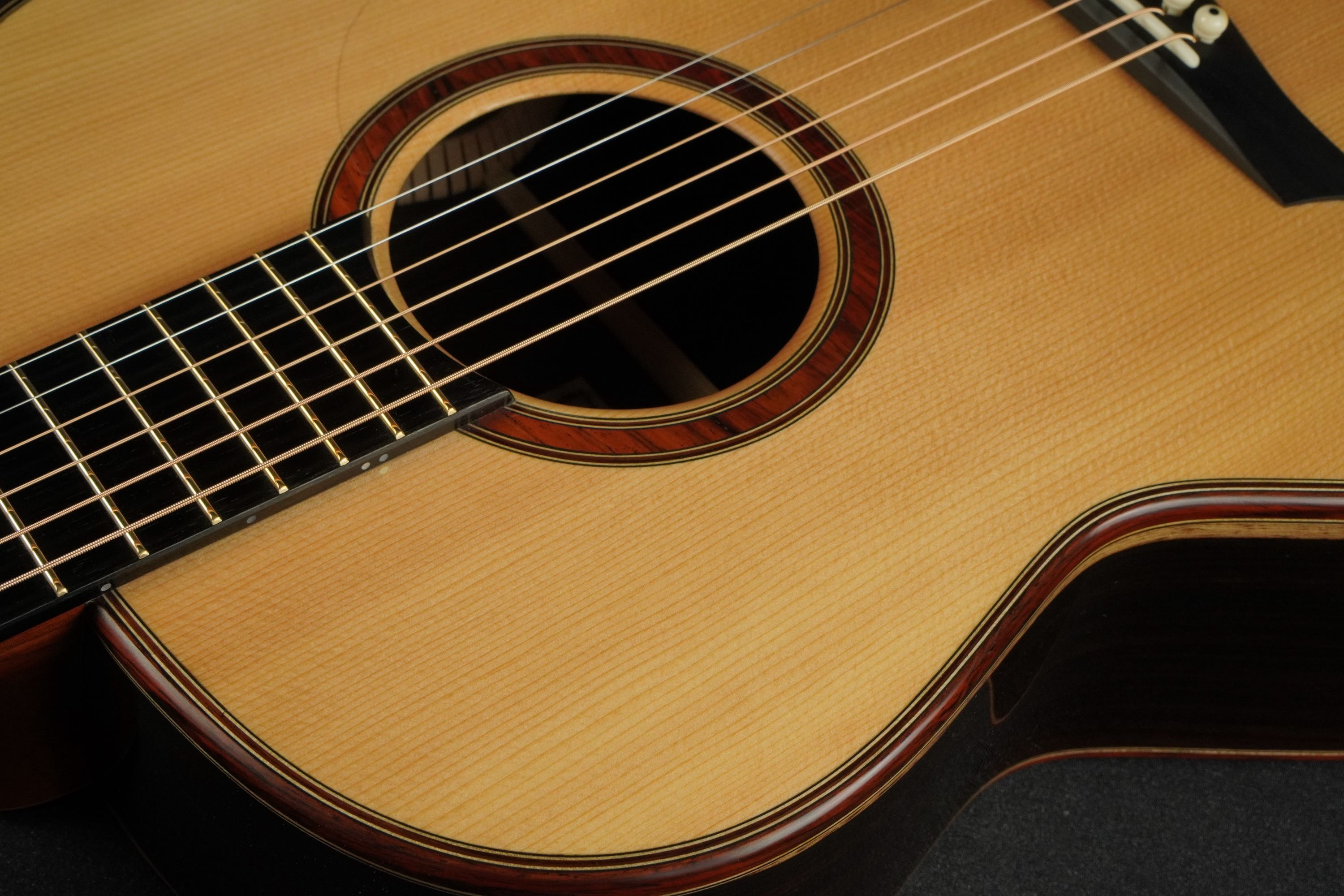 ロゼッタの周りや、トップ外周のウッドパーフリングには、ダークな色が使われ、