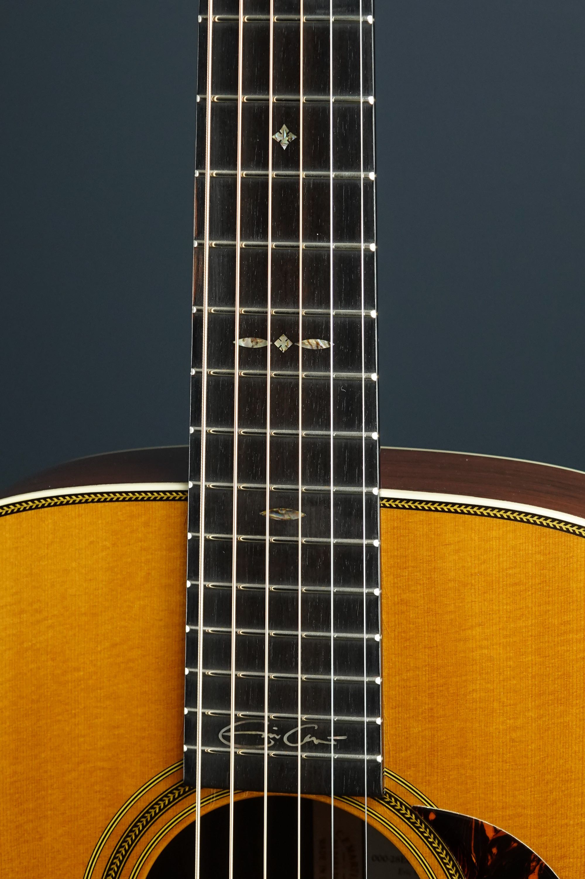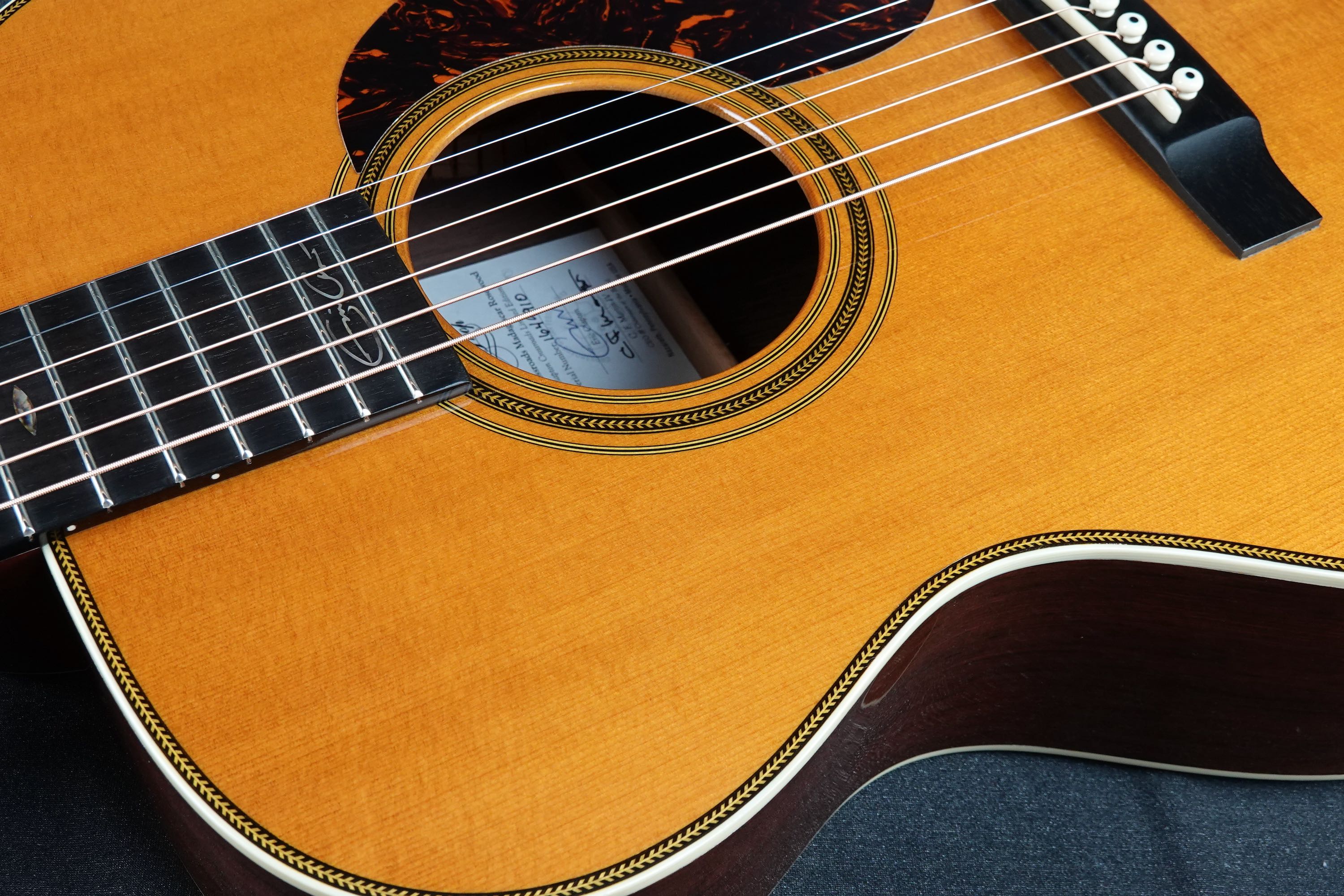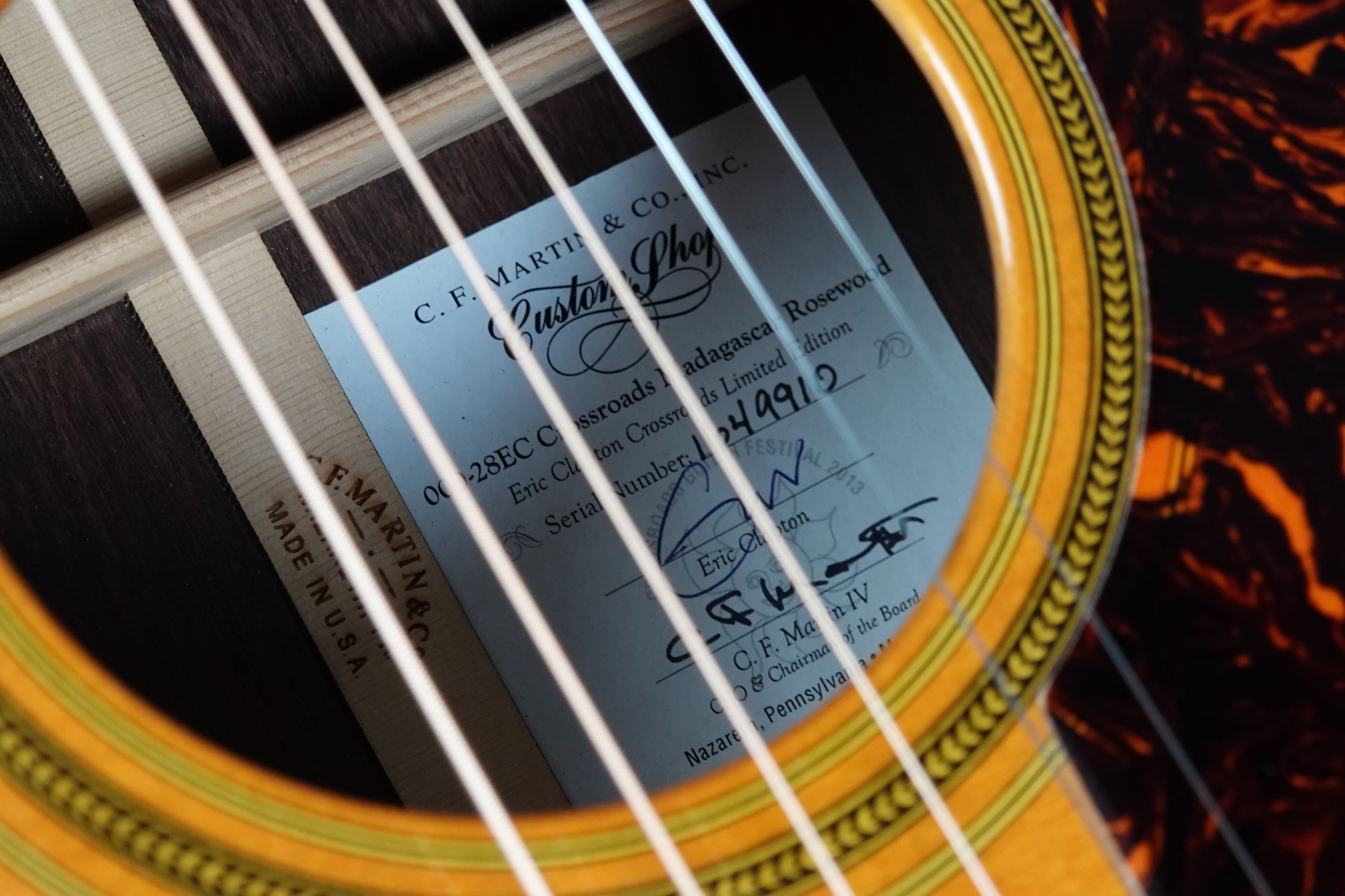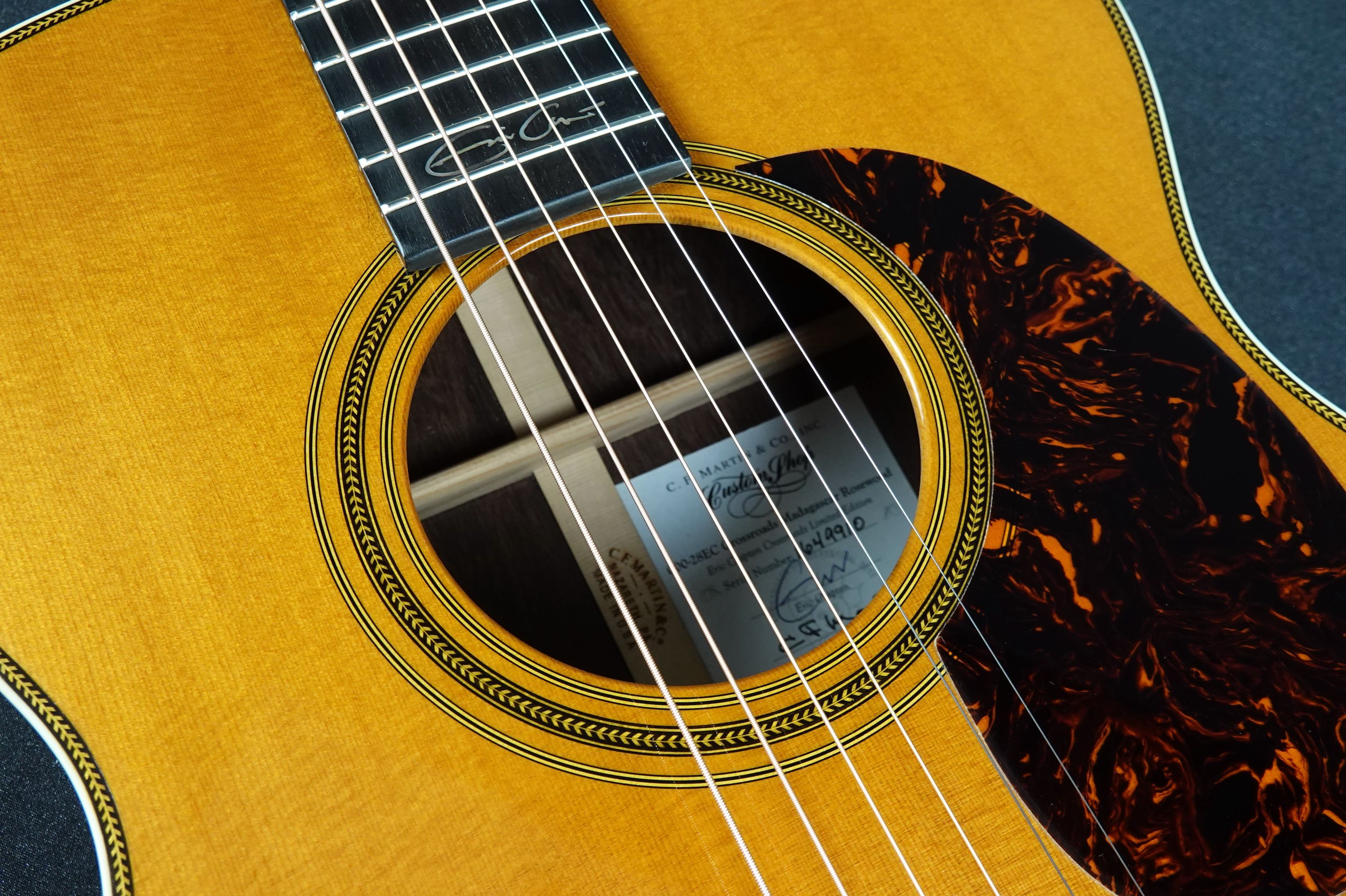 14フレットジョイントの000-28としては初年度である1934年製のスタイルをベースに、トーンウッドとしても評価の高いマダガスカル・ローズウッドを用い、カスタムショップにて製作された良質な限定生産モデルで、サウンドホール内の特別なラベルにもクラプトンとマーティン社CEOのクリスマーティン2人の直筆サインが入っており、中古でも人気が高く、あまり見かけない貴重なモデルです!