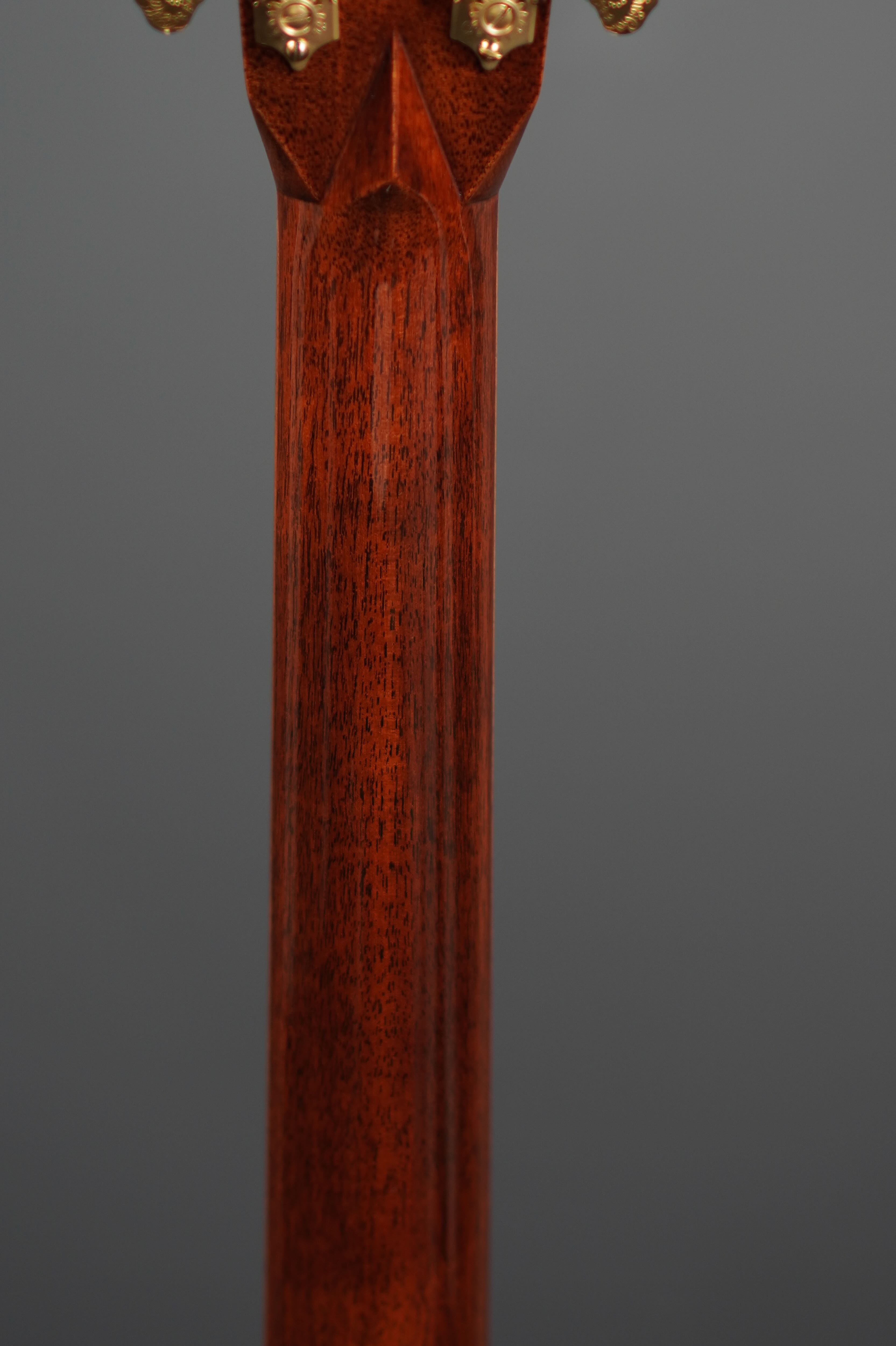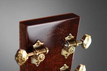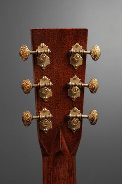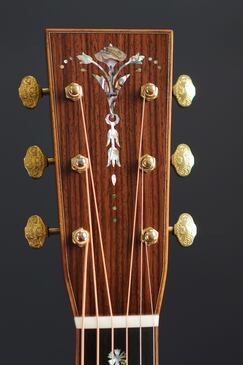 こちらもフレイムコア材のバインディングが入ったシャープなヘッド形状にはローズウッドのヘッドプレート、そこに美しく輝くトーチインレイが入り、オープンバックのゴールドチューナーのツマミには、MARTINロゴの彫金が入ったエレガントなスタイルで、同じくフレイムコア材のバインディングが入った漆黒のエボニー指板には、45スタイルのスノーフレイクインレイが品良く収まります。