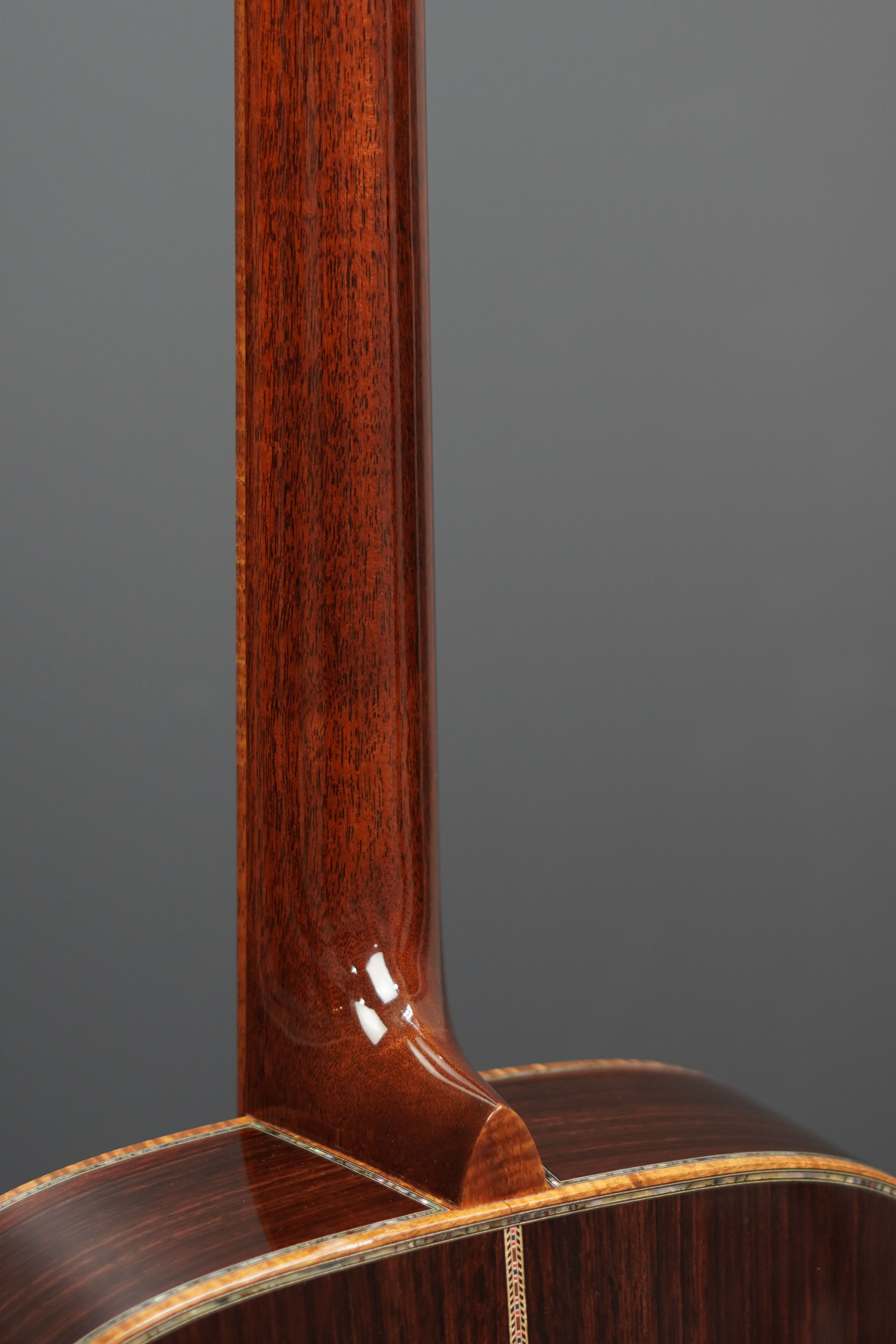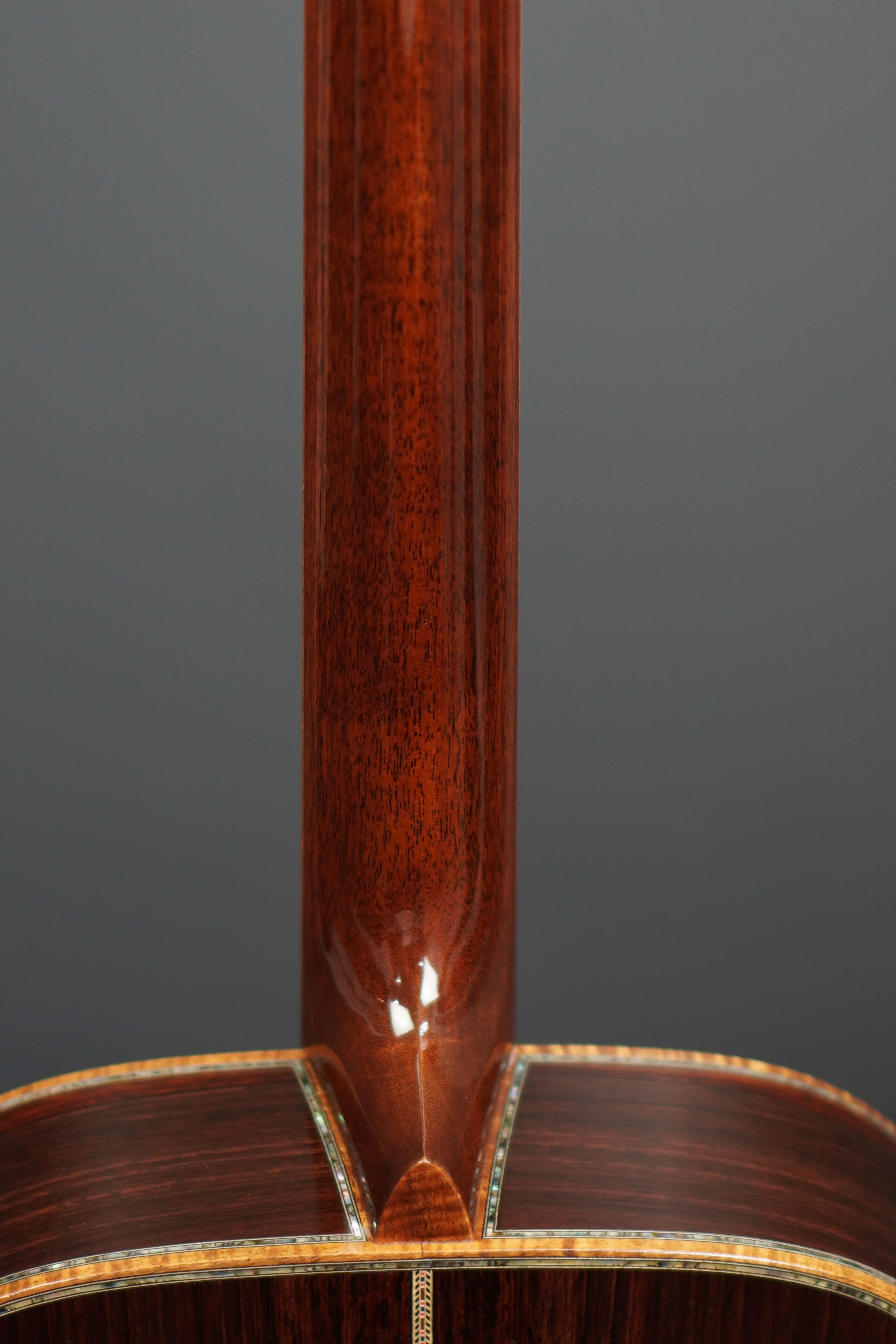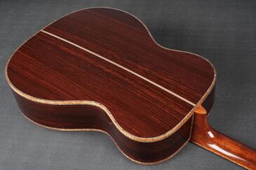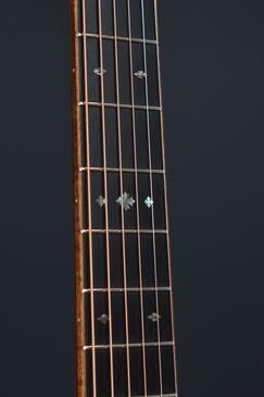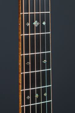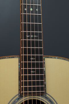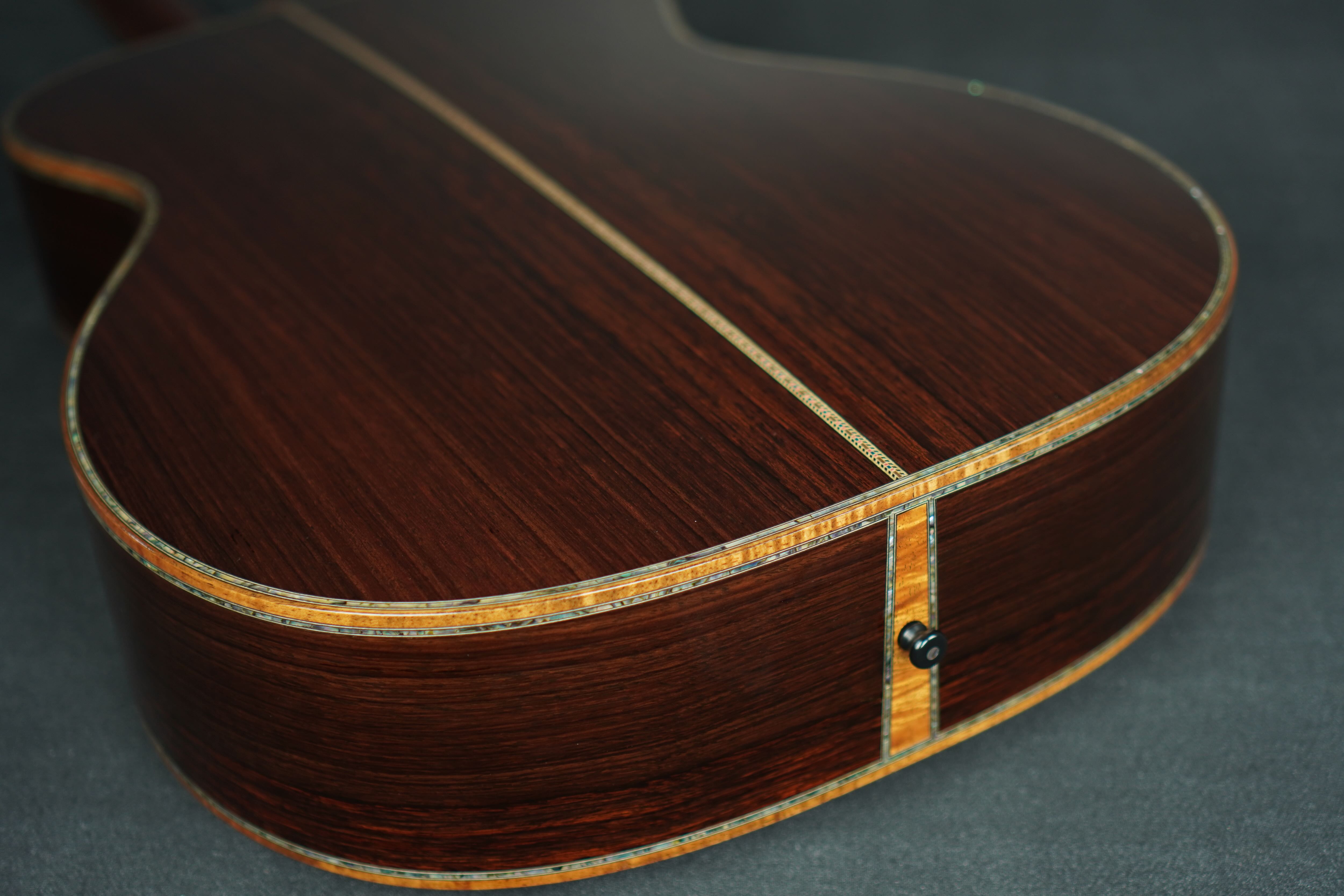 サイド&バックのイーストインディアンローズウッドも、赤黒く陰影の深い木肌が印象的で、木目の流れも程よく暴れながらも絶妙に通りの良い、眺めるだけでもため息が出そうなプレミアムグレードの良材がセレクトされており、そこにはトップと同様にバインディングにはフレイム杢のコア材が用いられ、45グレードらしくアヴァロンのトリムとカラフルな寄せ木細工のバックストリップという美しくもウッディな風合いの仕上がりです。